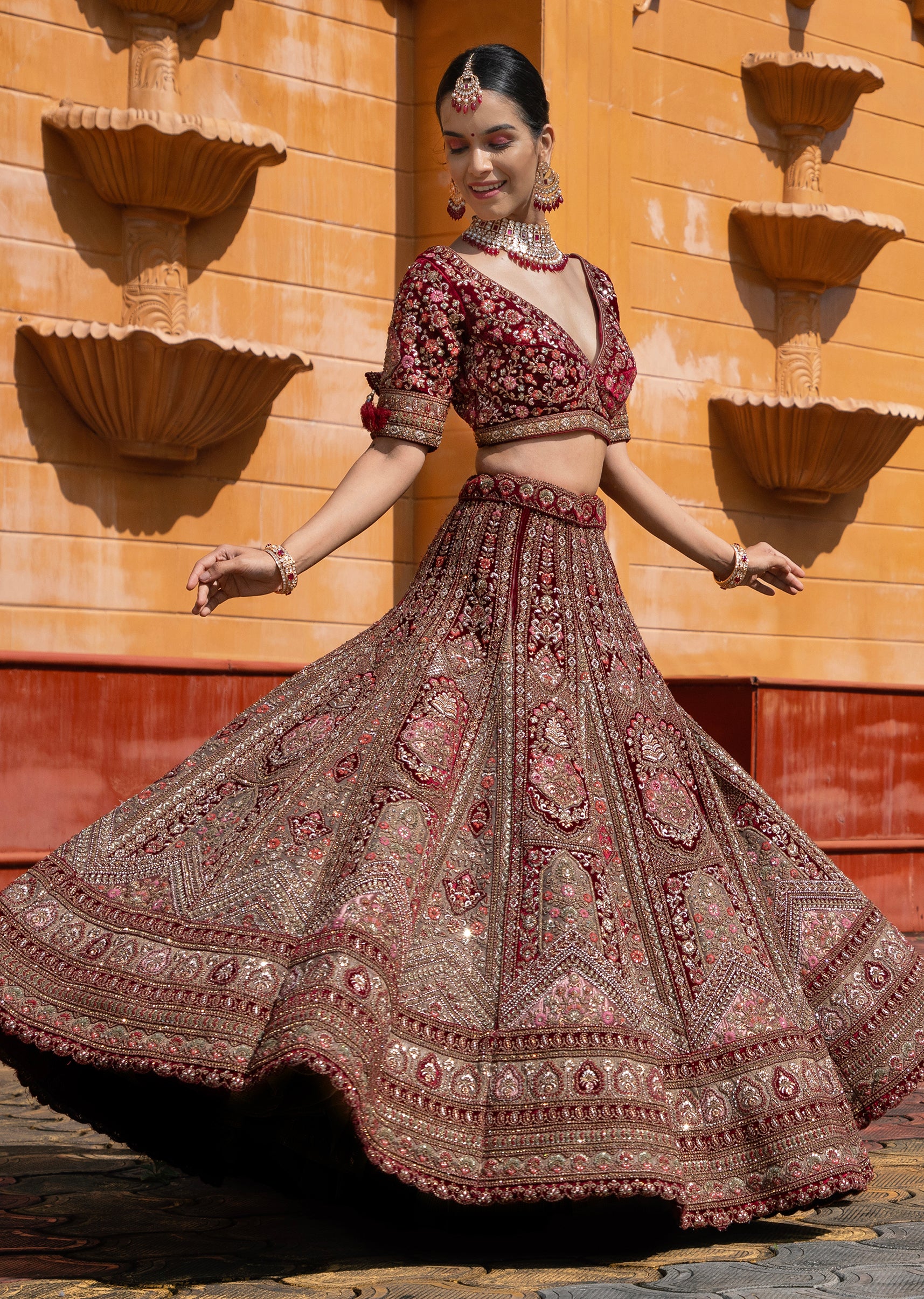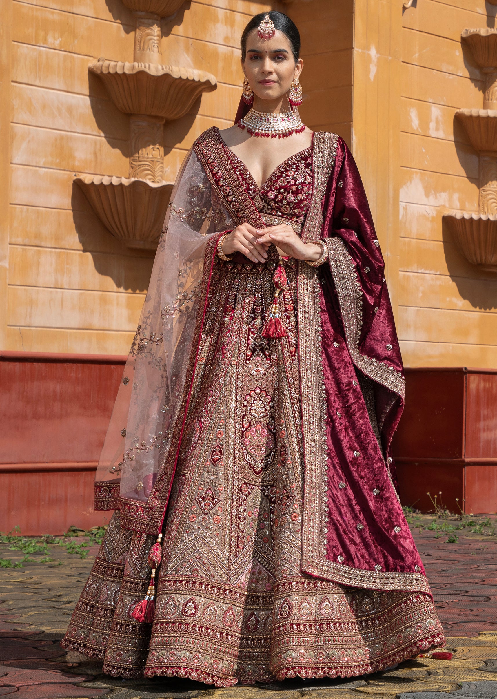 Channel timeless elegance with this maroon velvet choli adorned with antique tissue fabric patches, paired flawlessly with a luxurious velvet patch ghaghra. Complete the regal ensemble with a delicate net dupatta featuring intricate detailing, and an additional velvet dupatta for added opulence.