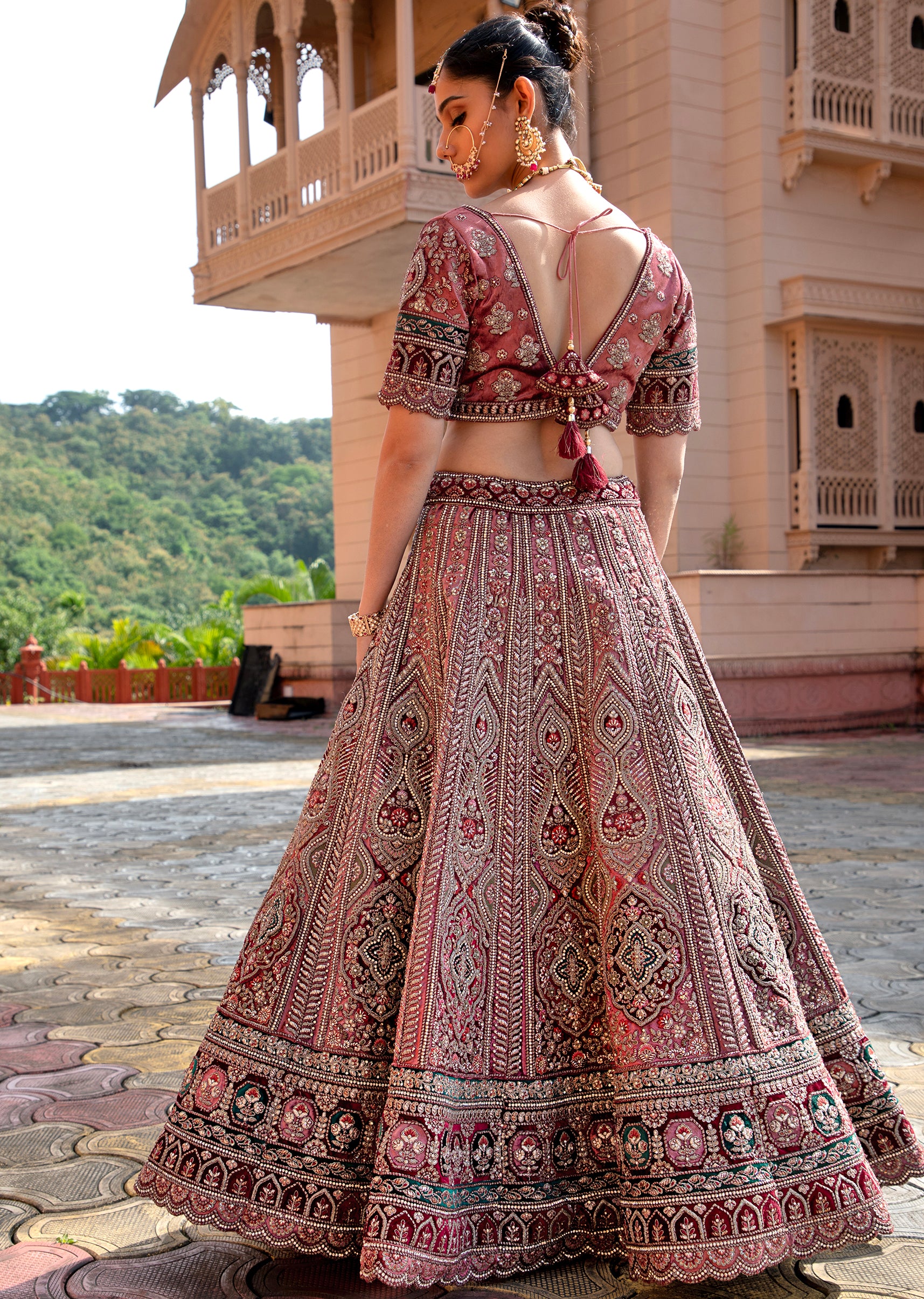 Radiate ethereal charm in this peach velvet choli paired flawlessly with a matching ghaghra skirt, complemented by a sheer net dupatta for an added touch of elegance. The ensemble exudes regal sophistication, perfect for those seeking timeless grace with a contemporary twist.