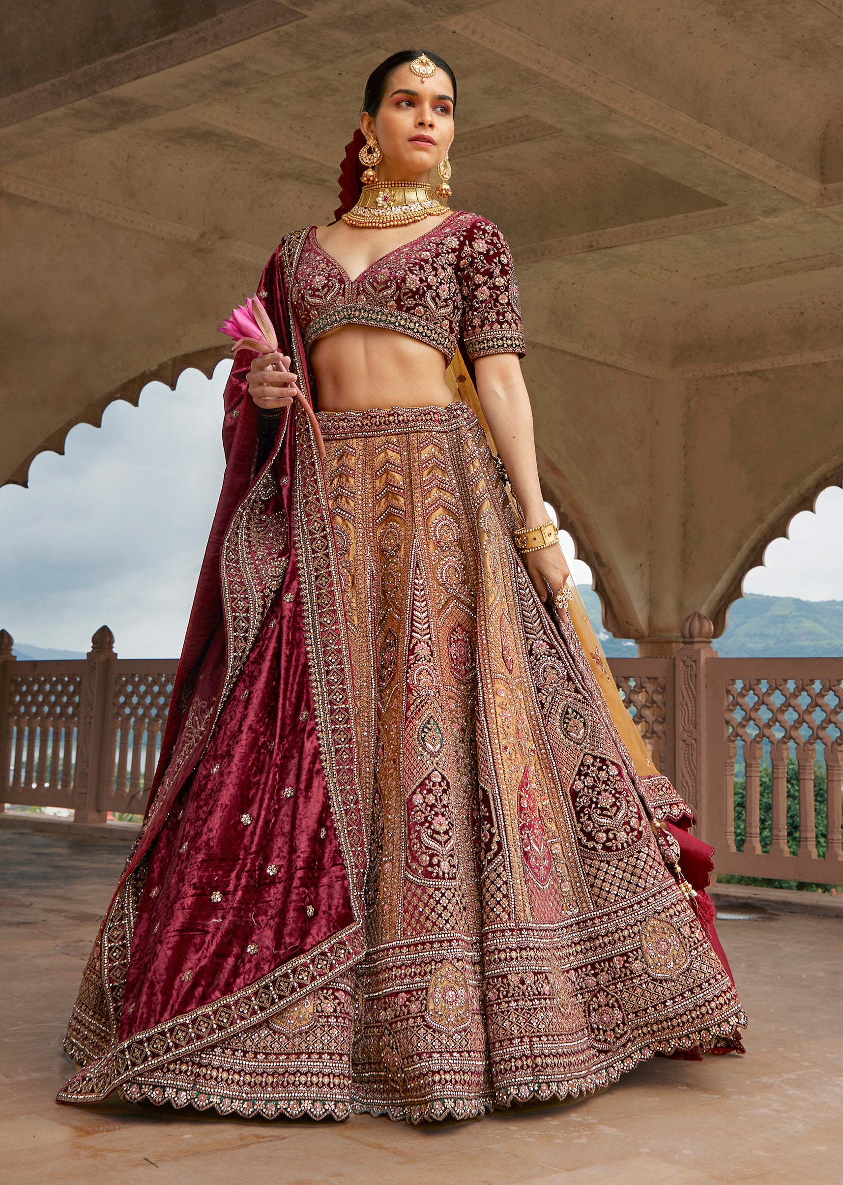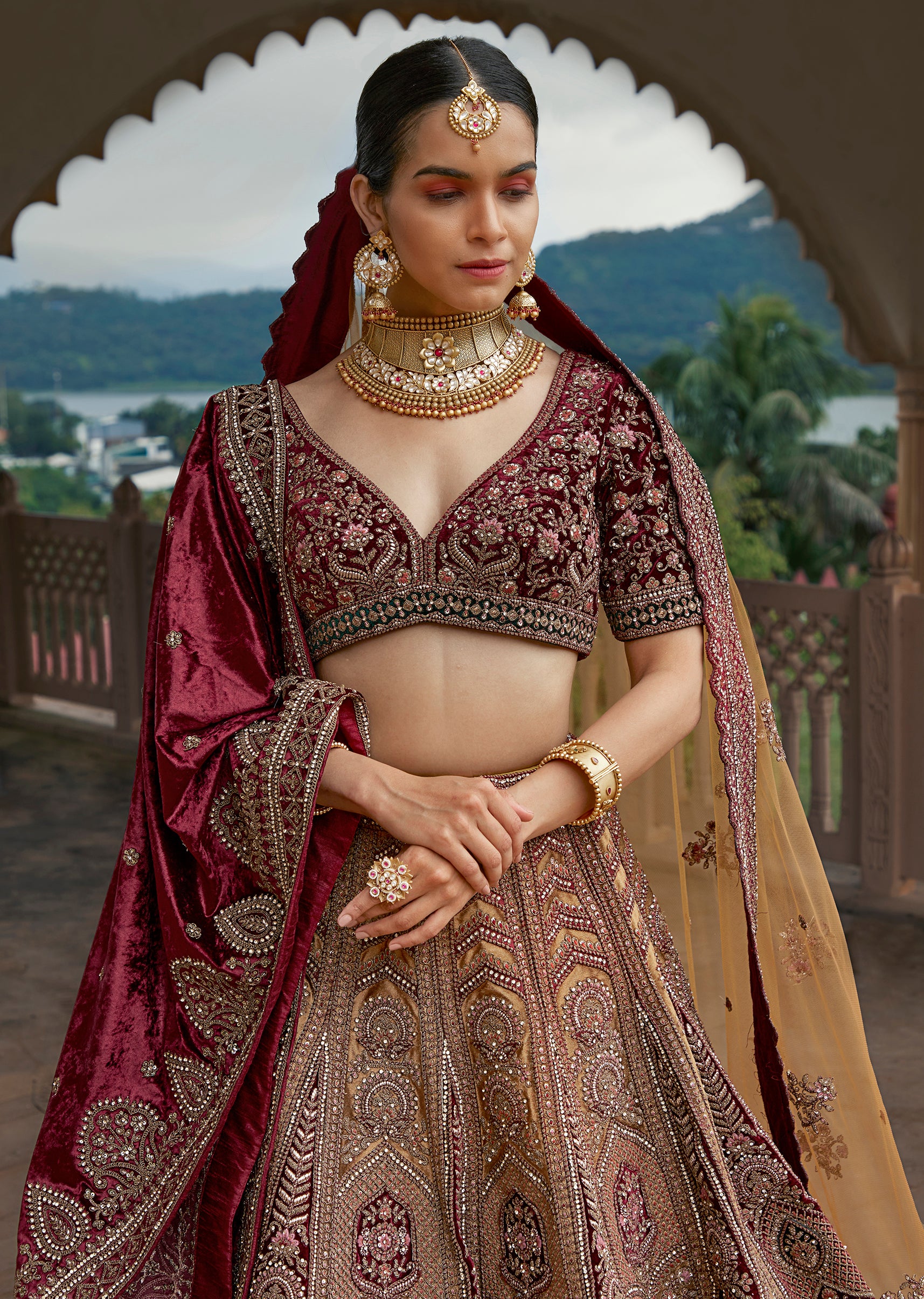 Exude regal elegance in this maroon velvet choli paired with a vibrant yellow ghaghra net dupatta, topped off with a luxurious velvet dupatta for added flair. The rich textures and striking color contrast make this ensemble a timeless statement of sophistication.