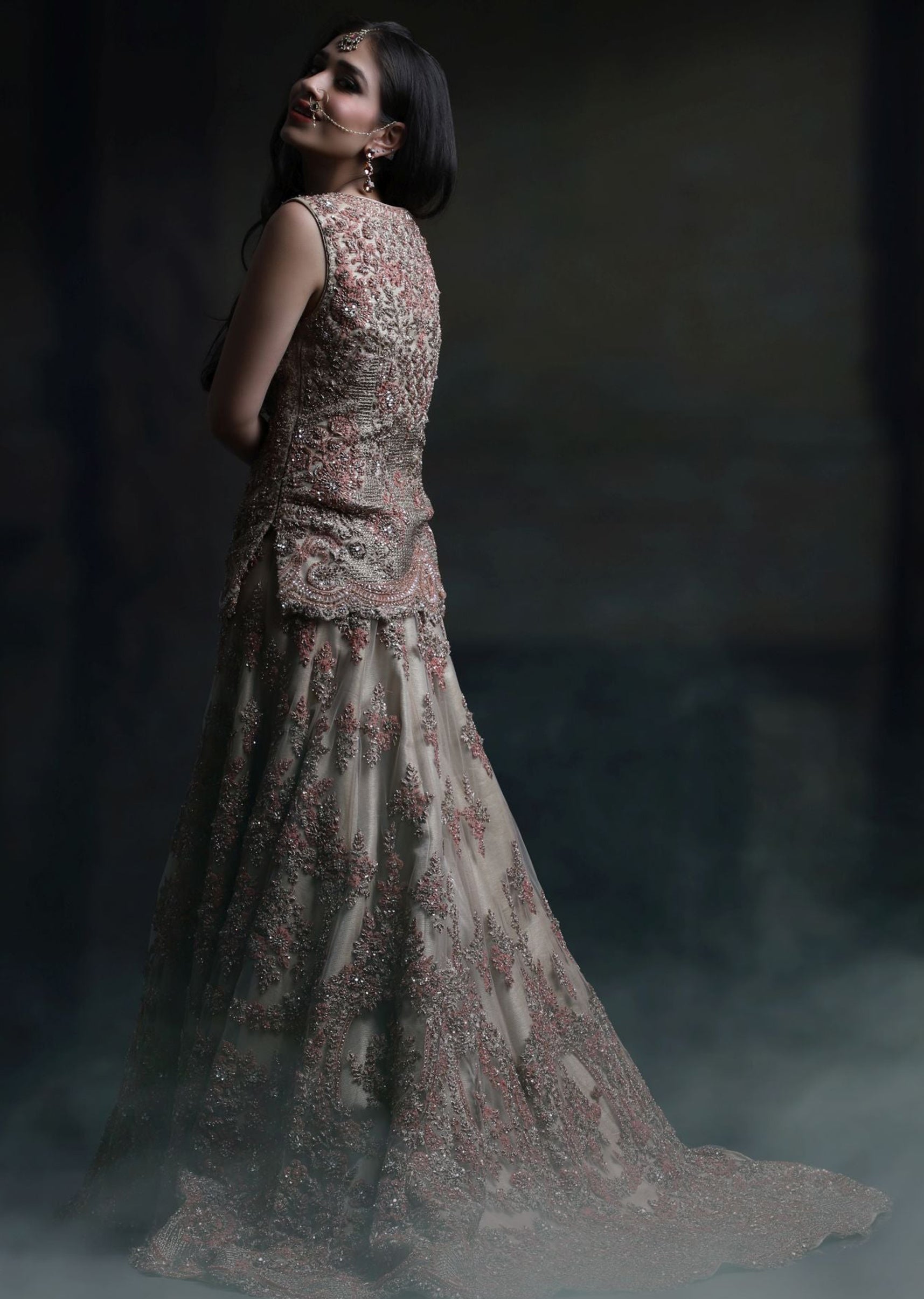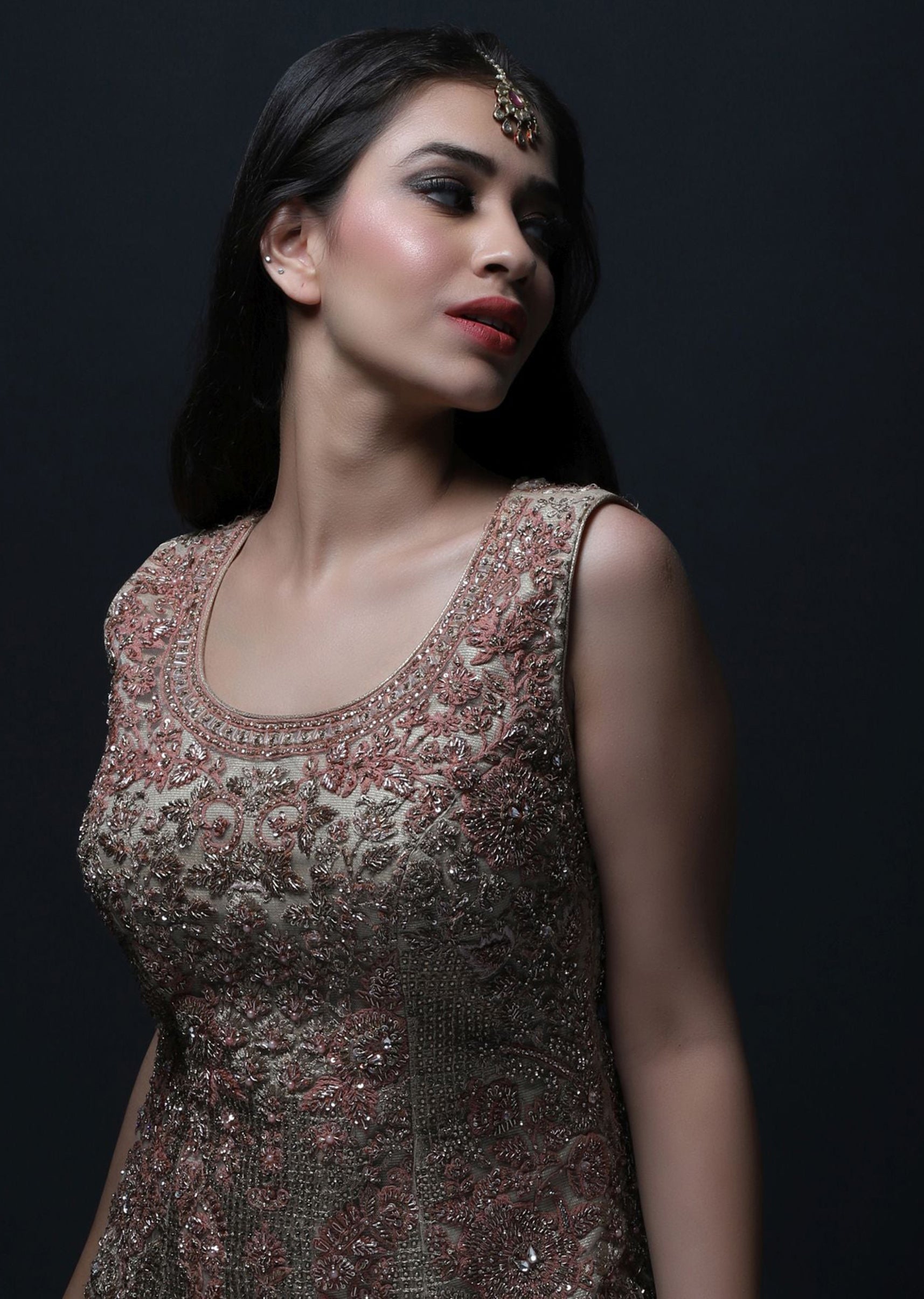 Beige shimmer net short tunic and lehenga lined with silk embroidered in antique gold and blush pink floral zardozi, with a blush pink floral self zardozi embroidered net dupatta.