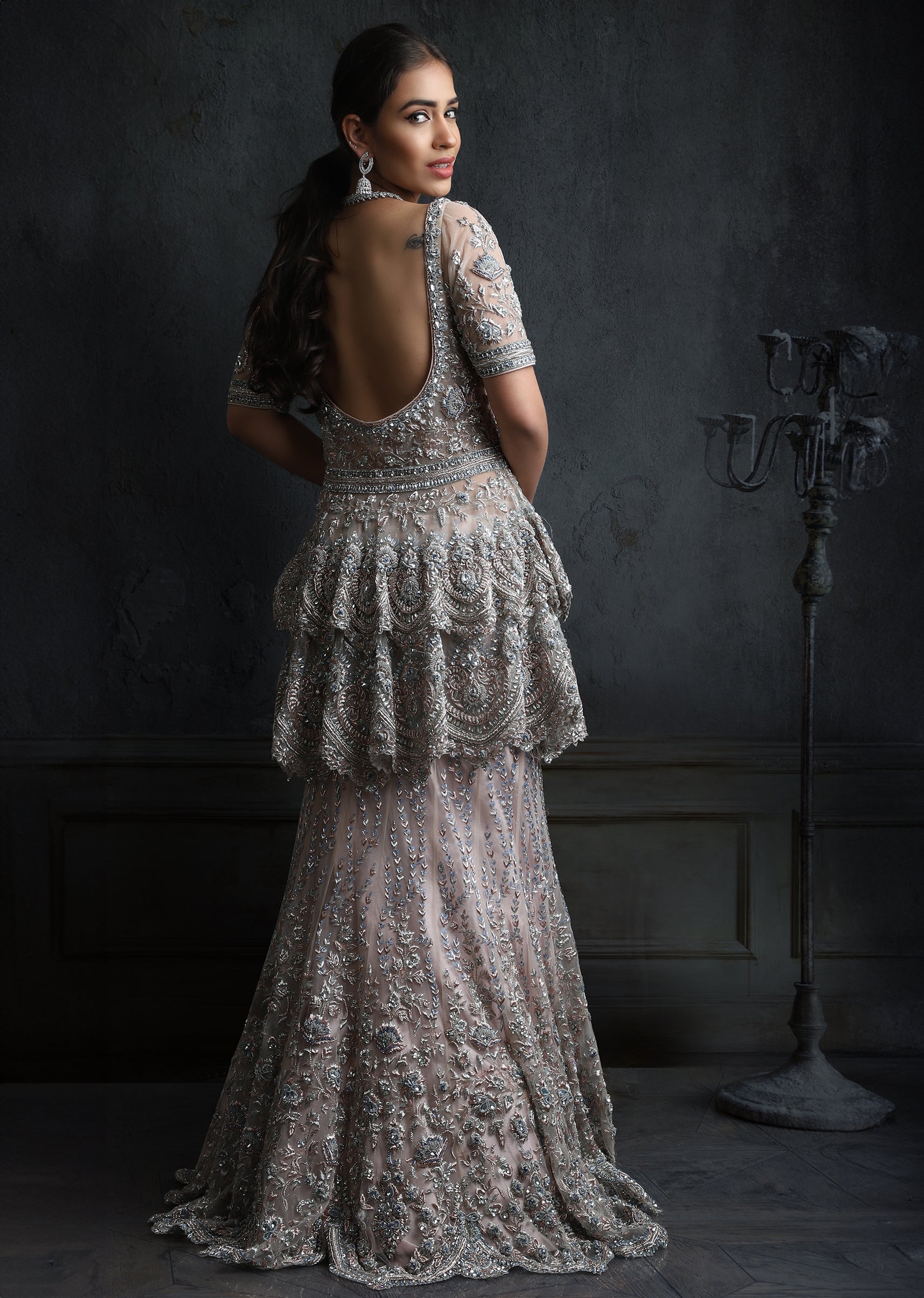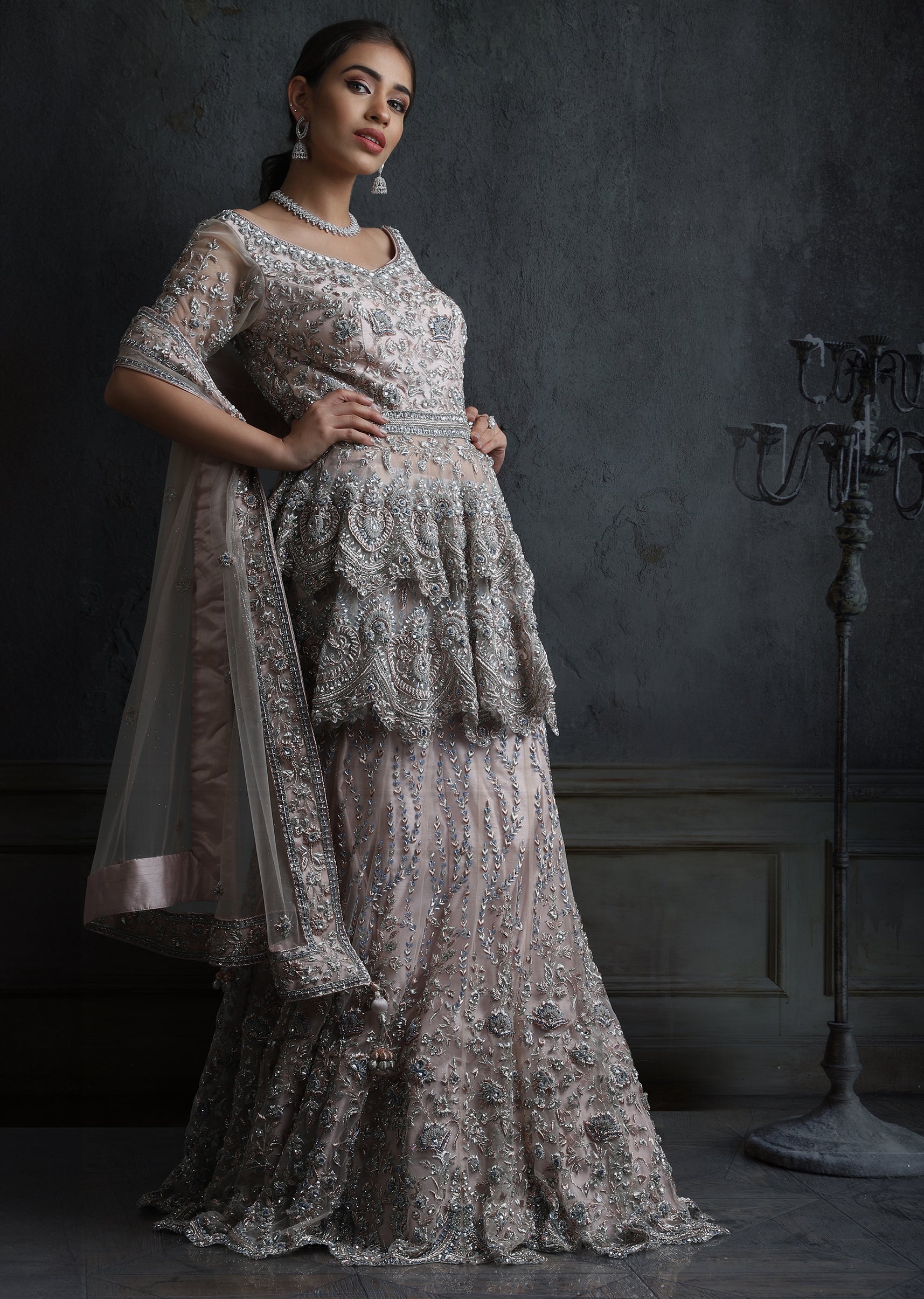 Blush net layered peplum style top kurta and lehenga with scalloped hem embroidered with floral garden inspired motifs in mettalic zardozi, resham and crystals; paired with a bordered blush net dupatta.