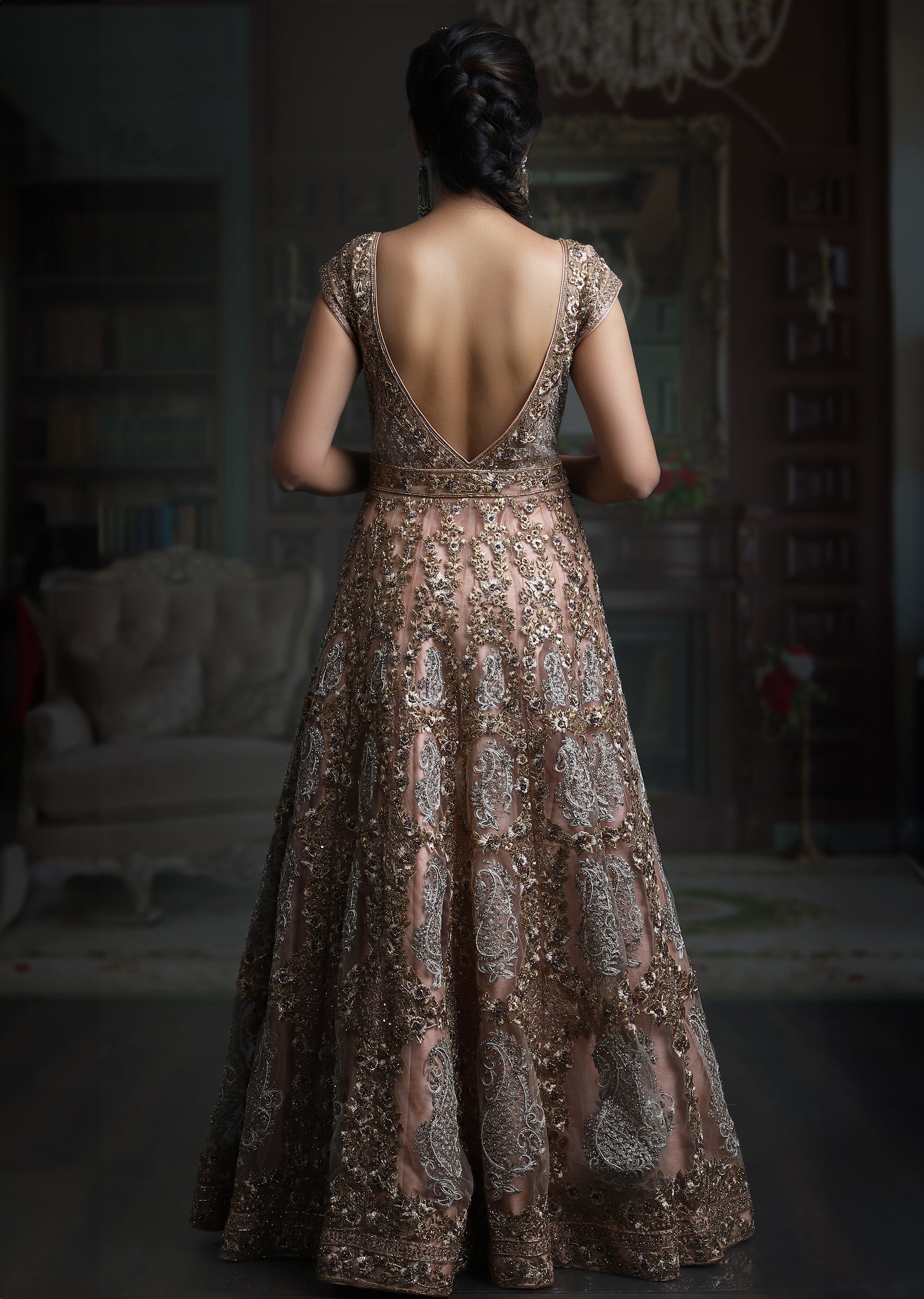 Peach blush net front open anarkali all over embroidered in floral paisley motifs in gold zardozi, paired with a blush peach silk lehenga skirt and blush net dupatta.