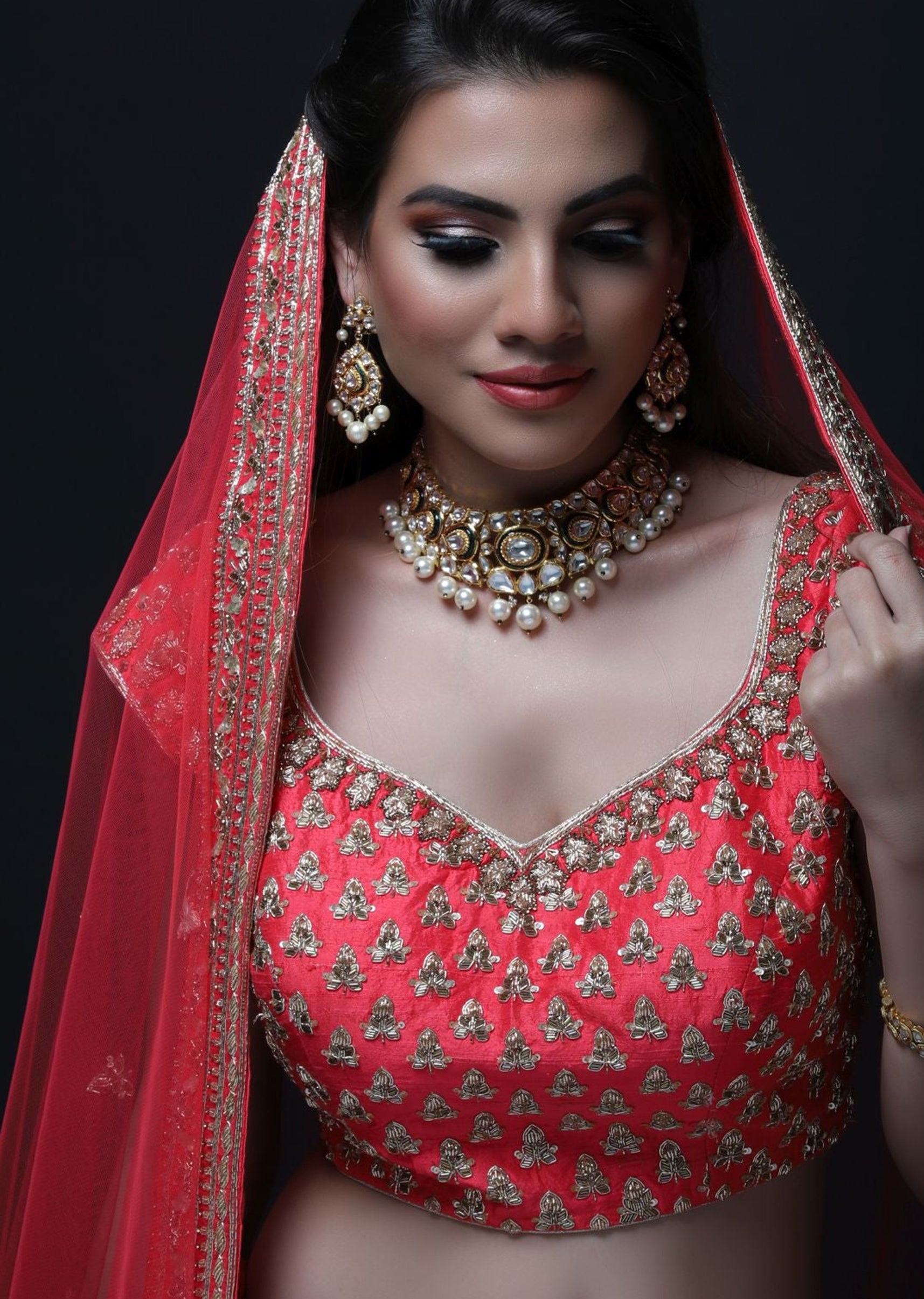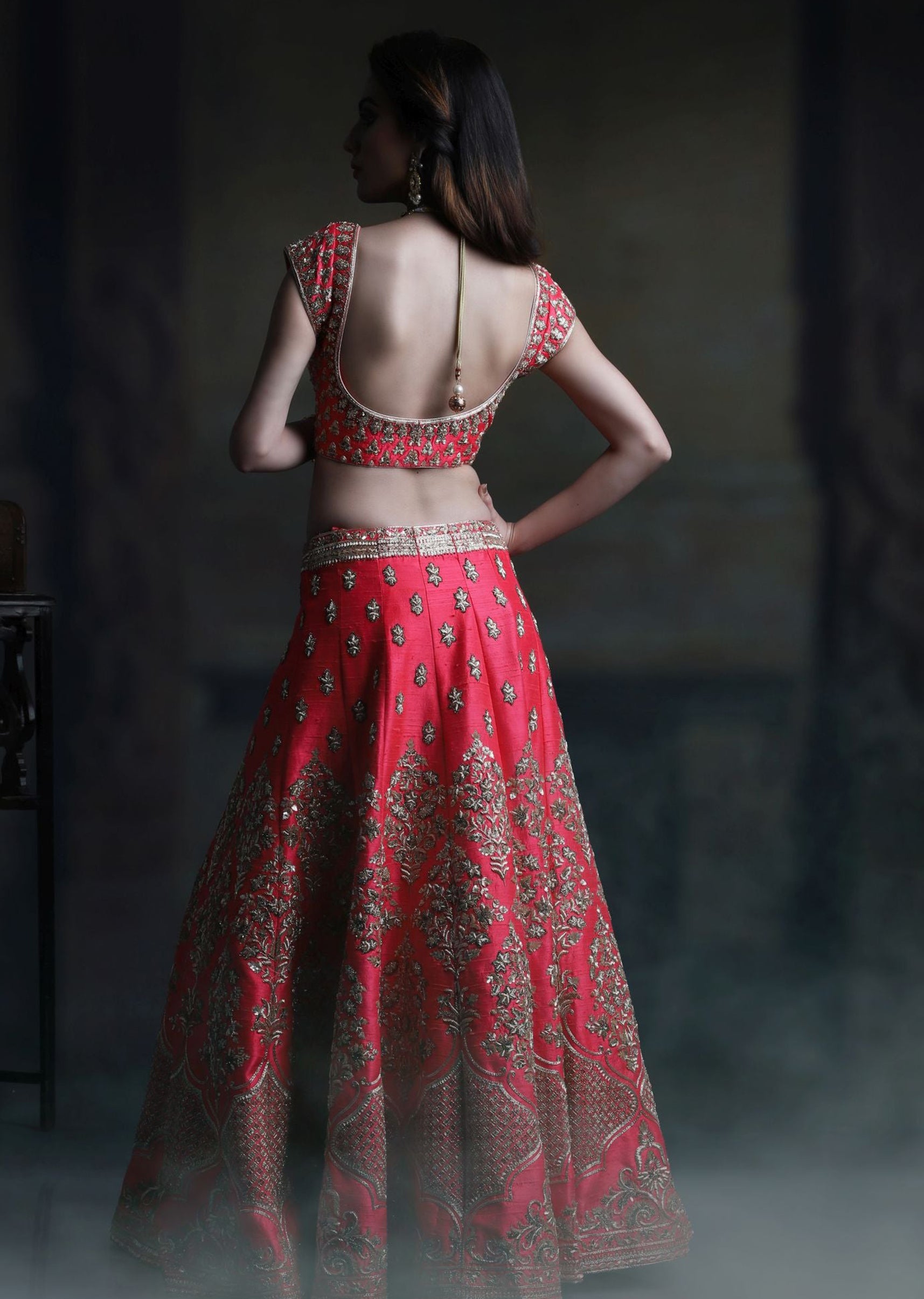 Hot pink silk lehenga choli with jaal floral designed embroidery in antique gold zardozi paired with a butti embroidered pink net dupatta.