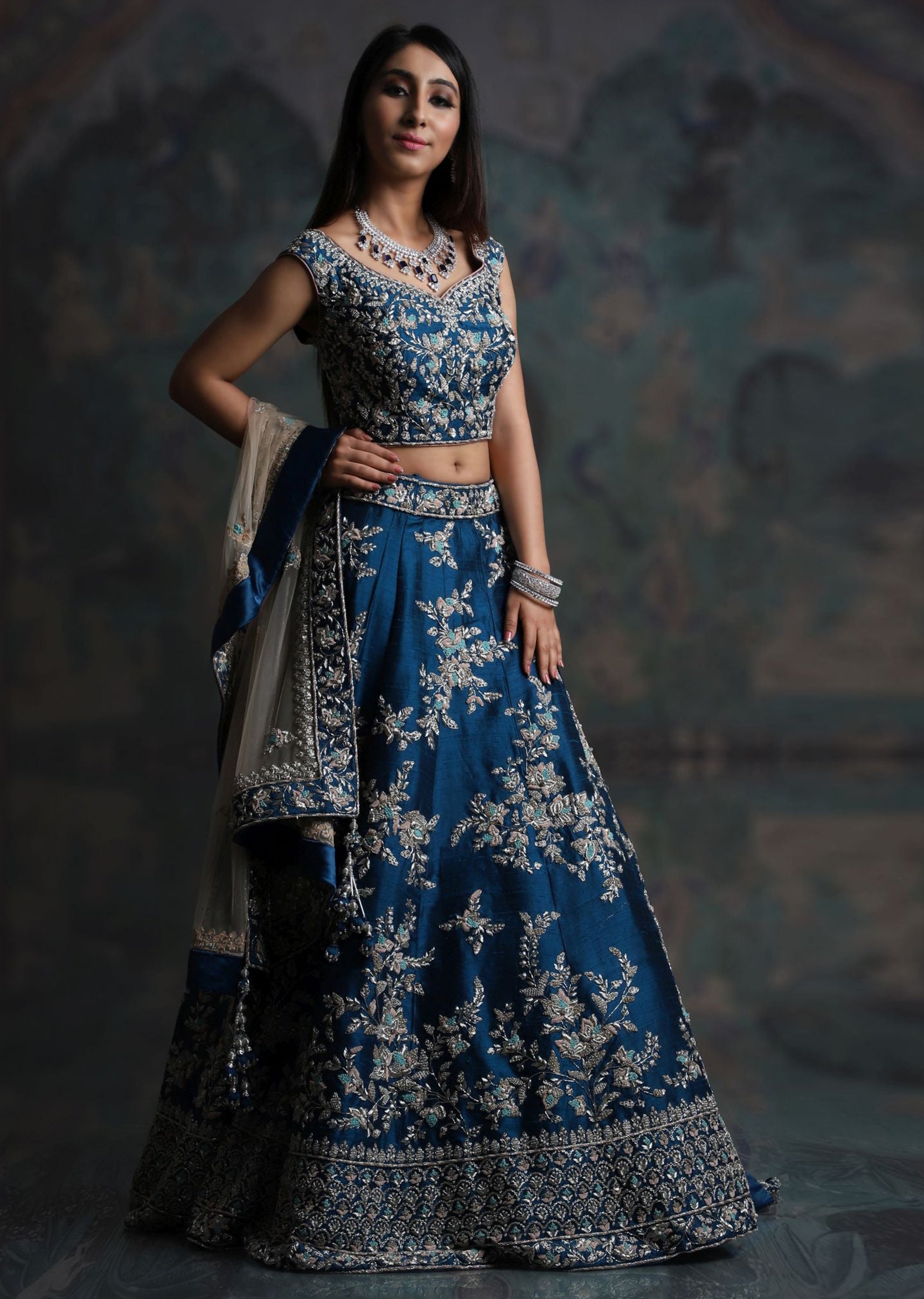 Teal blue silk lehenga choli with all over renaissance floral motifs in grey silver antique zardozi embroidery; paired with a grey bordered dupatta.