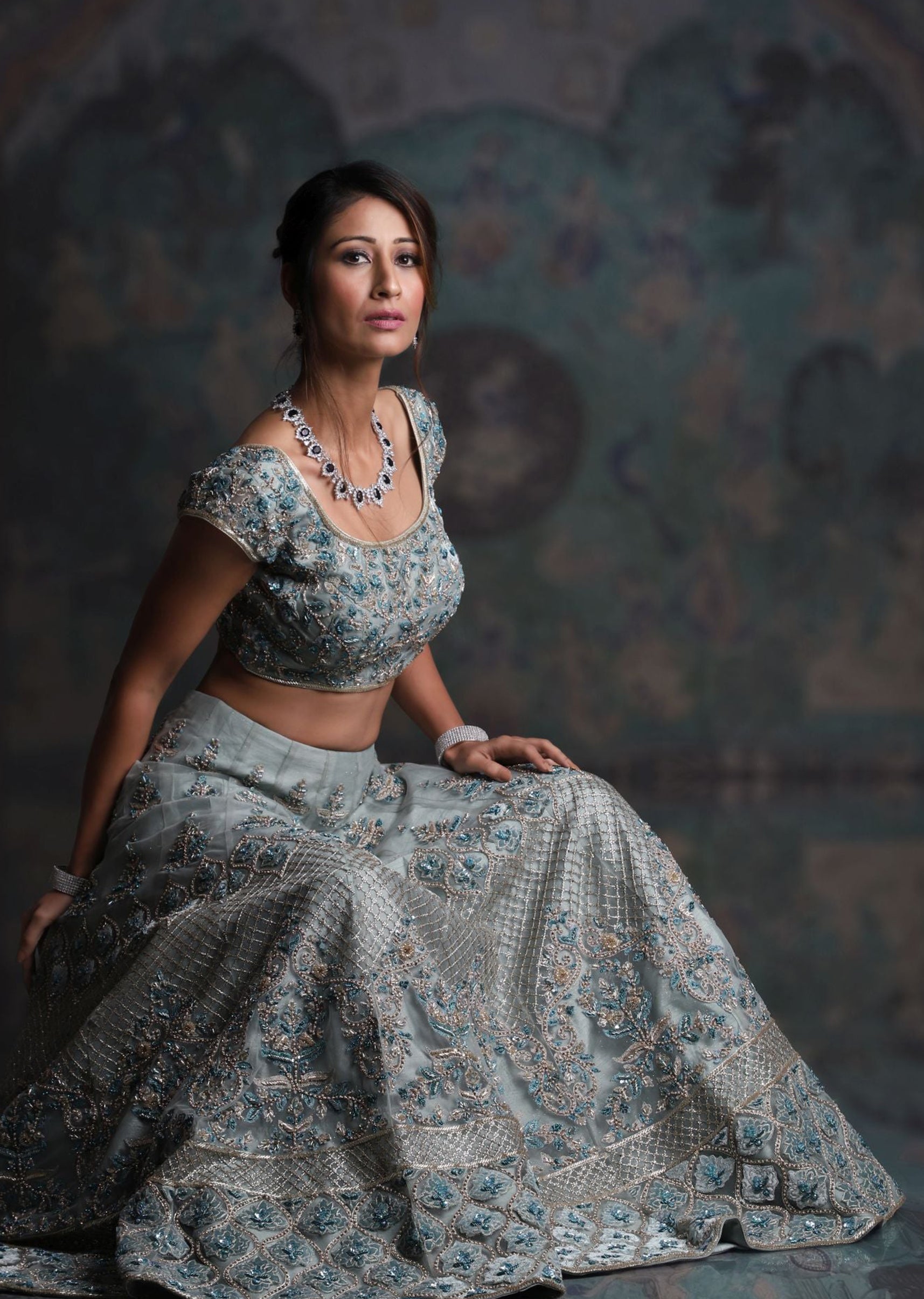 Dusky blue grey net lehenga choli dupatta embroidered with mughal jaal and lattice motifs in gold silver zardozi and resham.