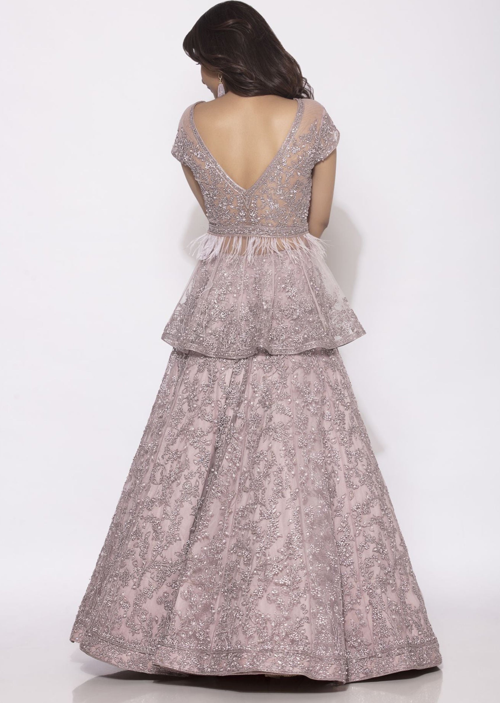 Pastel lilac peplum top choli and lehenga with all over embroidered dori, resham and sequins; and paired with a matching net dupatta
