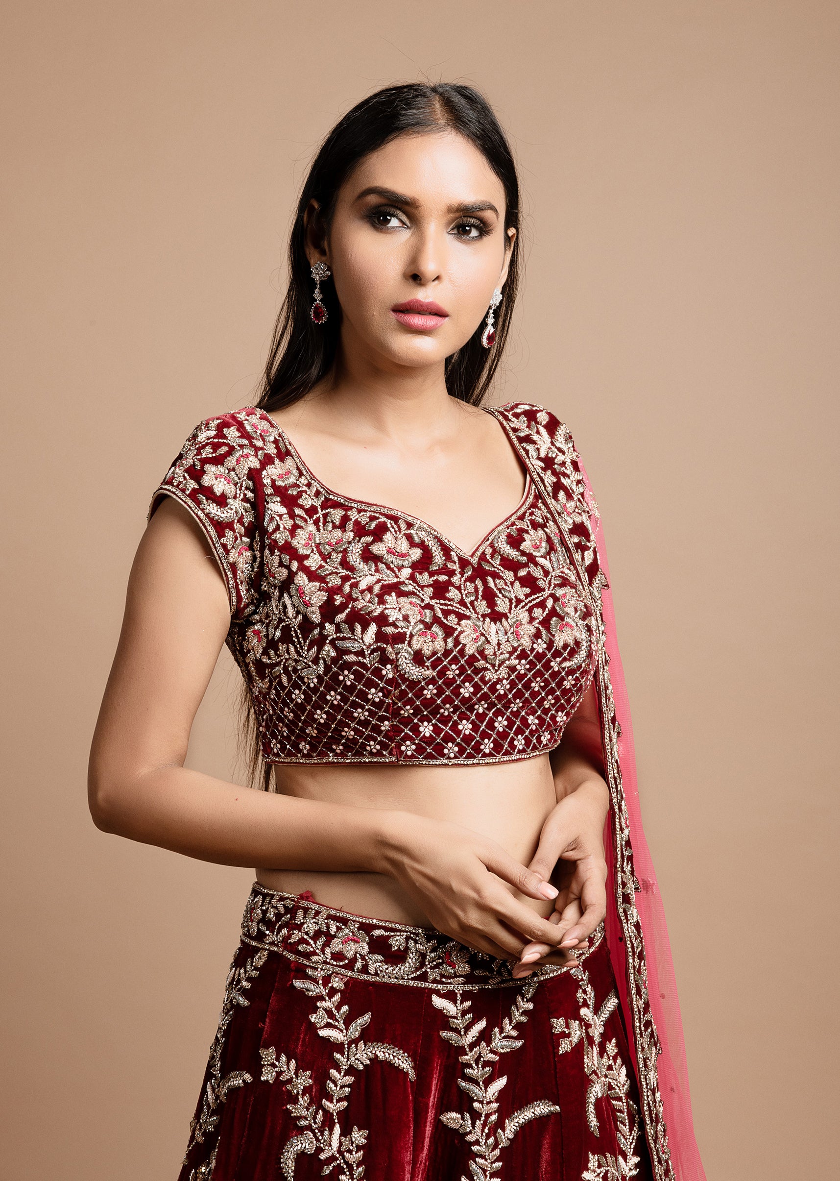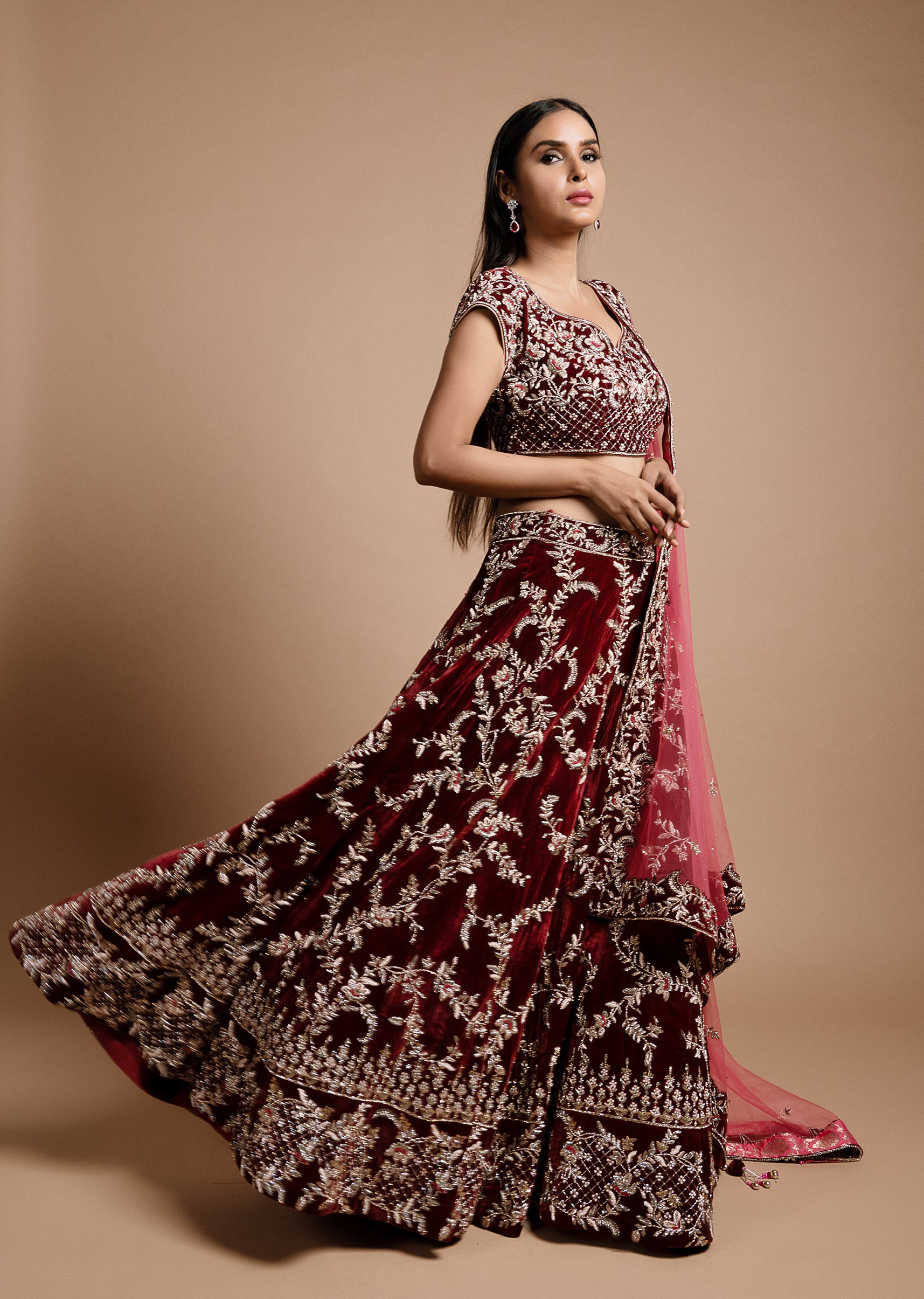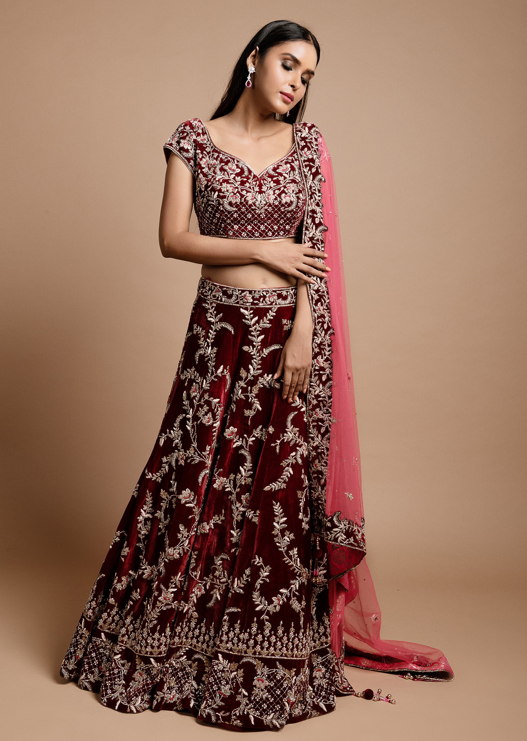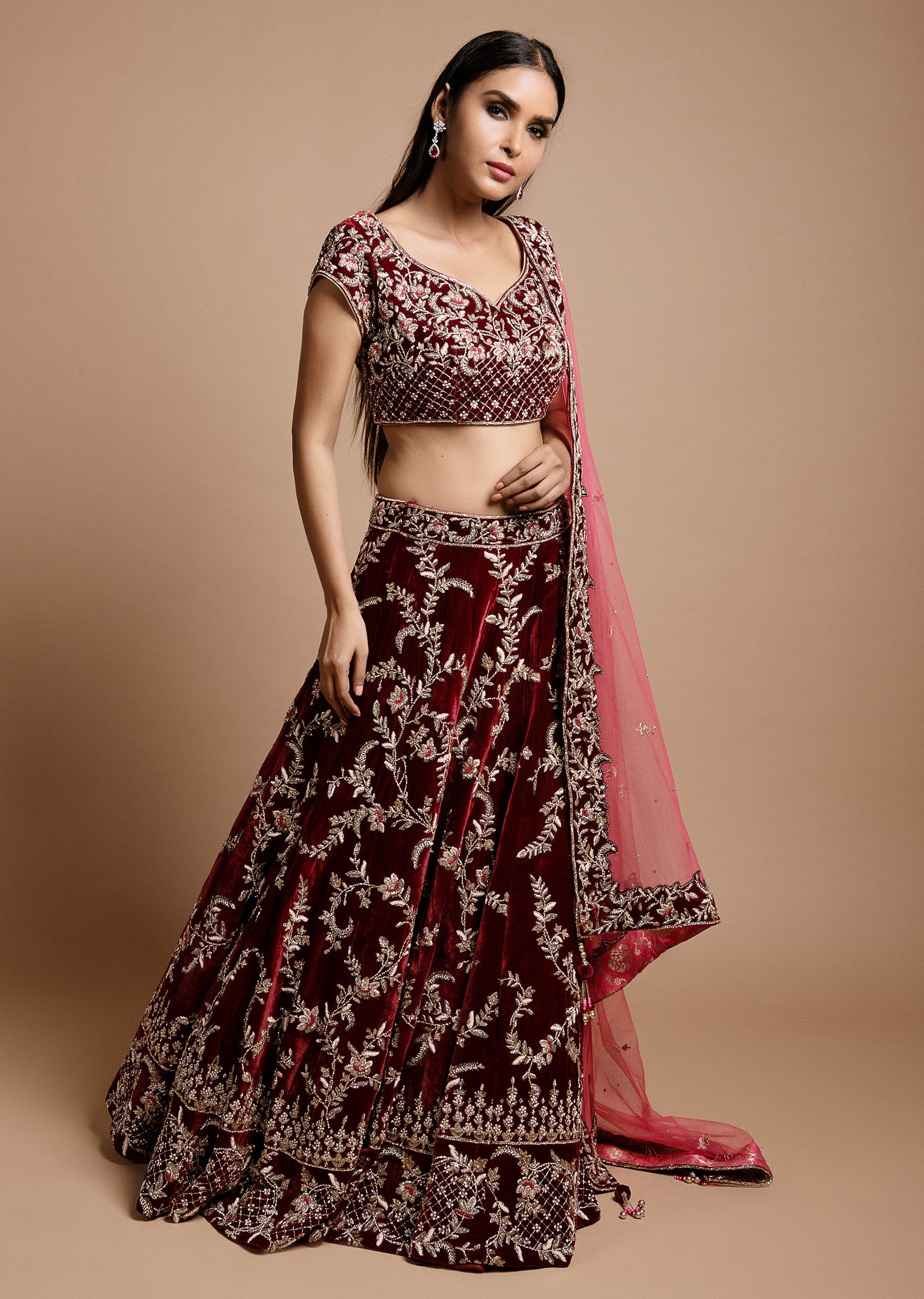 Wine maroon velvet lehenga choli with lattice mughal inspired motifs in zardozi and resham; paired with a magenta pink net embroidered dupatta.