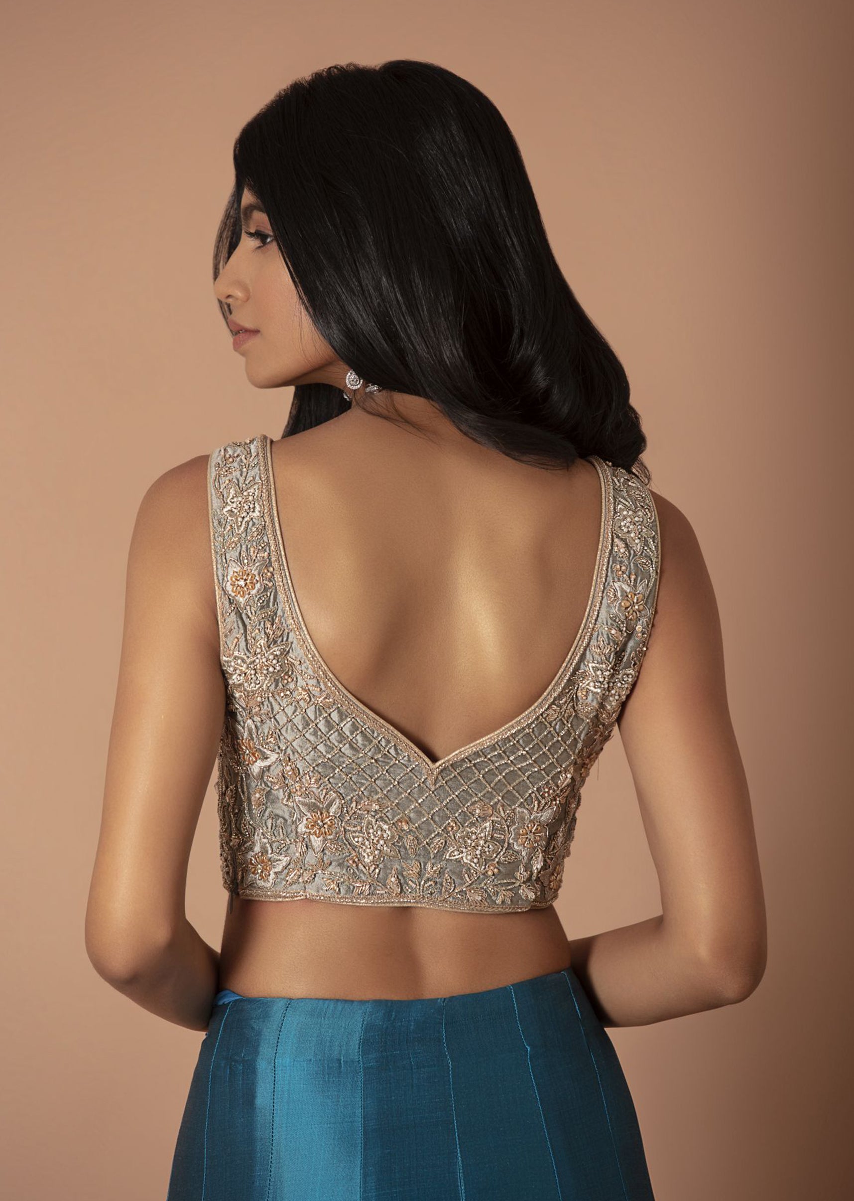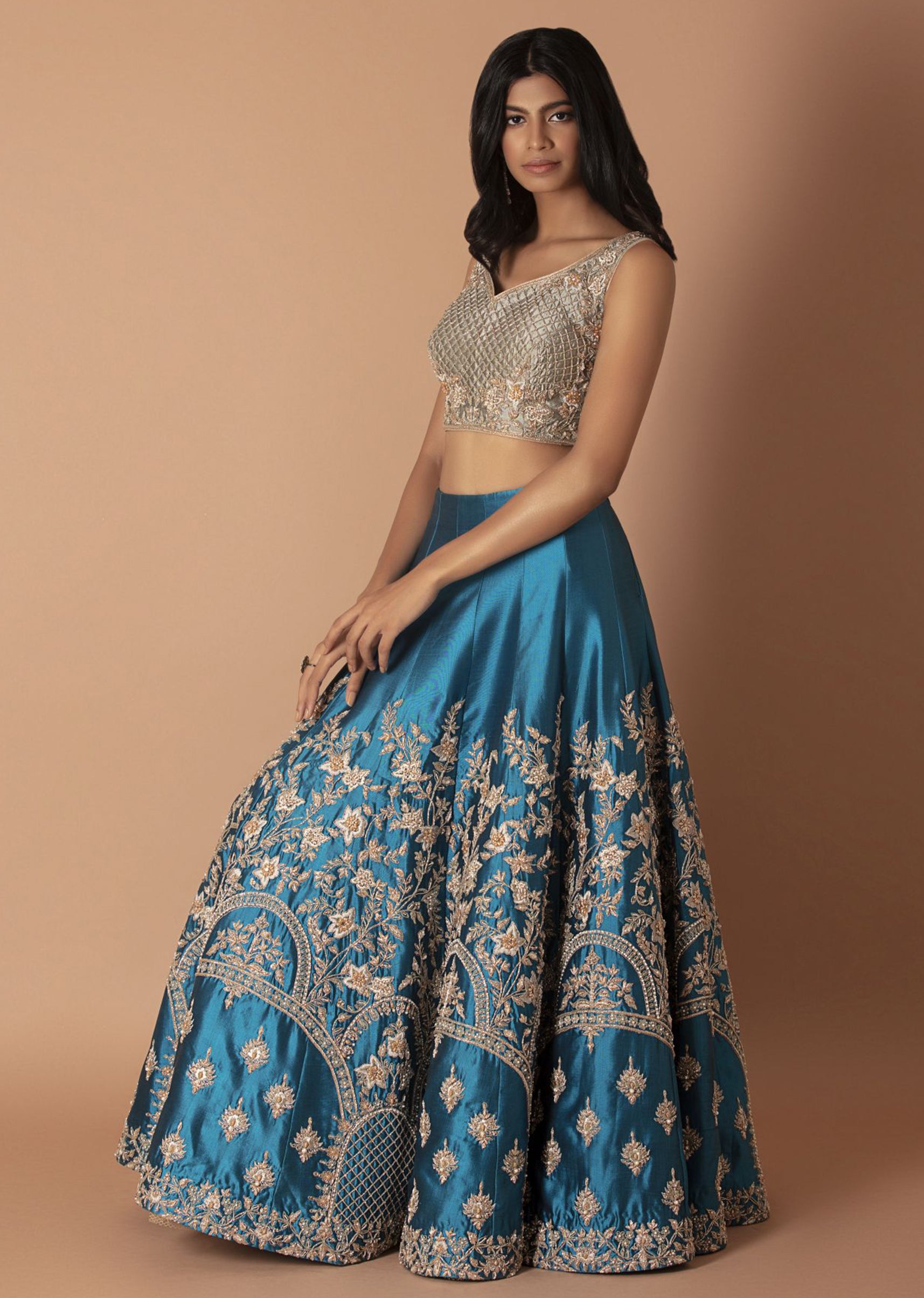 Teal blue silk lehenga embroidered with vintage arches and floral motifs in grey silver zardozi; paired with an embroidered grey silk choli and grey net dupatta.