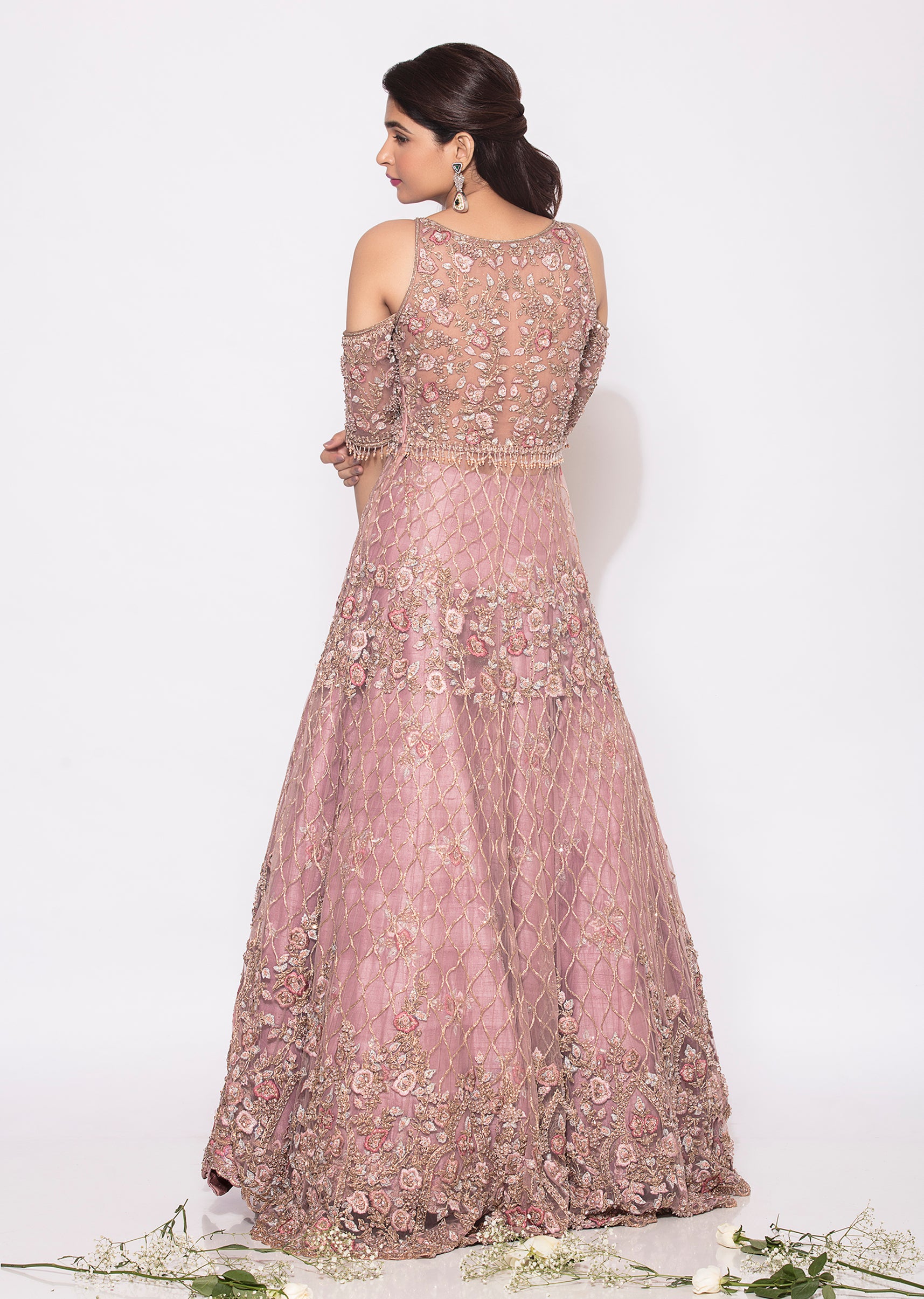 Dusk pink net long trail anarkali embroidered in resham, crystals and zardozi paired with a matching embroidered raw silk lehenga.