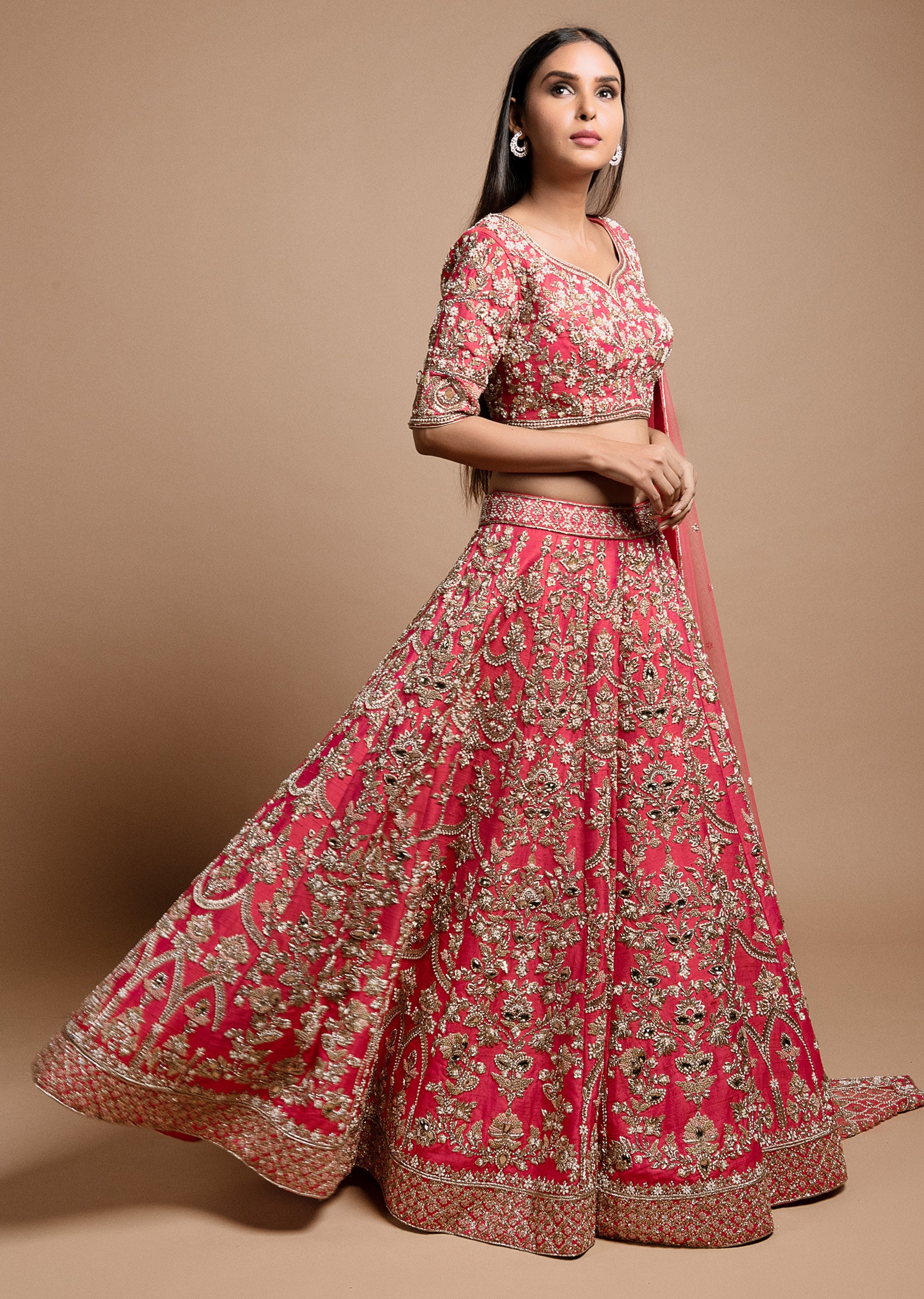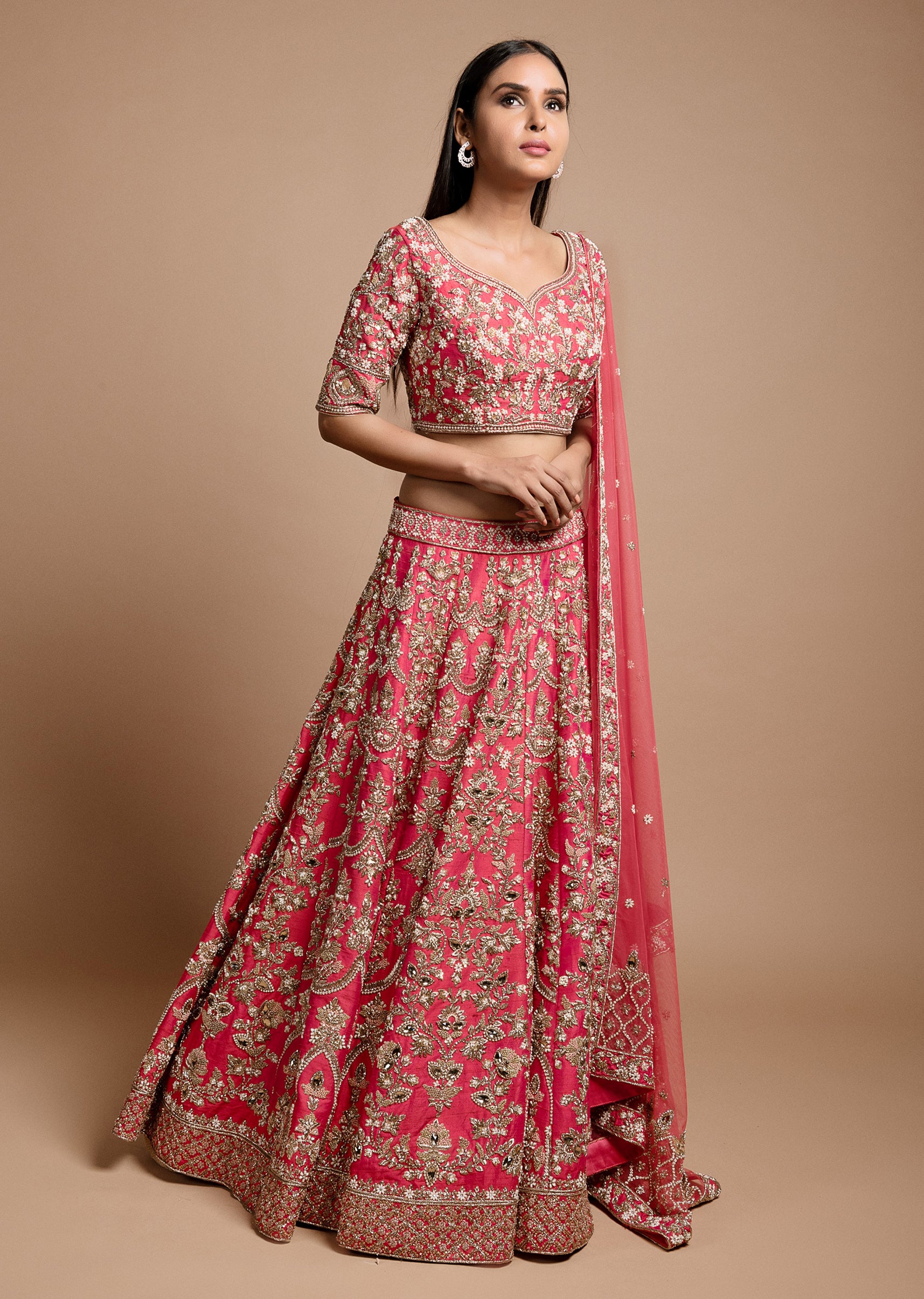 Deep rose pink raw silk lehenga choli with intricate mughal floral motifs embroidered in zardozi, crystals and pearls; paired with a matching pink net dupatta with an embroidered border and buttis.