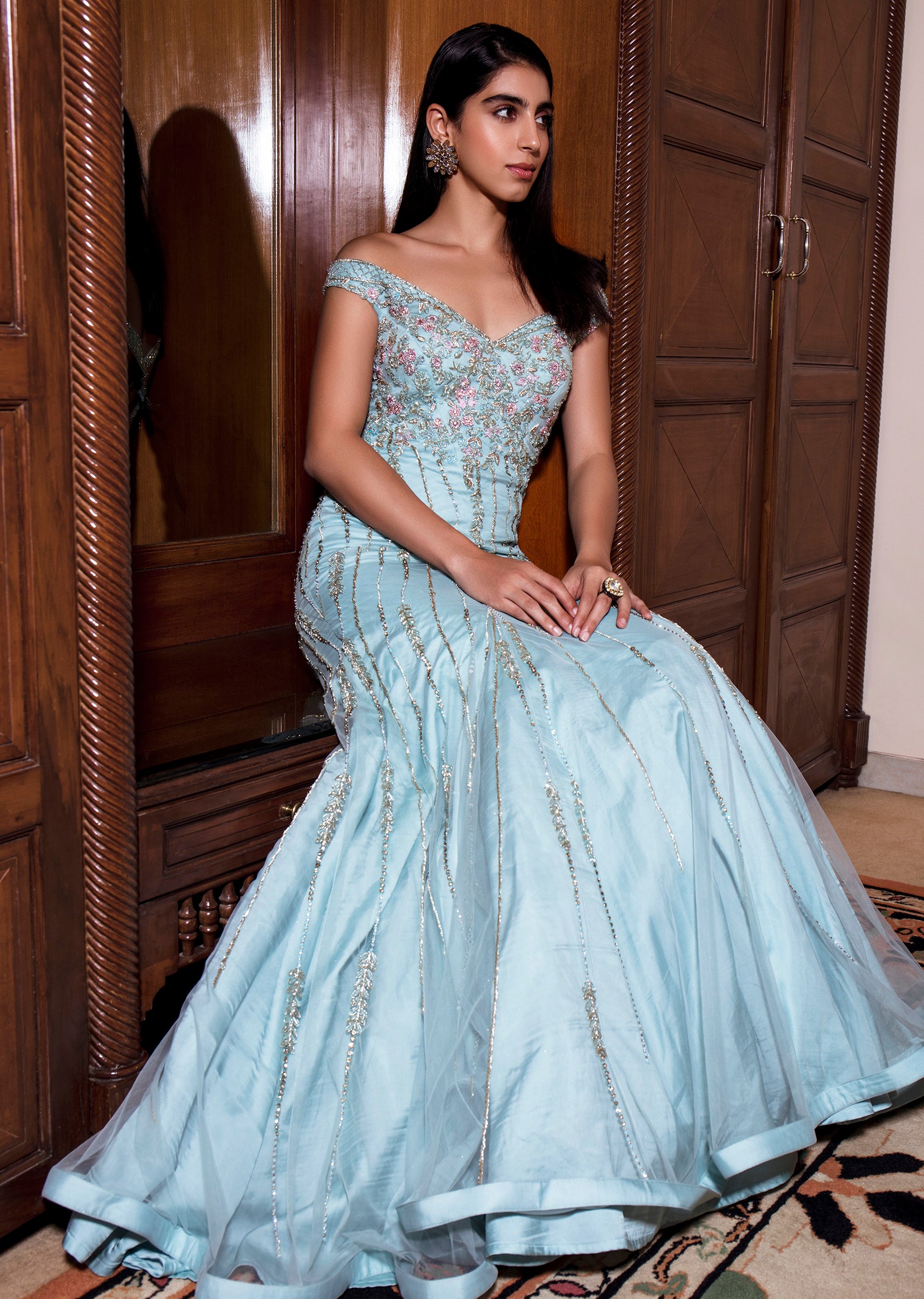 Aqua blue net off-shoulder flared gown with floral pink and gold zardozi embroidery