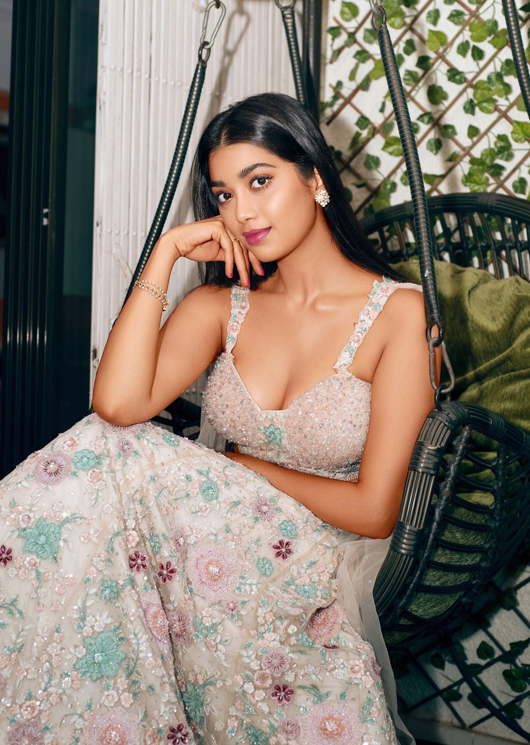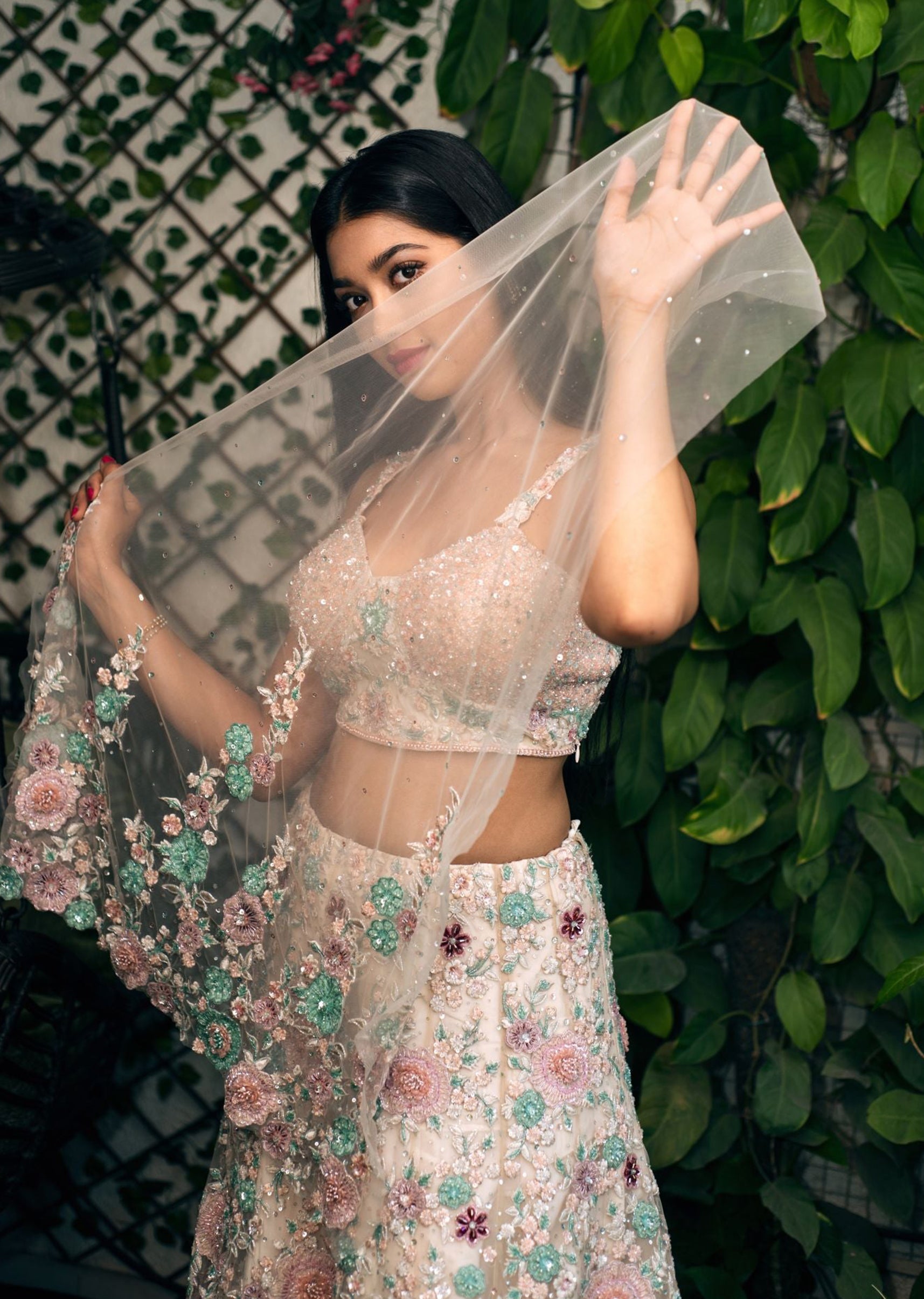 Off-white net lehenga set with floral multi-color resham, crystals, sequins and pearls embroidery, attached dupatta