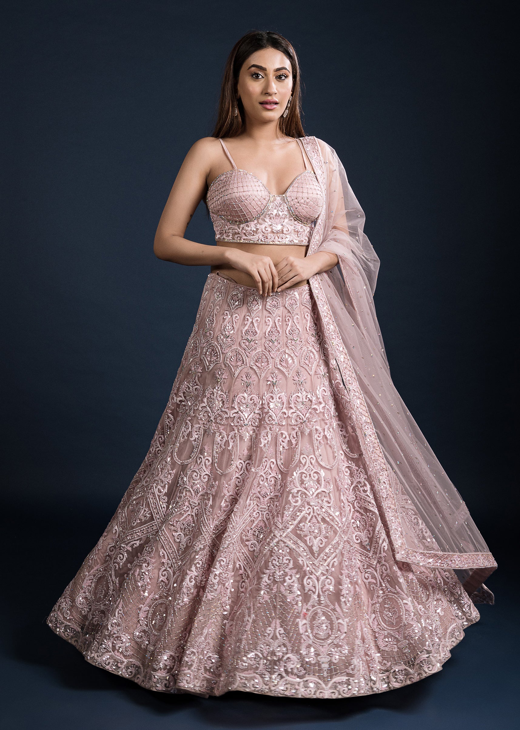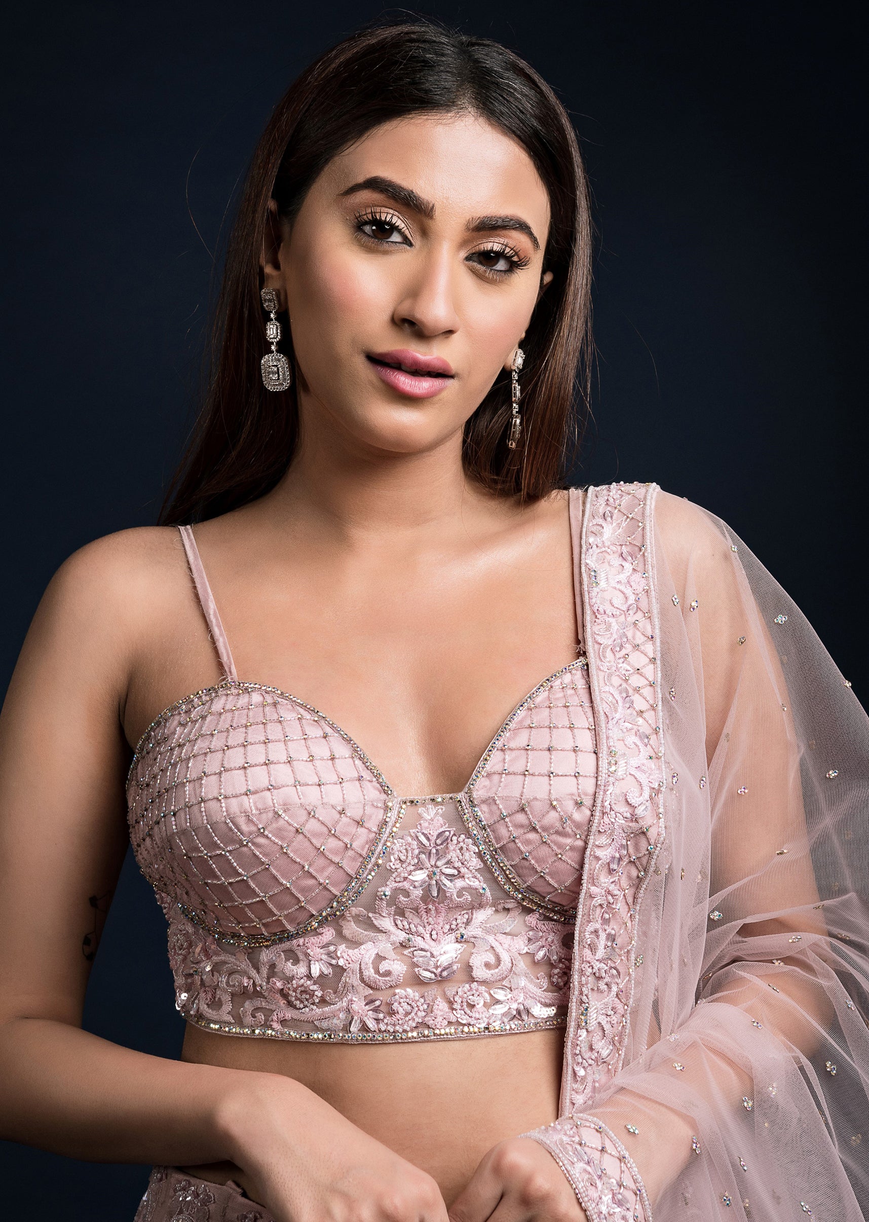 Blush pink net lehenga choli dupatta with floral art nouveau design in resham, sef zardozi, crystals and sequins embroidery.