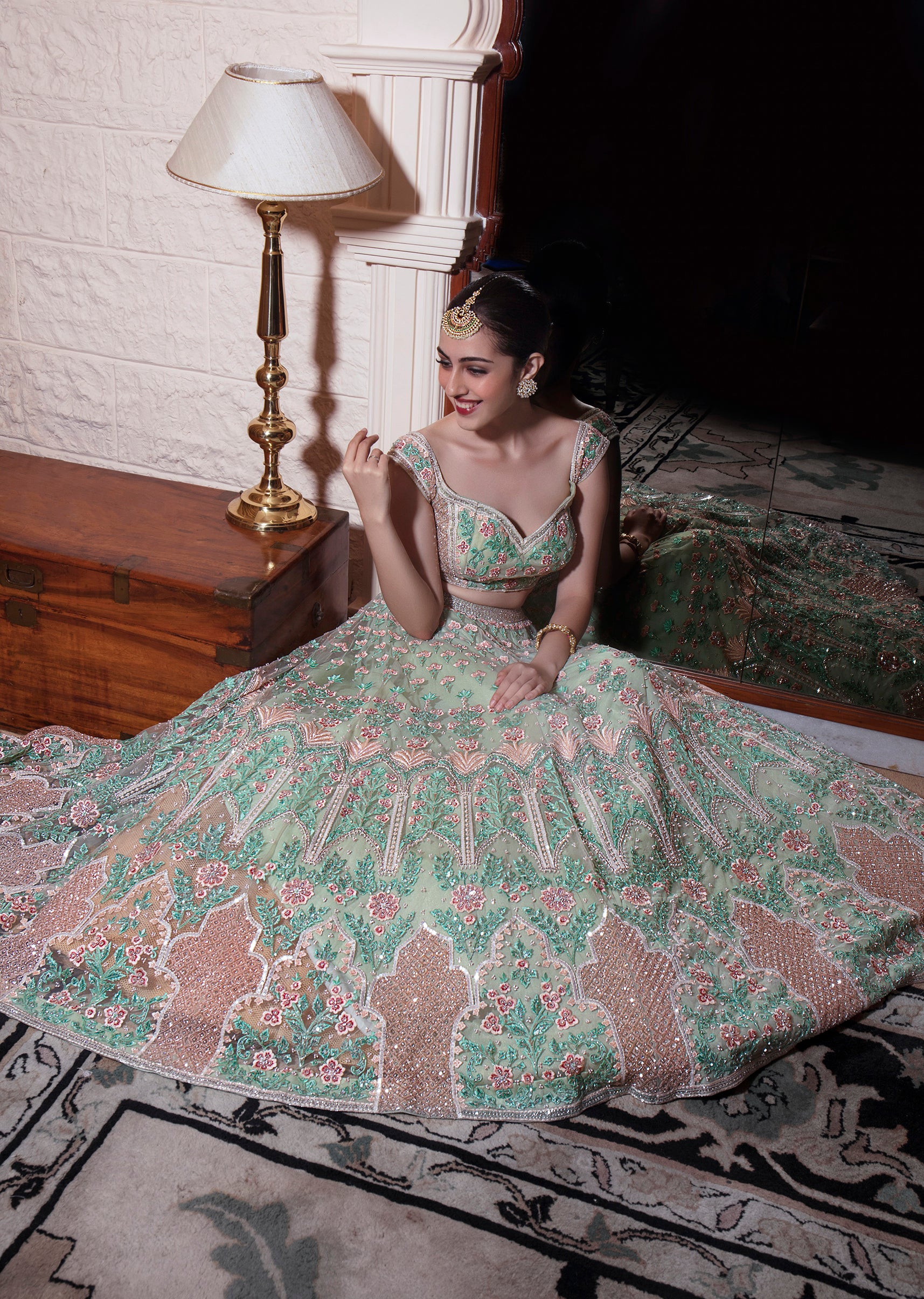 Mint green net lehenga set embroidered with mughal motifs in resham and zardozi
