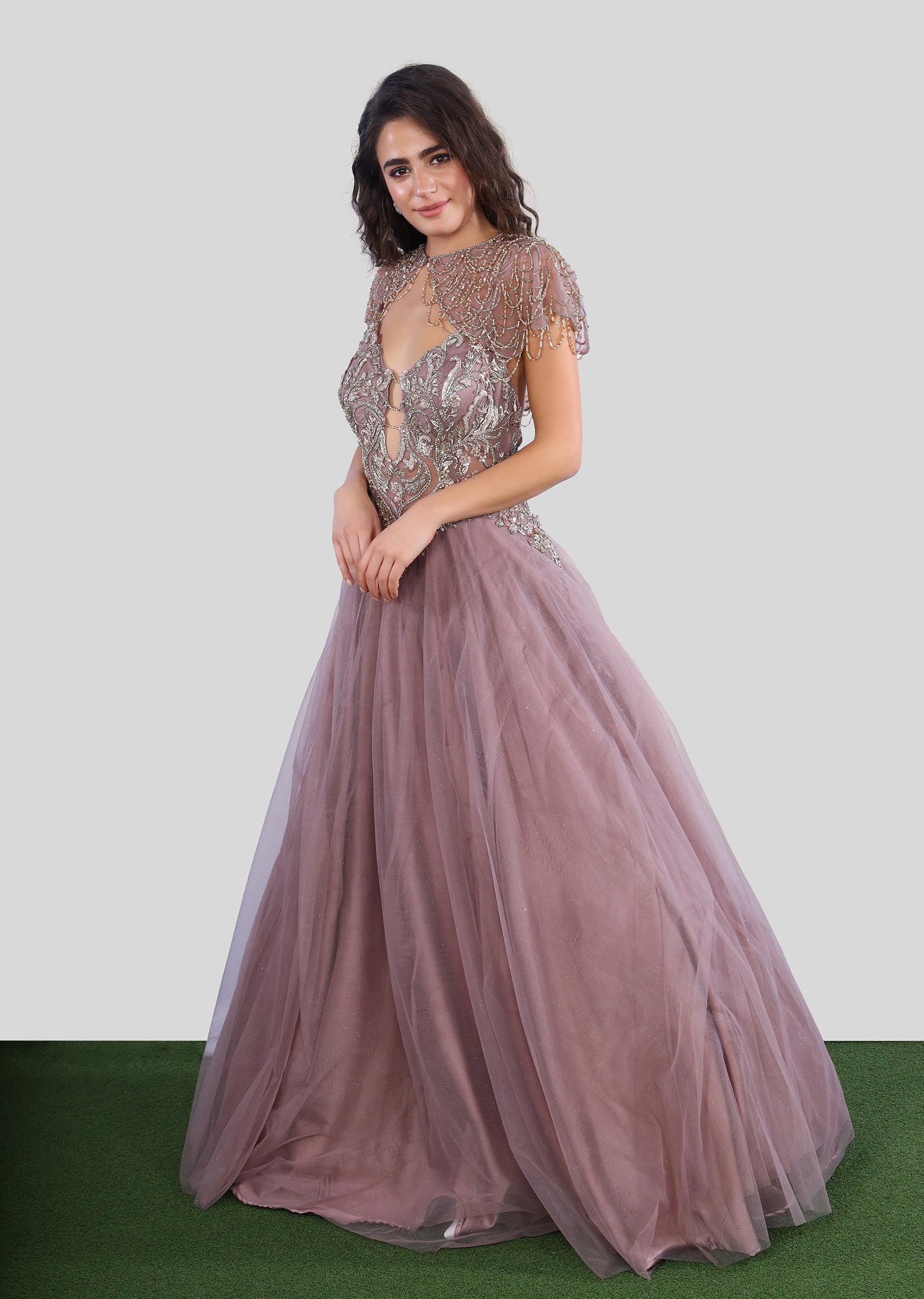 Plunge lilac cocktail gown in net embroidered in western zardozi with tasselled cape