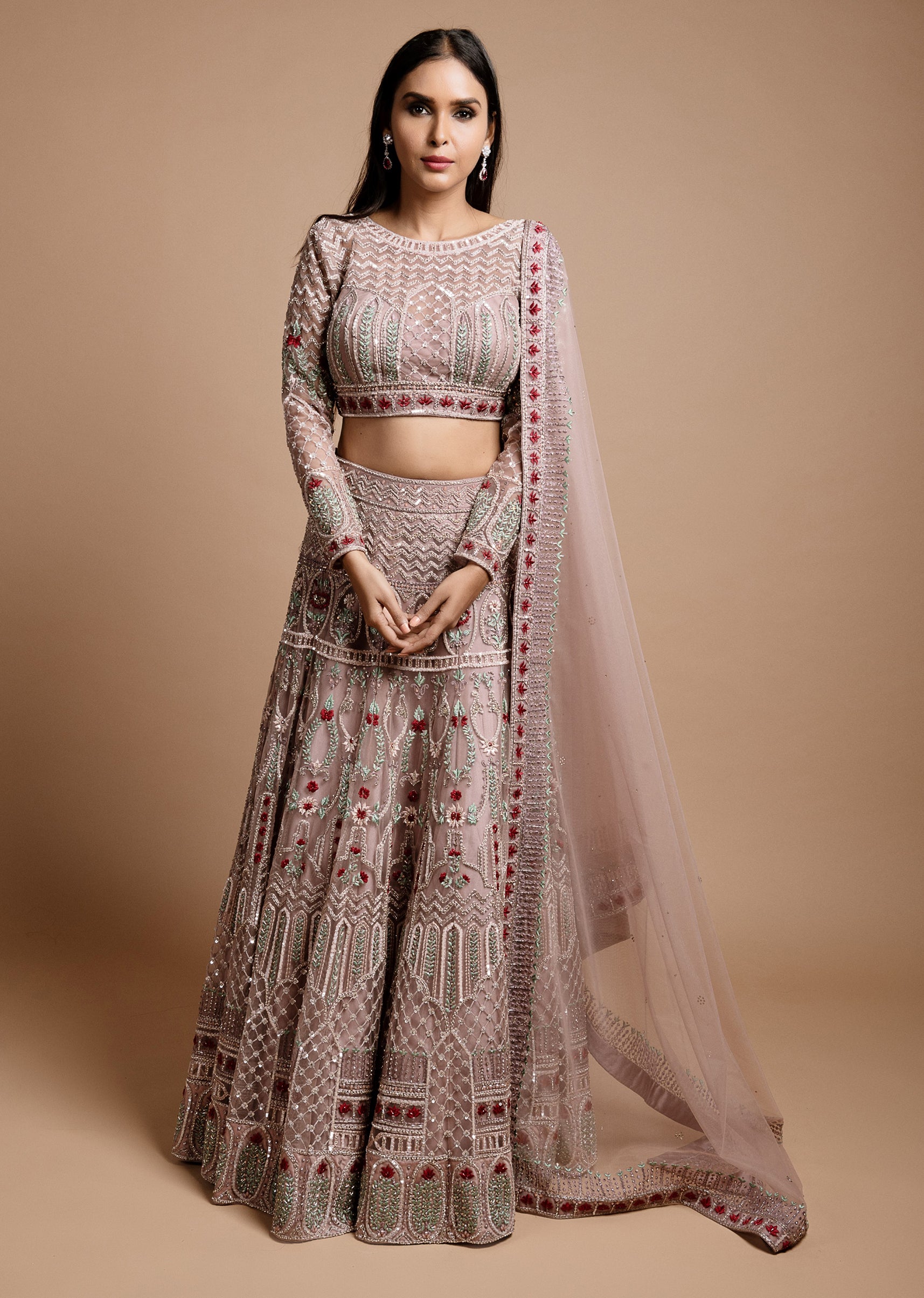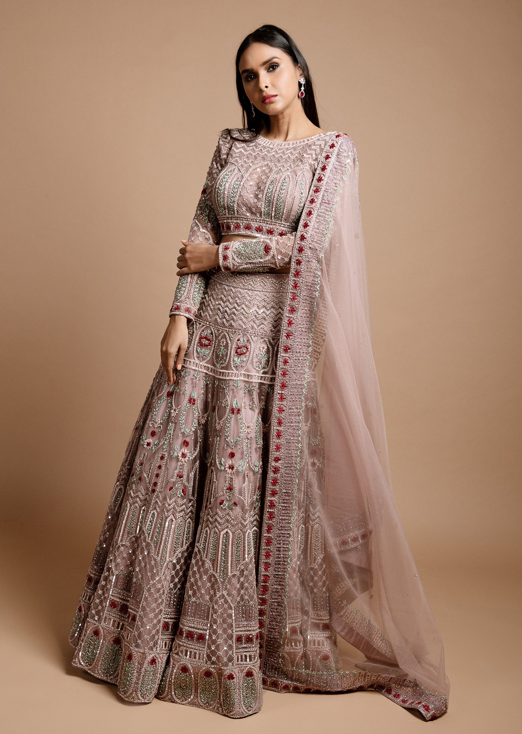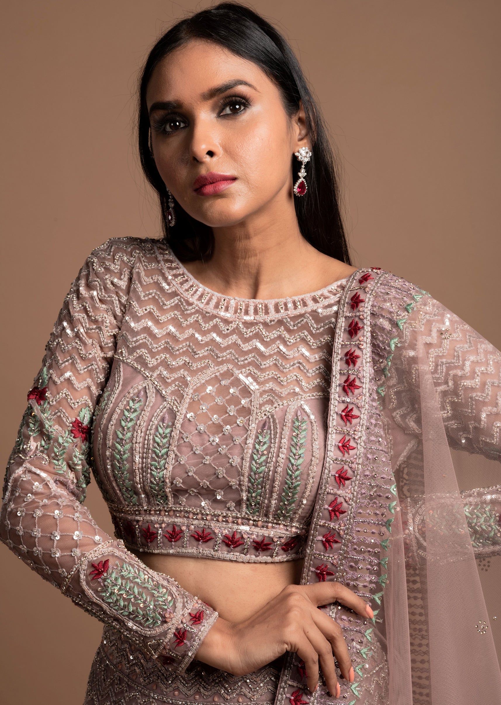 Mauve grey net lehenga choli dupatta with abstract floral motifs in resham, zardozi and crystals.