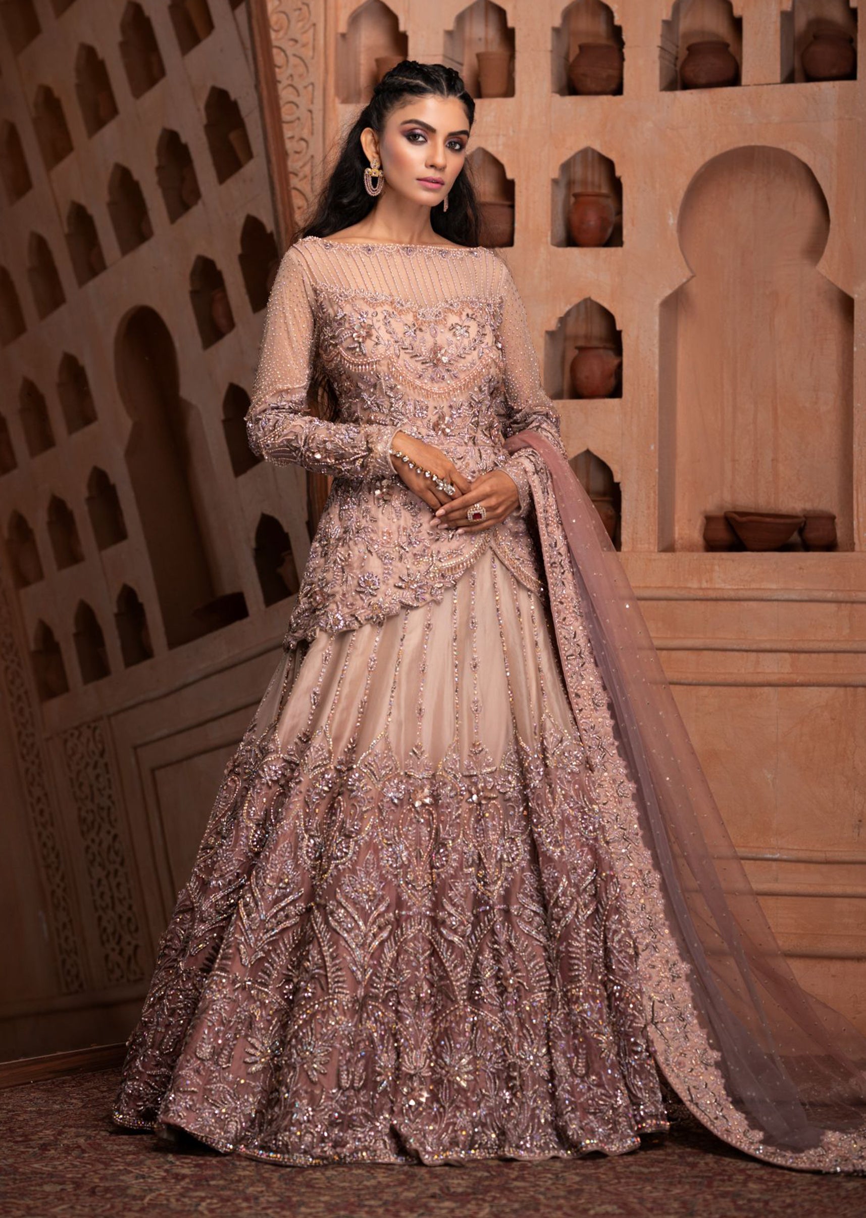 Blush net and organza overlap kurta with blush mauve organza ombre lehenga embroidered in self zardozi, sequins and crystals; paired with a mauve grey ombre net dupatta with embroidered border.