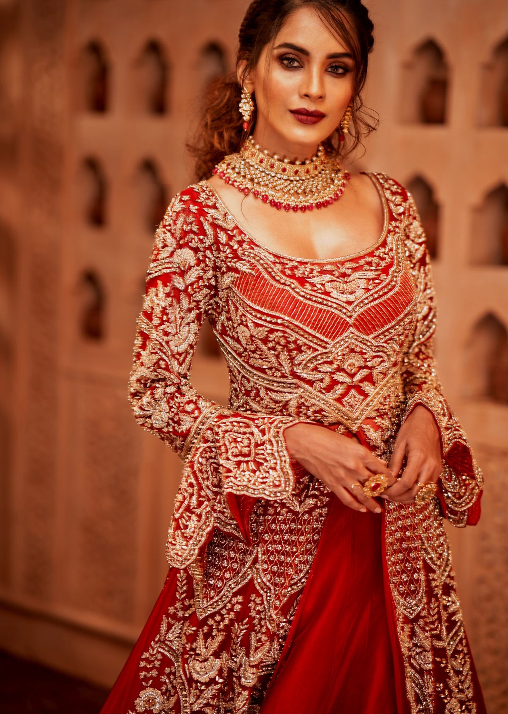 Deep red net anarkali and red silk lehenga with persian floral motifs embroidered in zardozi, crystals and resham; paired with a gold organza dupatta with silk embroidered border
