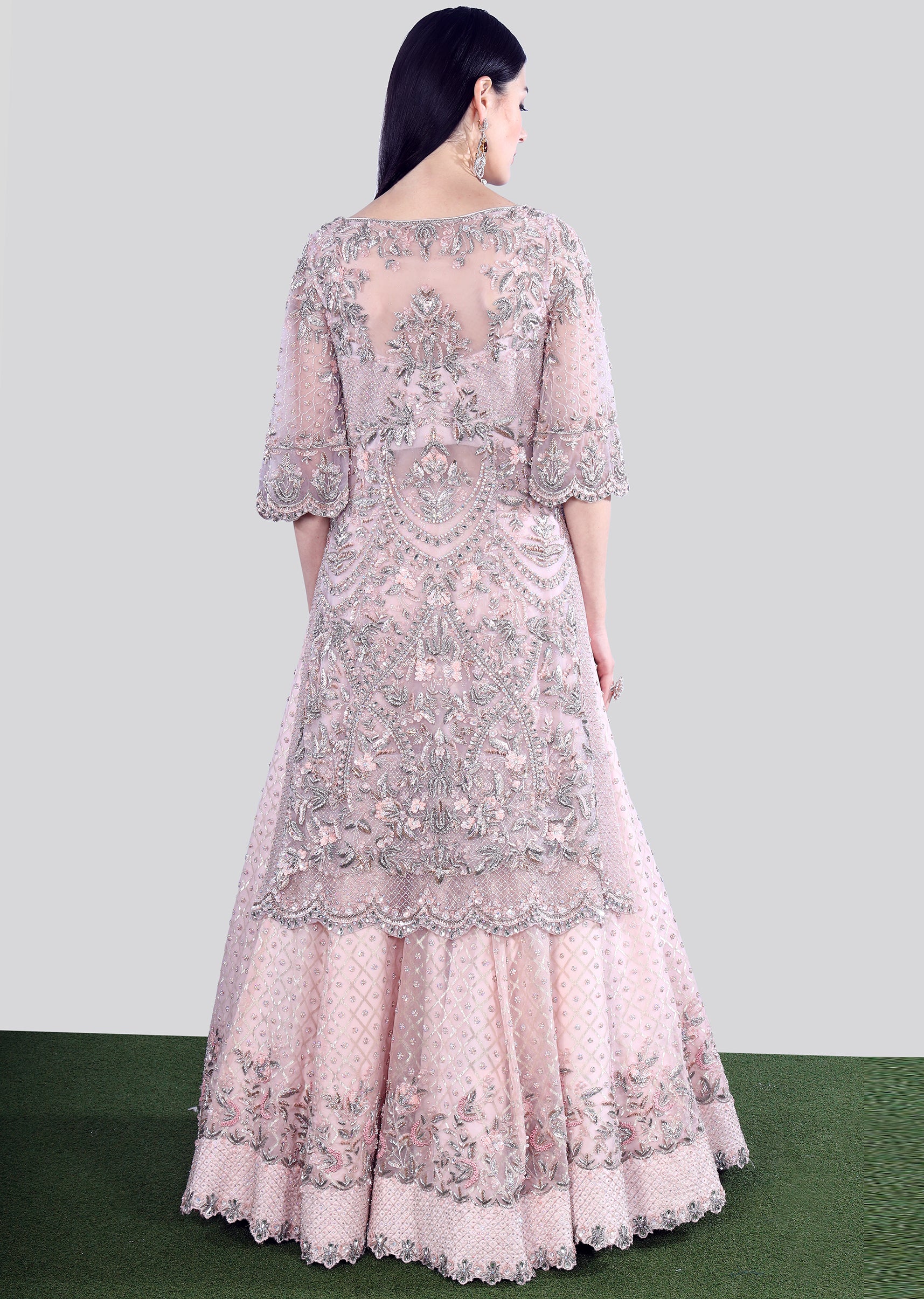 Pastel pink sheer net flared sleeve kurta lehenga set with resham, sequins and zardozi floral persian motifs embroidery