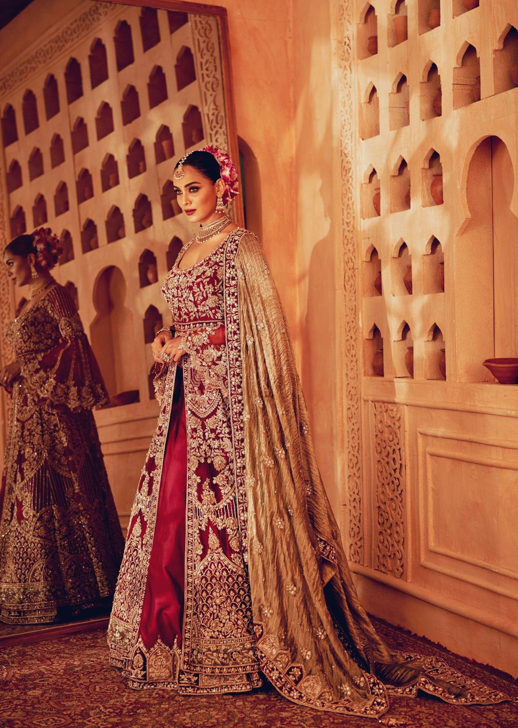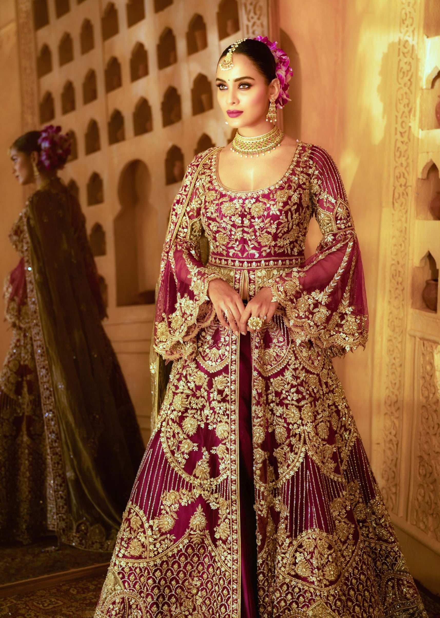 Magenta net open anarkali kurta embroidered with persian inspired motifs in gold zardozi; paired with a magenta silk lehenga and gold tissue organza dupatta embroidered in gold zardozi.