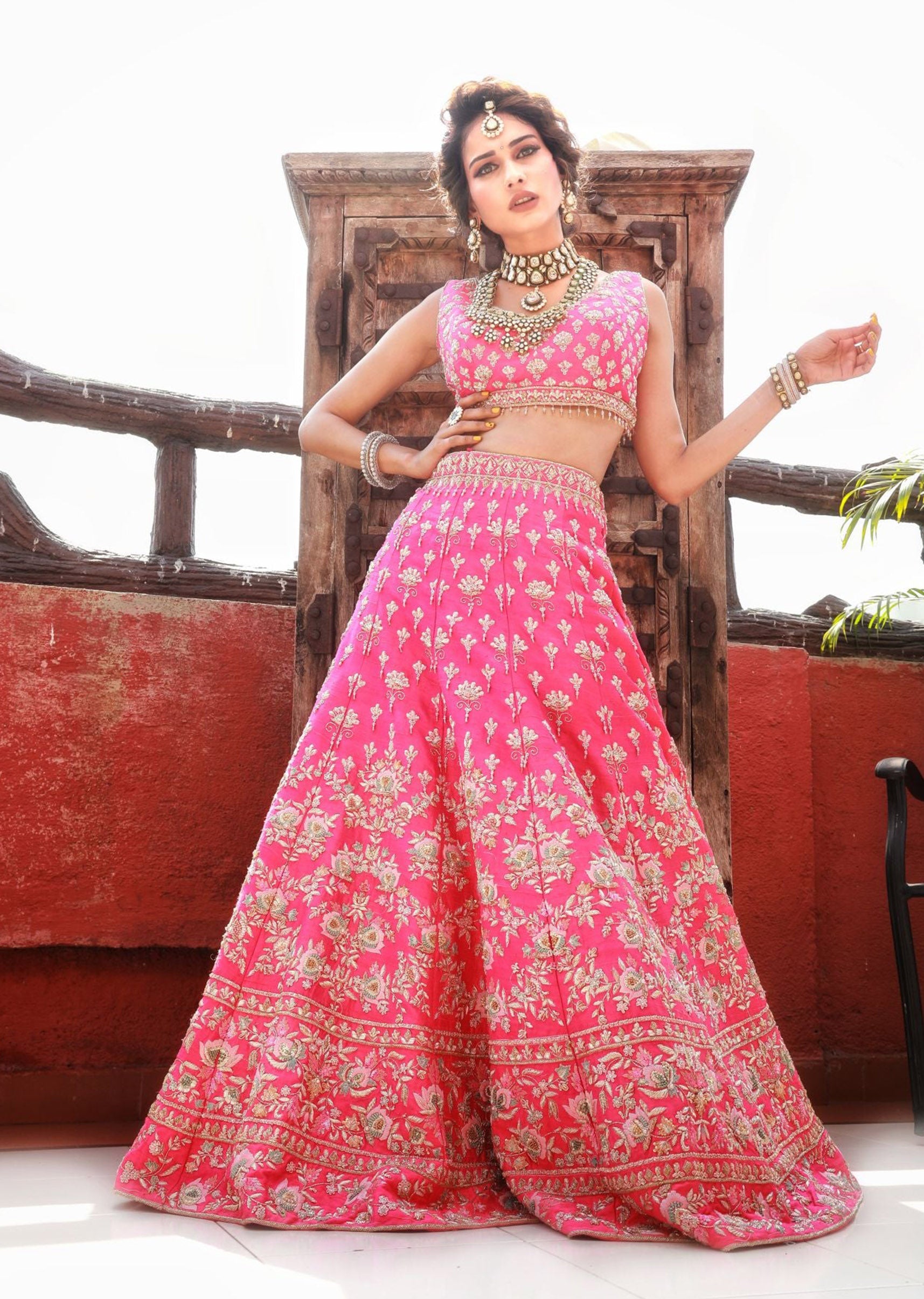 Cranberry pink silk lehenga choli with blush pink resham and zardozi embroidery