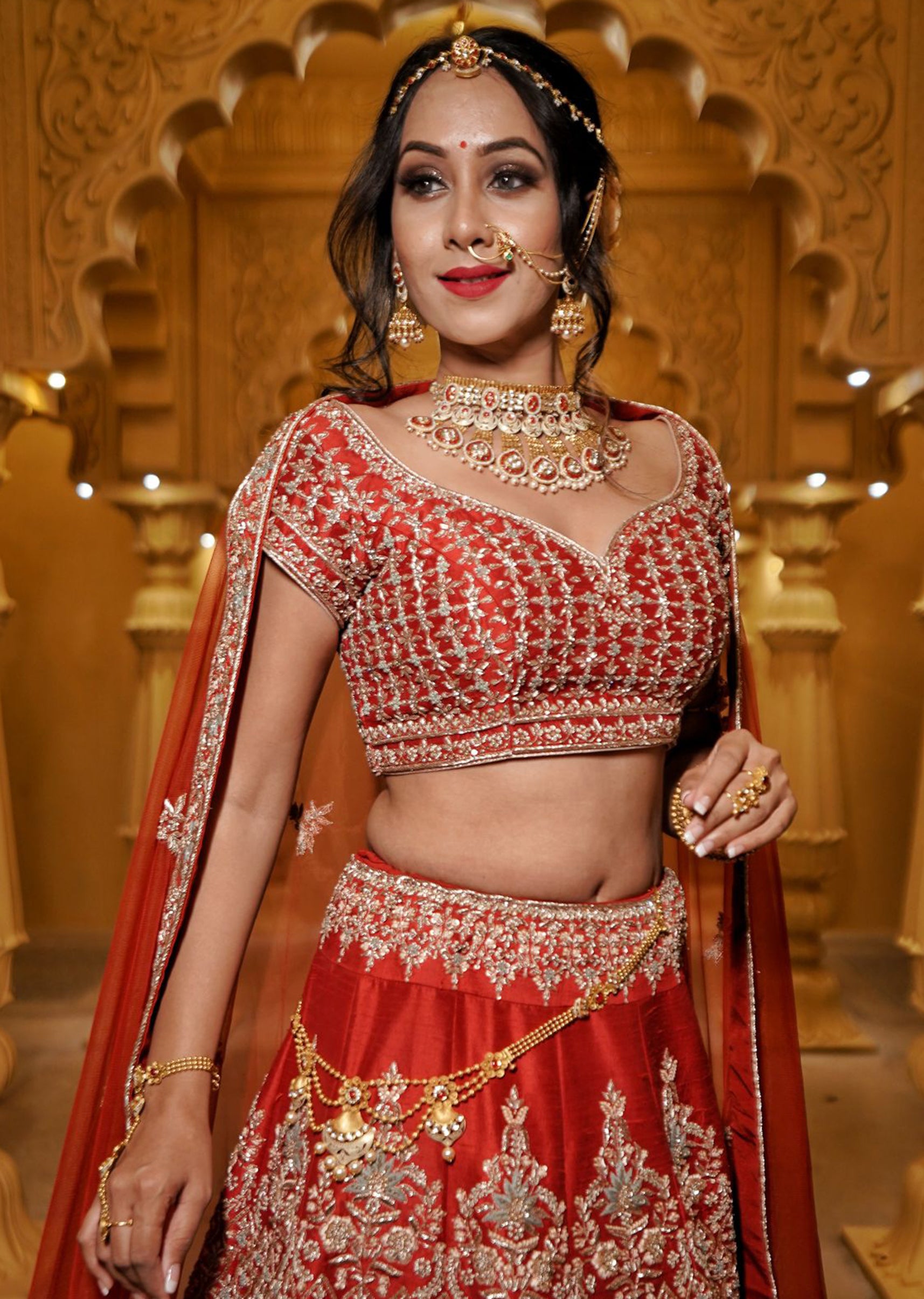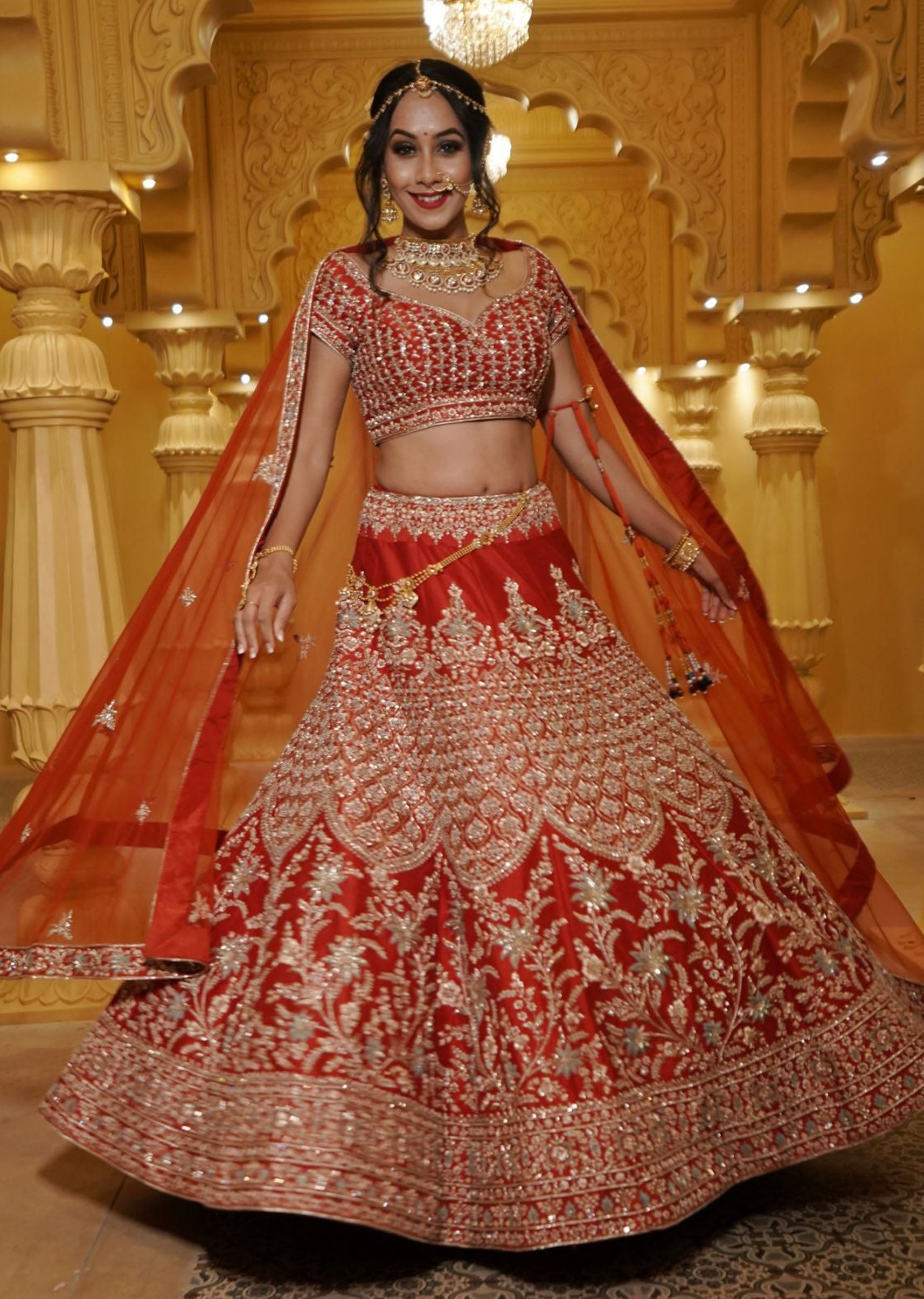 Vermillion red silk lehenga choli embroidered with intricate art deco floral motifs in zardozi and resham; paired with a red net embroidered dupatta.