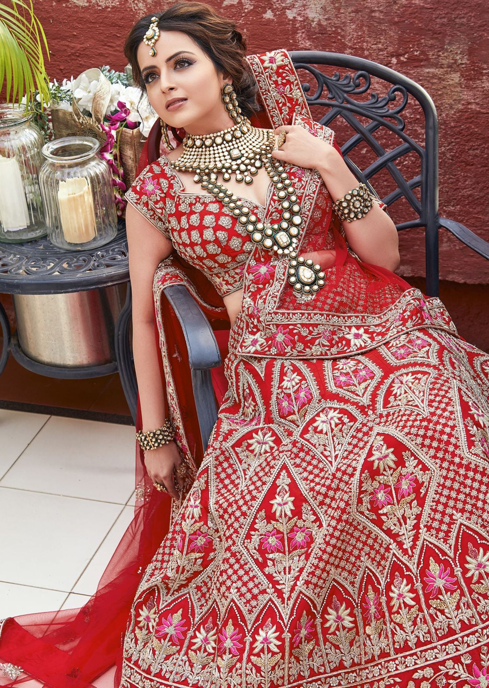Crimson red silk lehenga and choli embroidered with abstract persian motifs in zardozi and resham; paired with a red net dupatta.