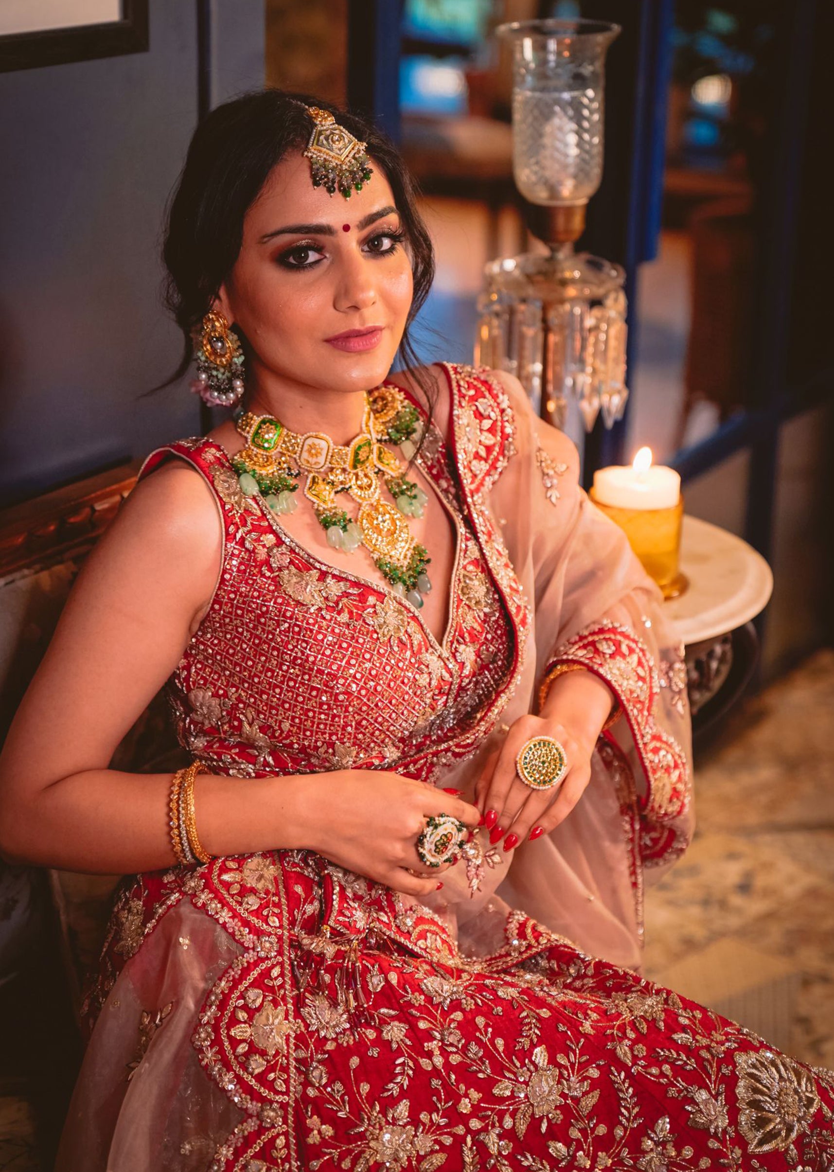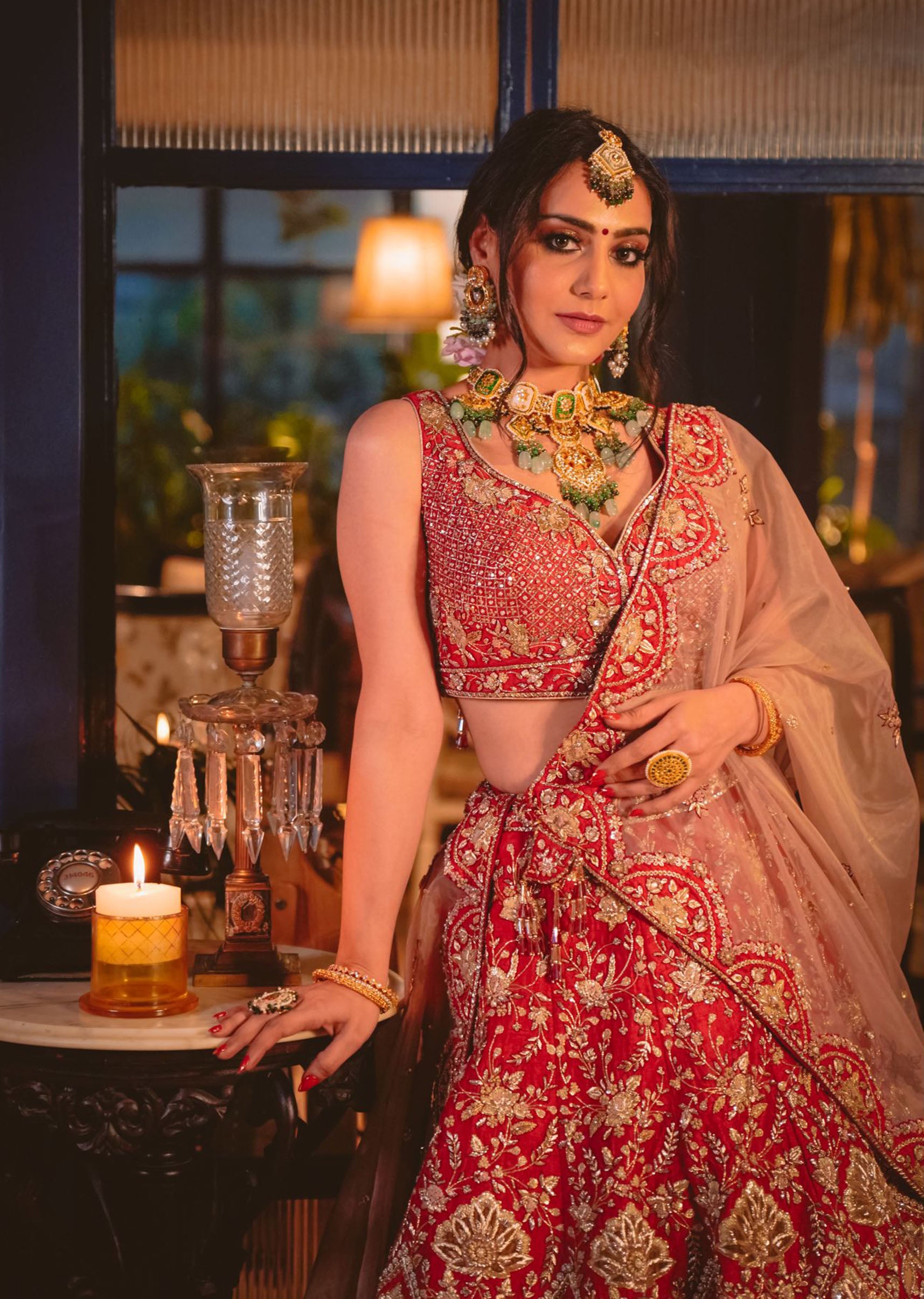 Deep red silk lehenga choli with mughal arches and peacock motifs in gold zardozi, resham and applique embroidery; paired with a beige gold tissue dupatta embroidered with floral zardozi buttis and a silk scallop border.