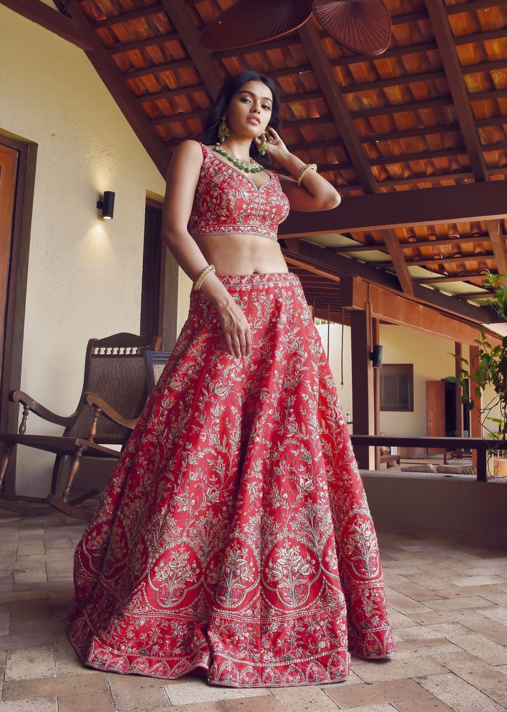 Crimson red pink silk lehenga choli embroidered with mughal bagh motifs in zardozi and resham; paired with a peach orange net dupatta with embroidered motifs and silk border.