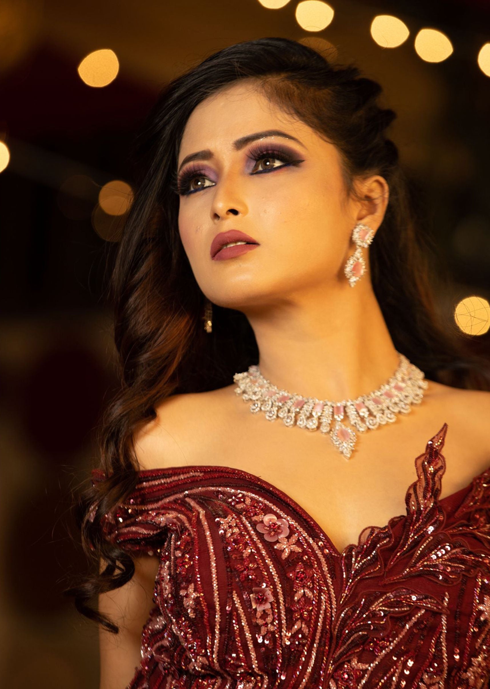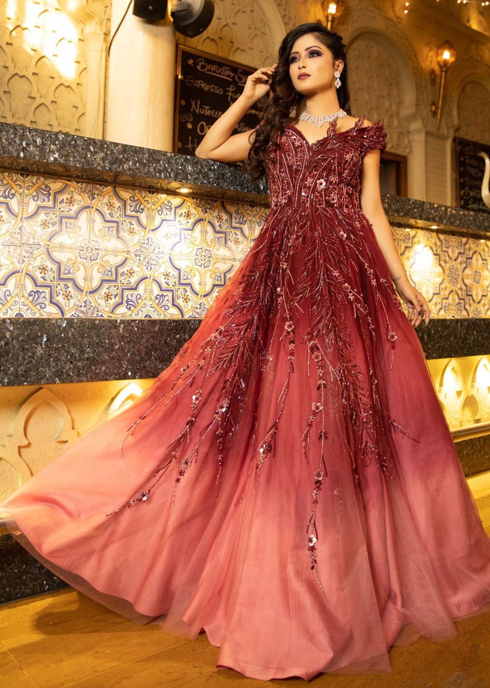 Wine red and coral ombre net gown with 3D floral structured motifs embroidered in sequins, self zardozi and crystals.