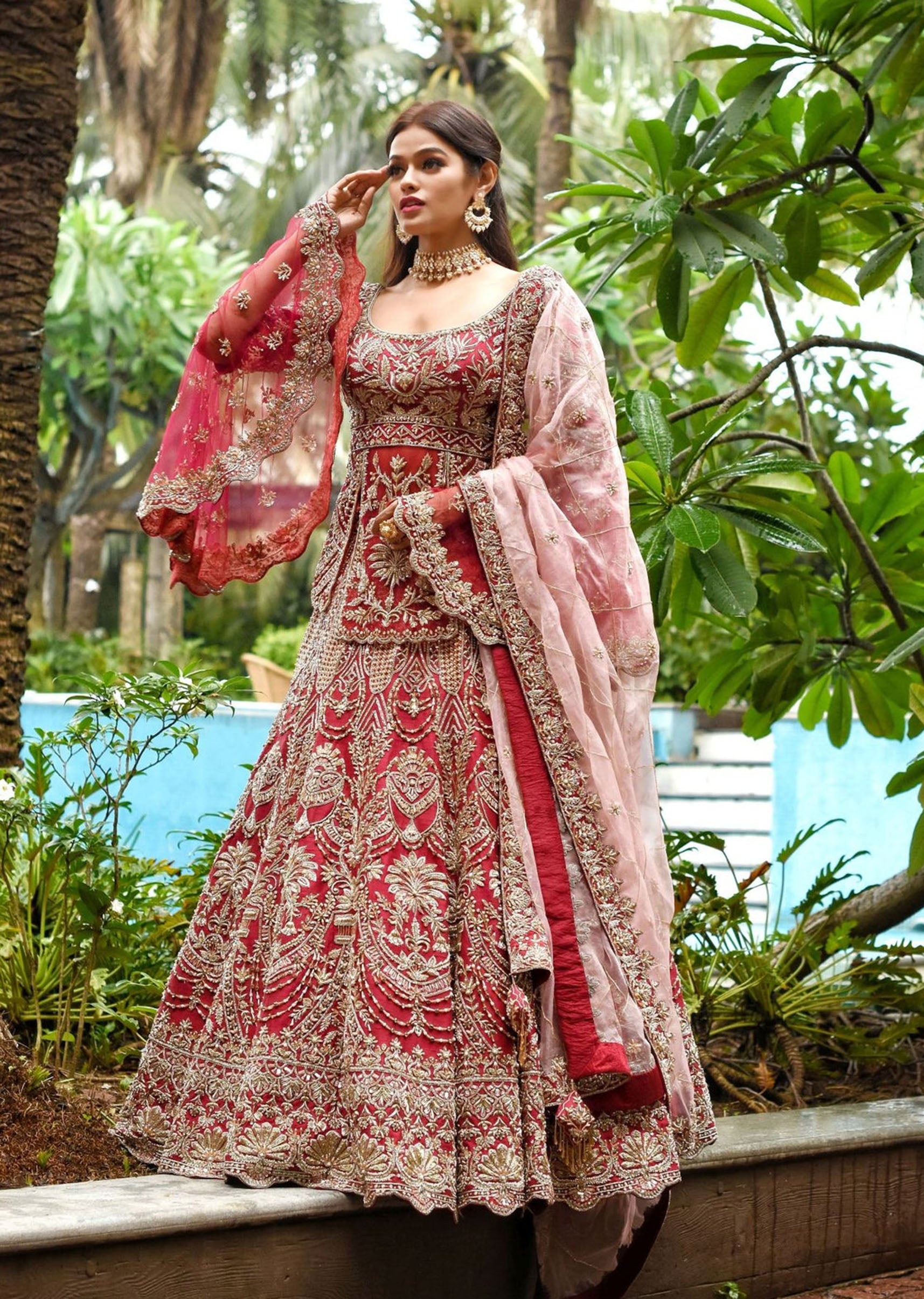 Crimson red silk lehenga with a net panel peplum style silk choli top embroidered with persian traditional motifs in zardozi and pearls; paired with a rose pink organza embroidered dupatta.