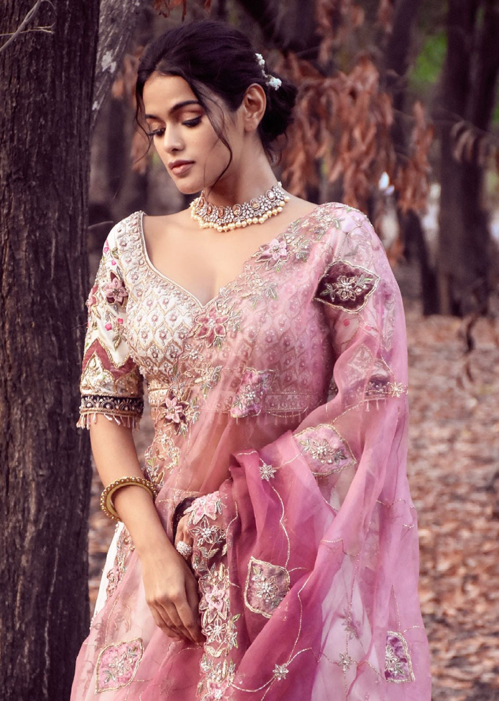 Ivory silk lehenga and choli embroidered with nature inspired persian motifs in zardozi, resham and velvet applique; paired with a mauve pink organza dupatta embroidered with velvet applique and zardozi.