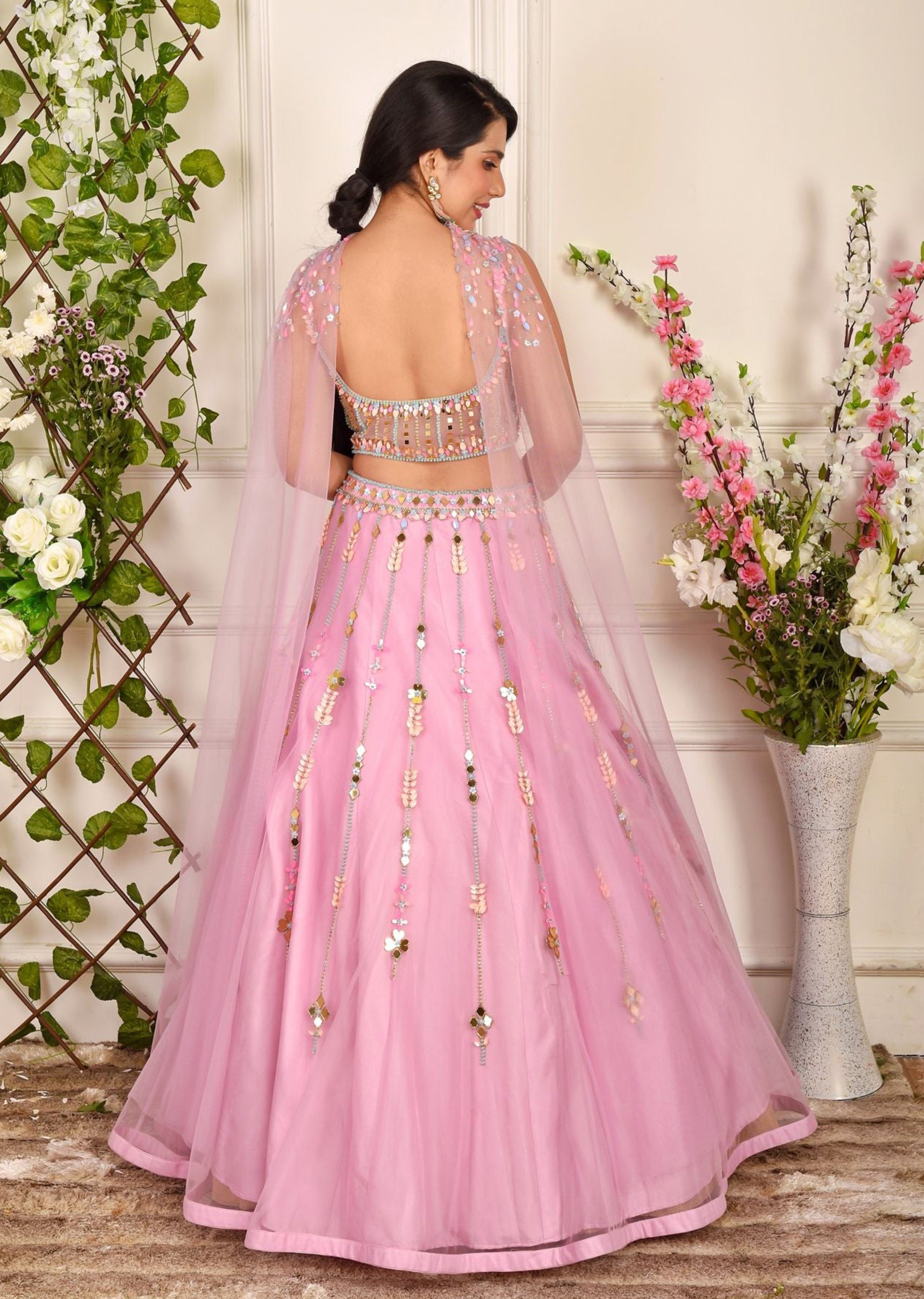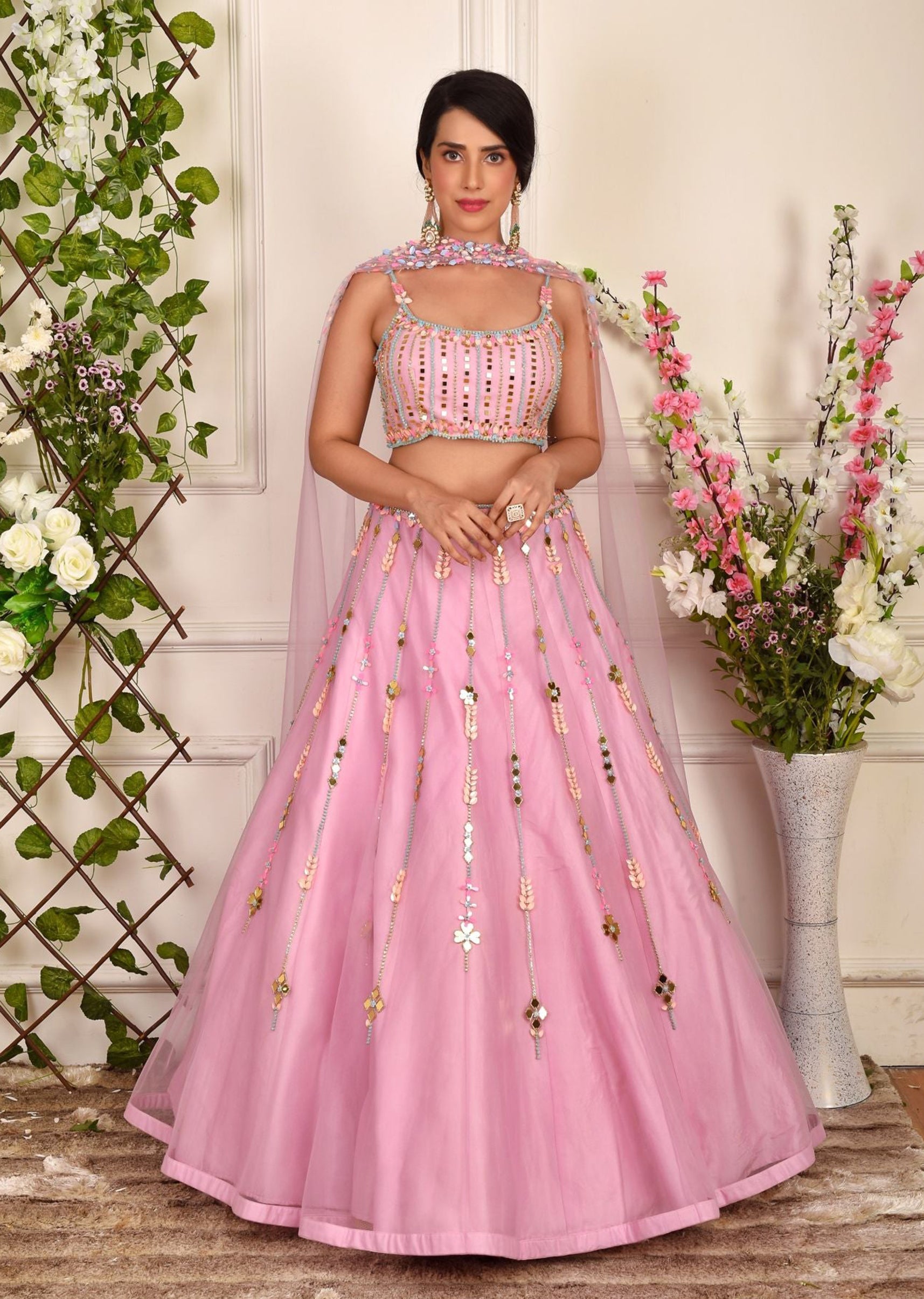 Lilac pink net lehenga, choli, stole embroidered in abstract multi-colored embroidery with sequins, beads and mirrorwork