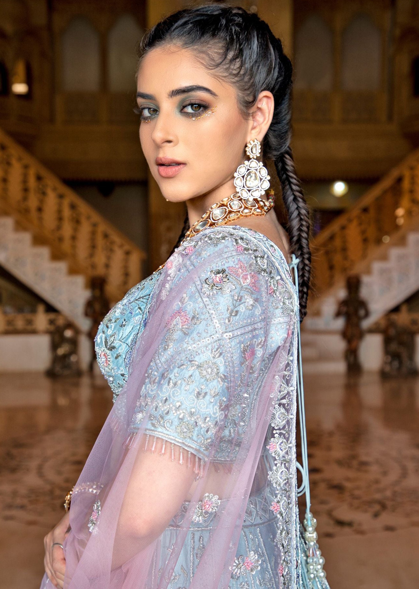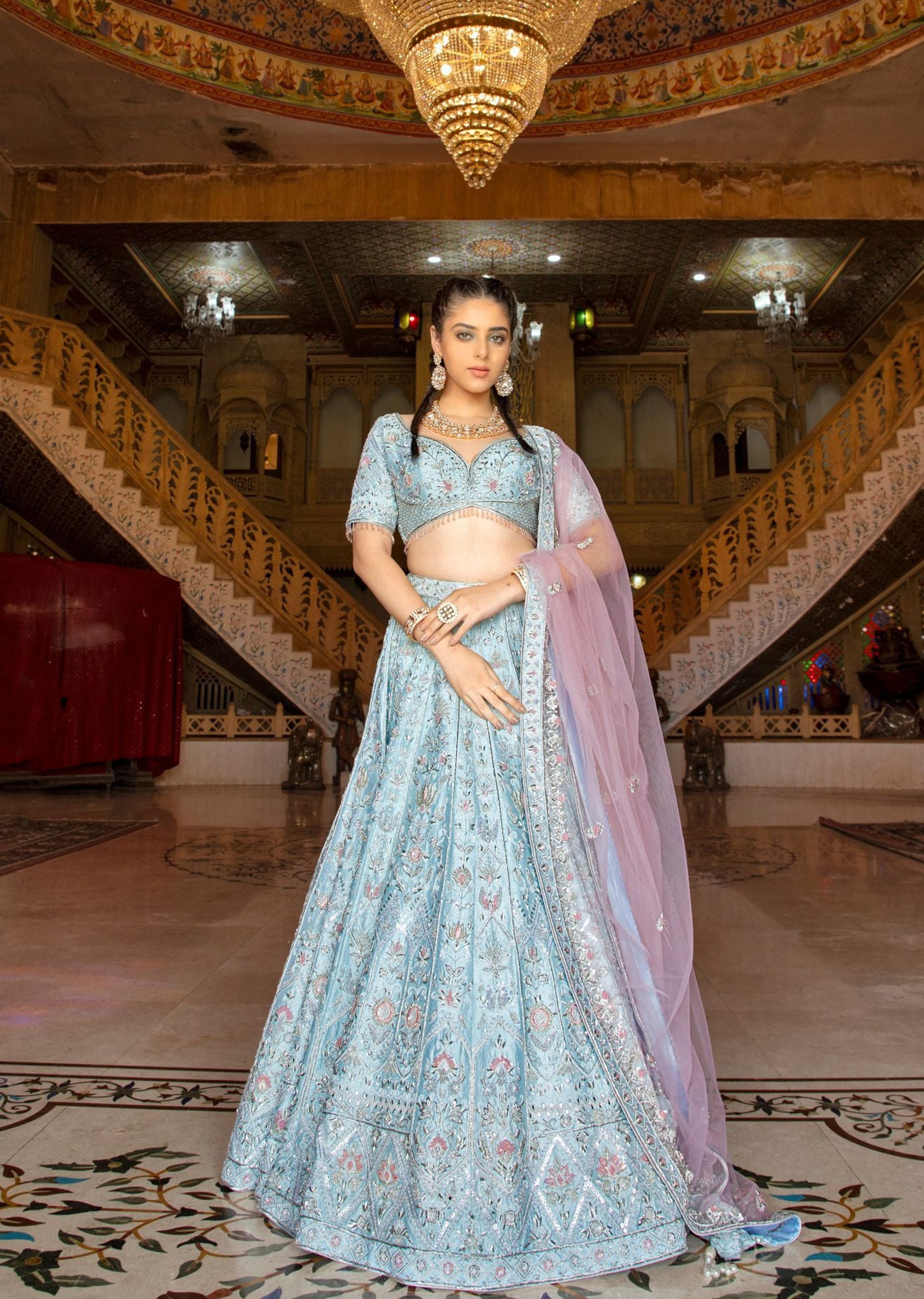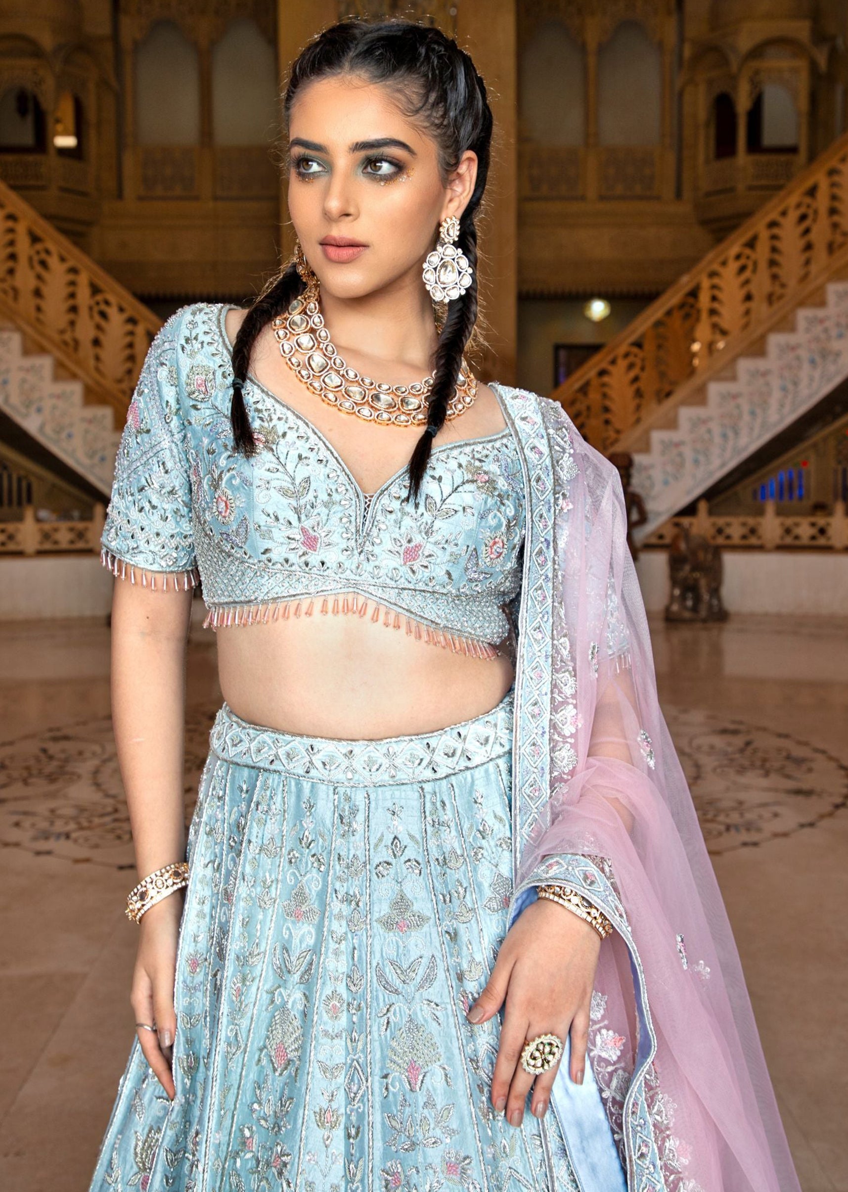 Dreamlike elegance meets subtle sophistication in this powder blue silk lehenga, adorned with intricate silver embroidery and a delicate touch of pink resham. Effortlessly embodying grace and refinement, it's a masterpiece that whispers timeless beauty with every twirl.