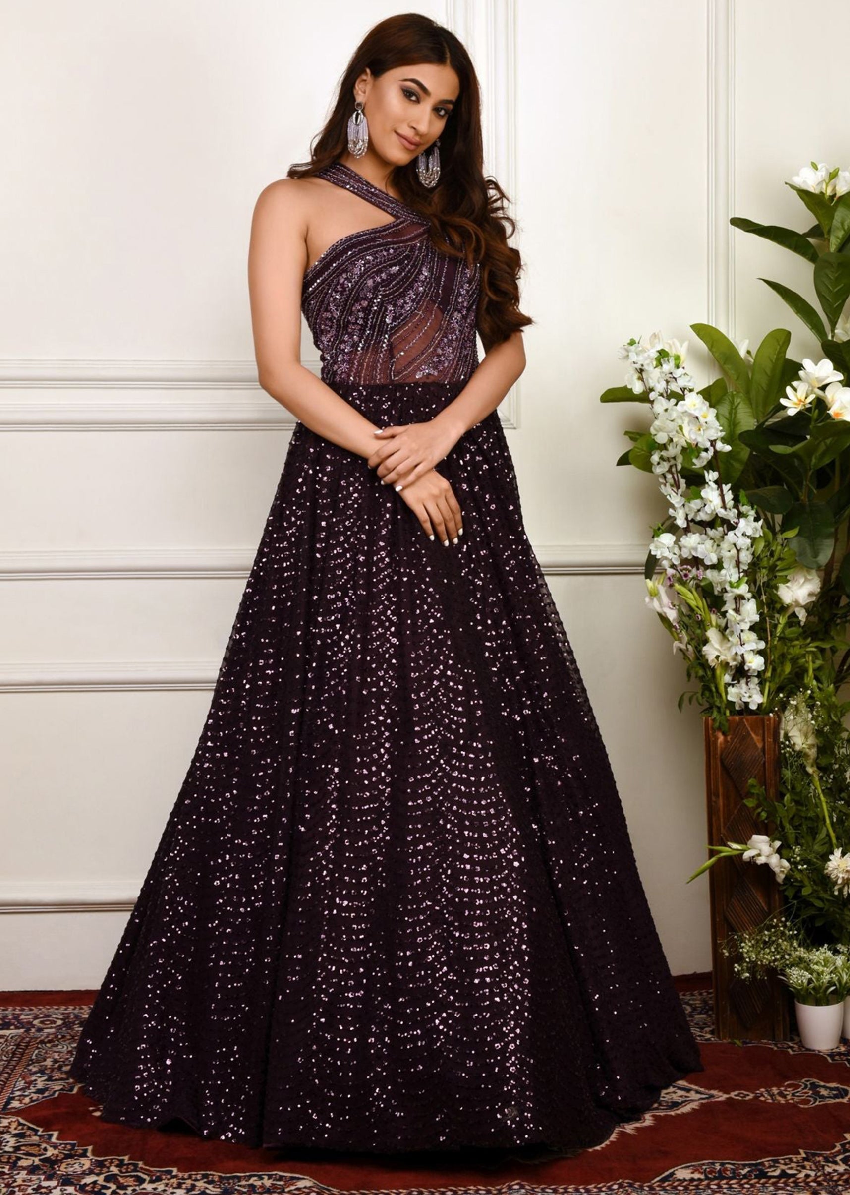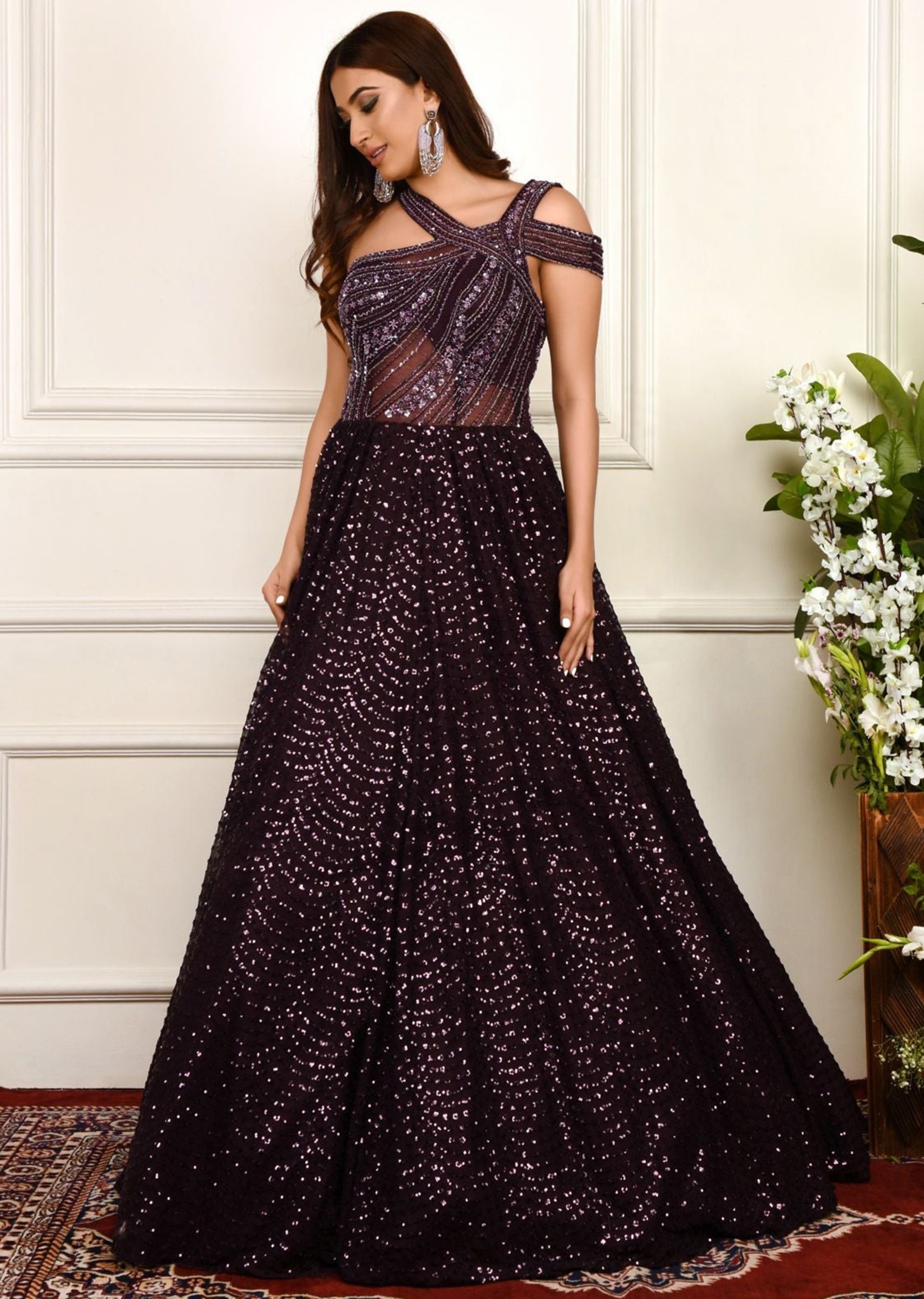 Eggplant purple sequinned net evening gown with embroidered bodice and structured shoulder detailing.