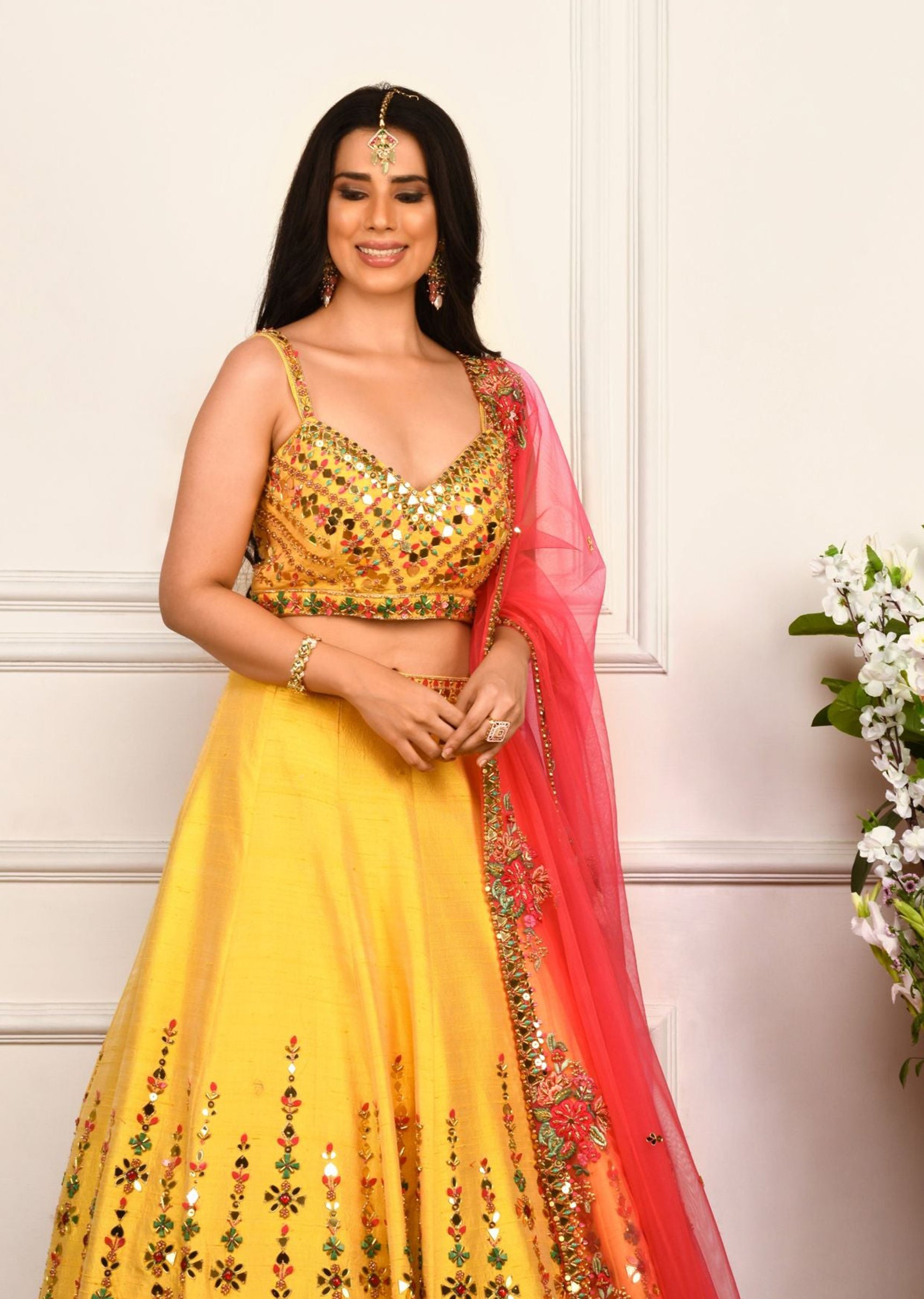 Haldi yellow silk lehenga choli with multicolor resham, metallic sequins and beads; paired with a coral pink net embroidered dupatta.