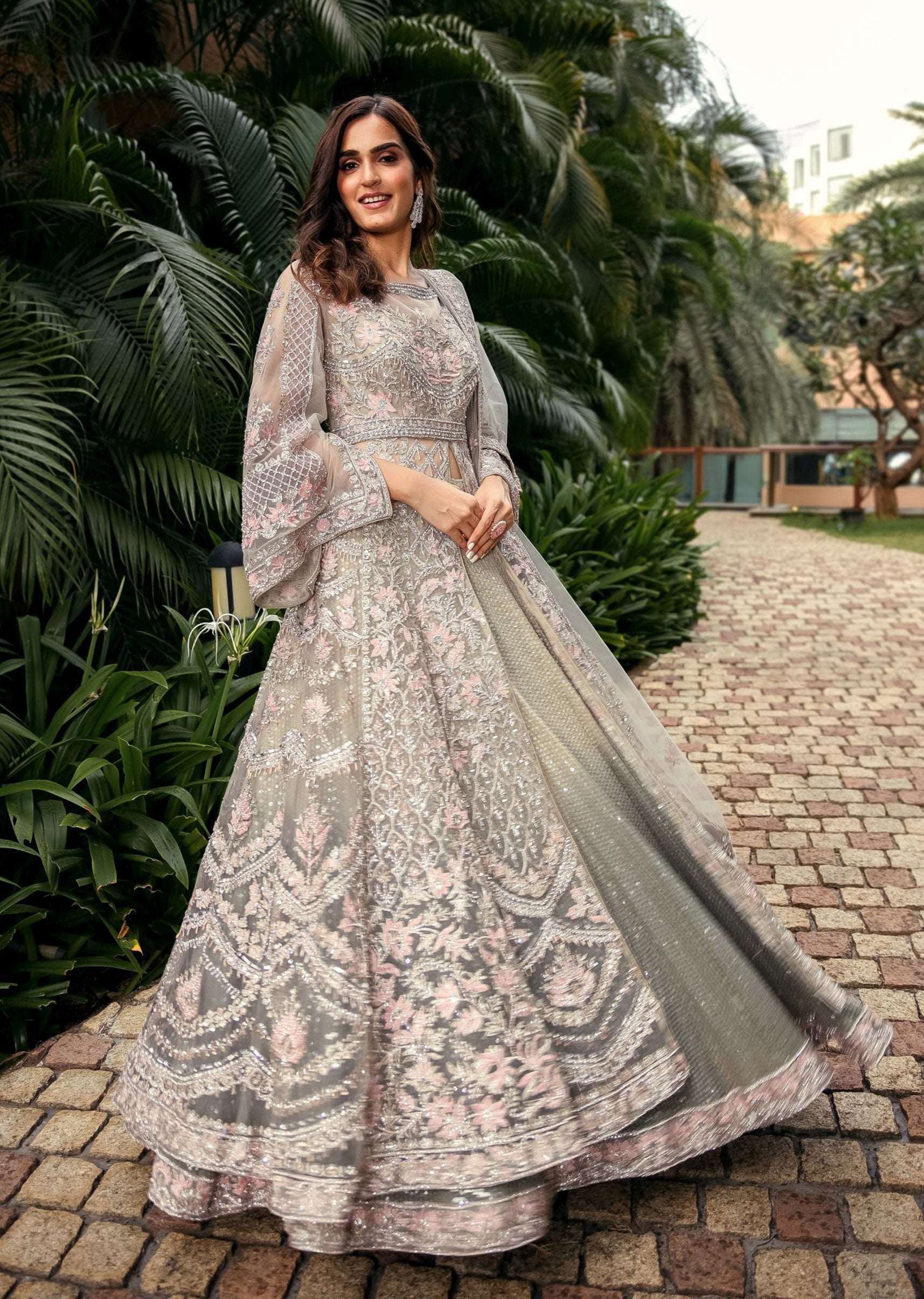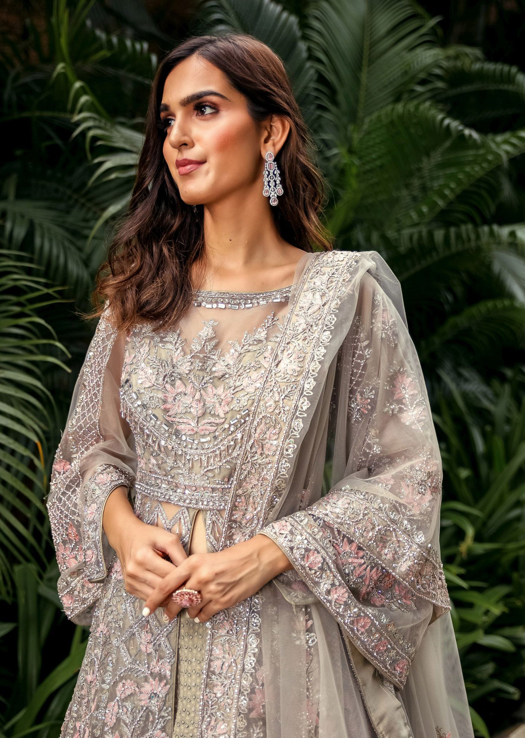 Pastel teal grey net front slit anarkali and net dupatta embroidered with mughal bagh floral motifs in resham, zari and sequins; paired with an ombre teal grey sequinned georgette lehenga.