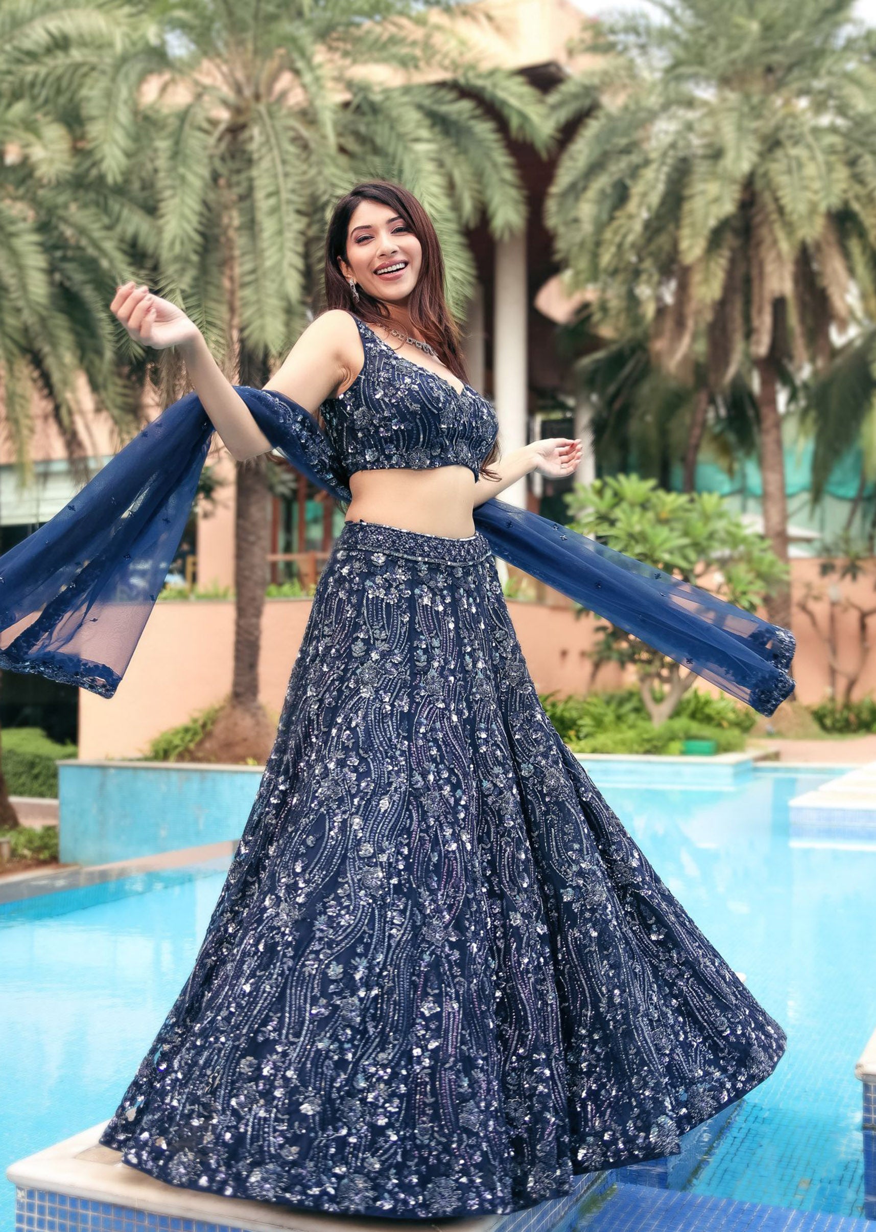 Navy blue net lehenga choli and dupatta with all over floral embroidery in navy sequins and beads.