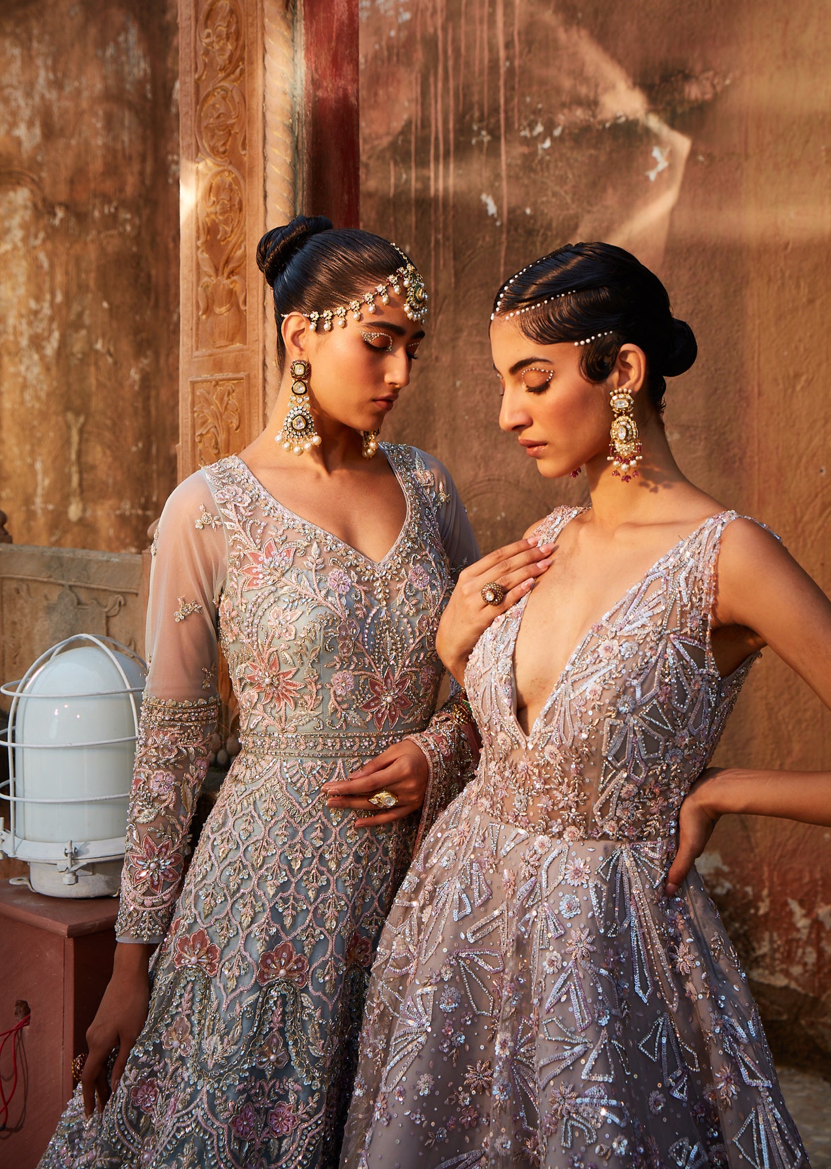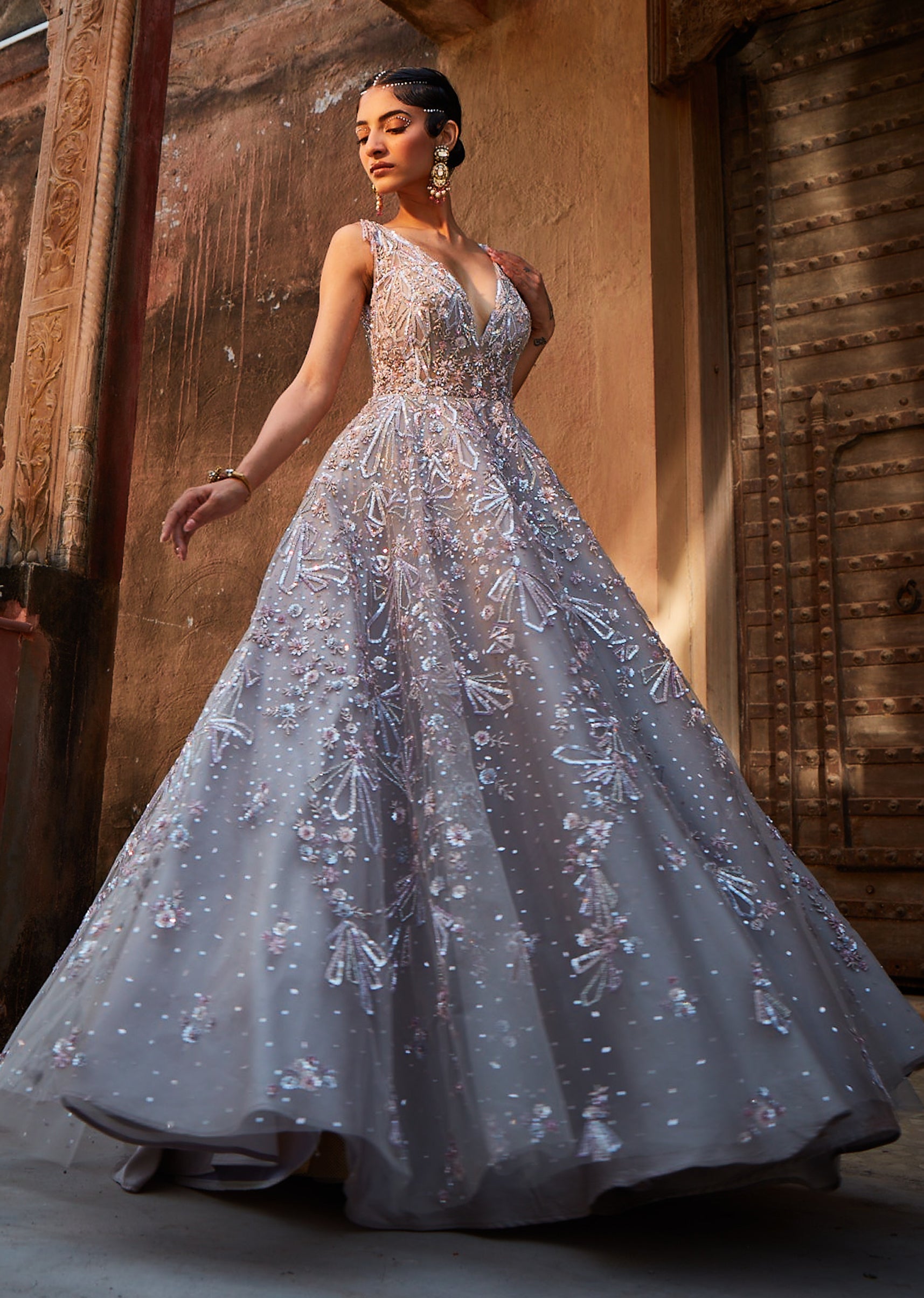 Satin grey netted gown embellished with crystals and beads is a head turner at any cocktail event