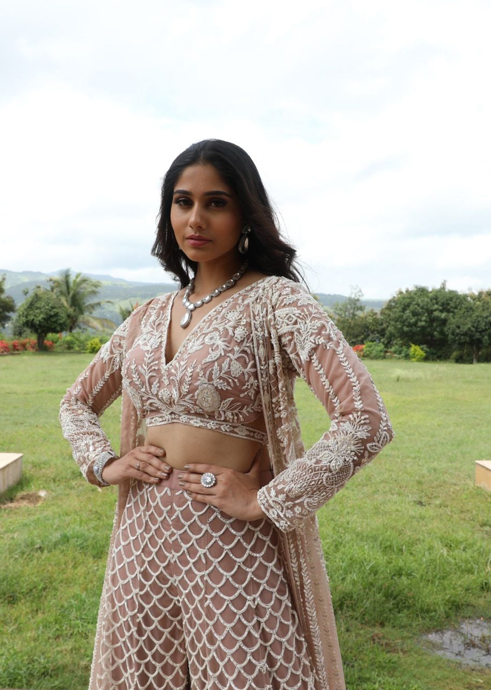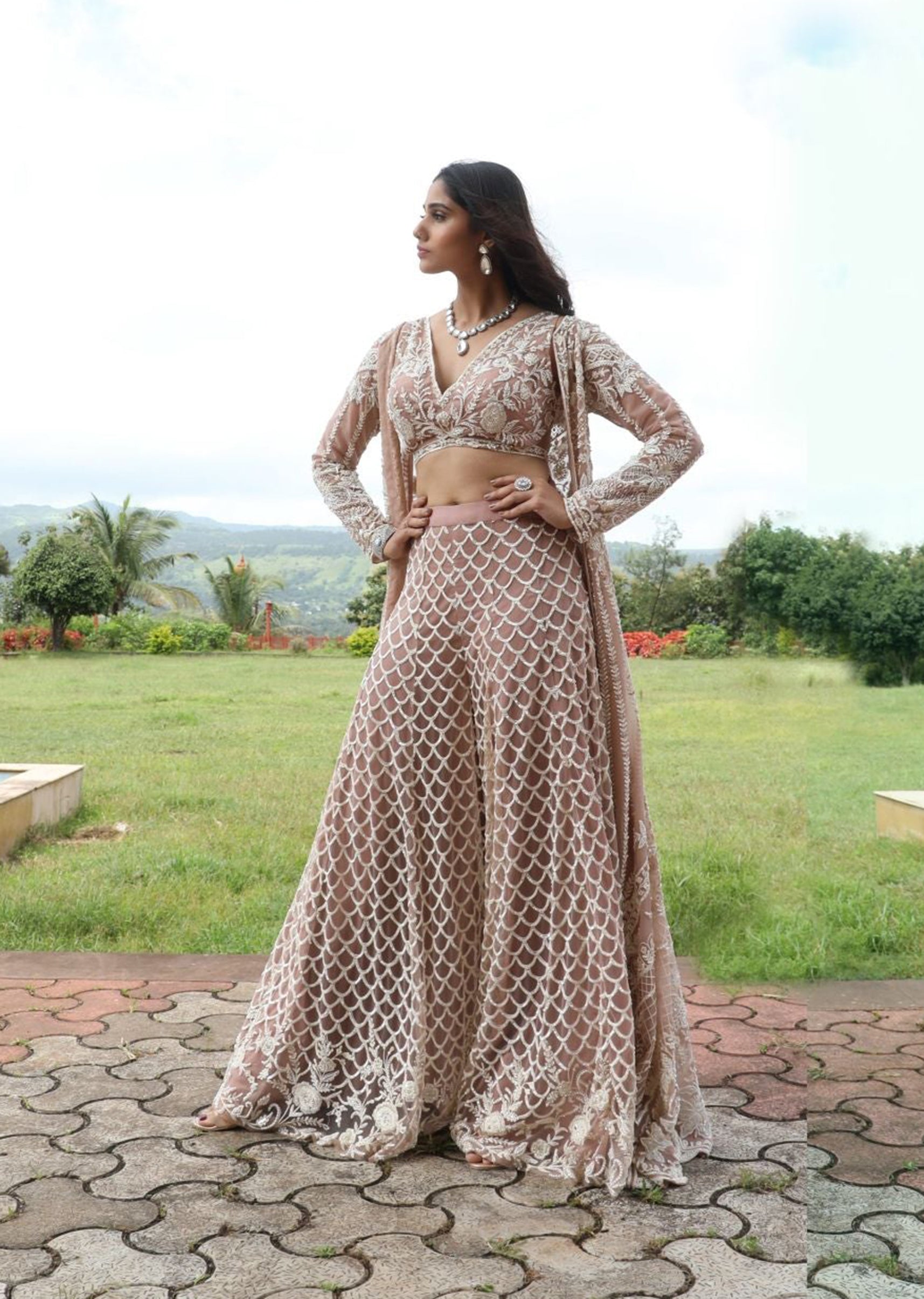 This nude long cape ensemble features intricate off-white thread beadwork, adding a touch of subtle luxury to your look. Paired with a flowing plazo, it's a modern interpretation of traditional grace, perfect for making a statement at any occasion.