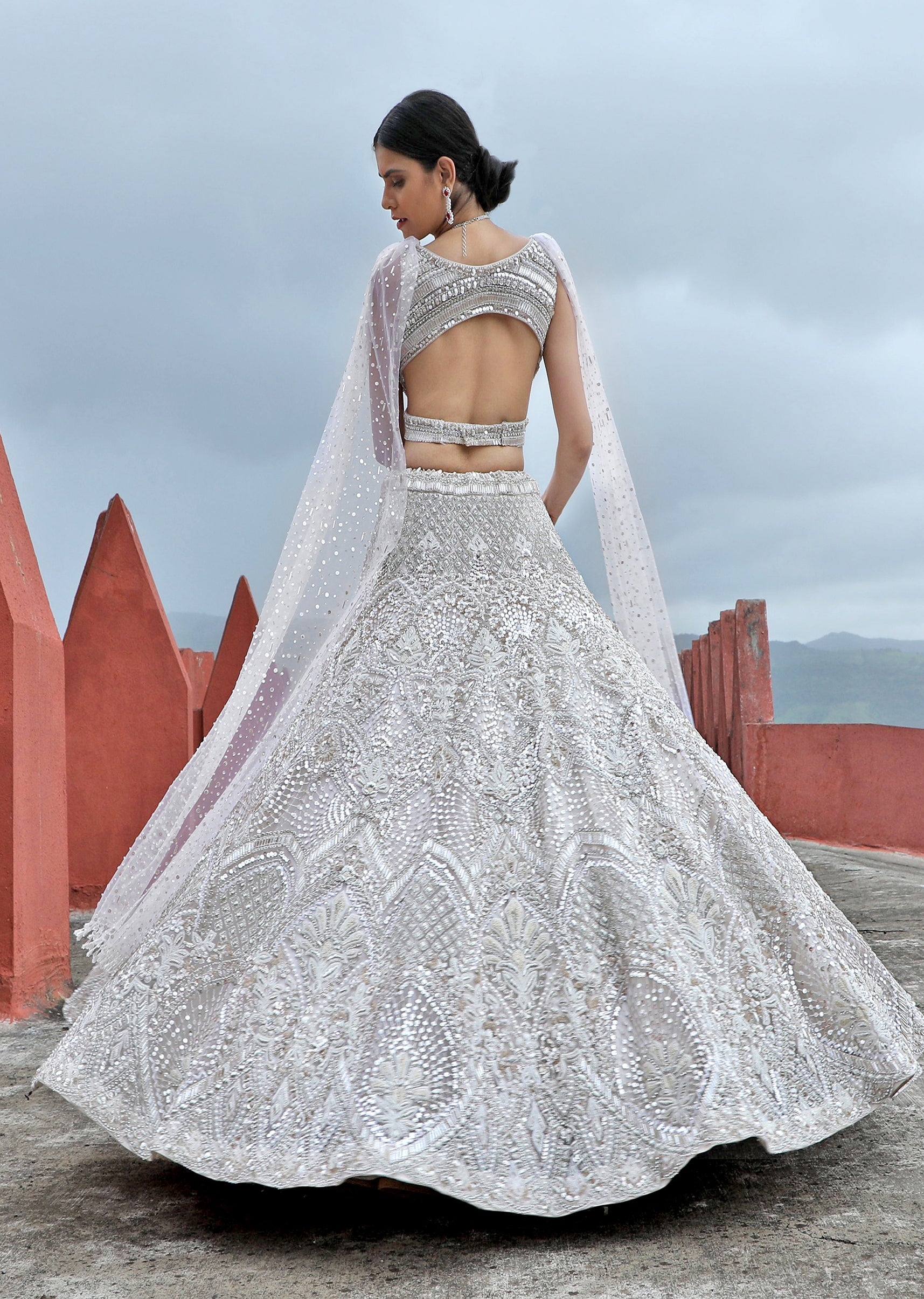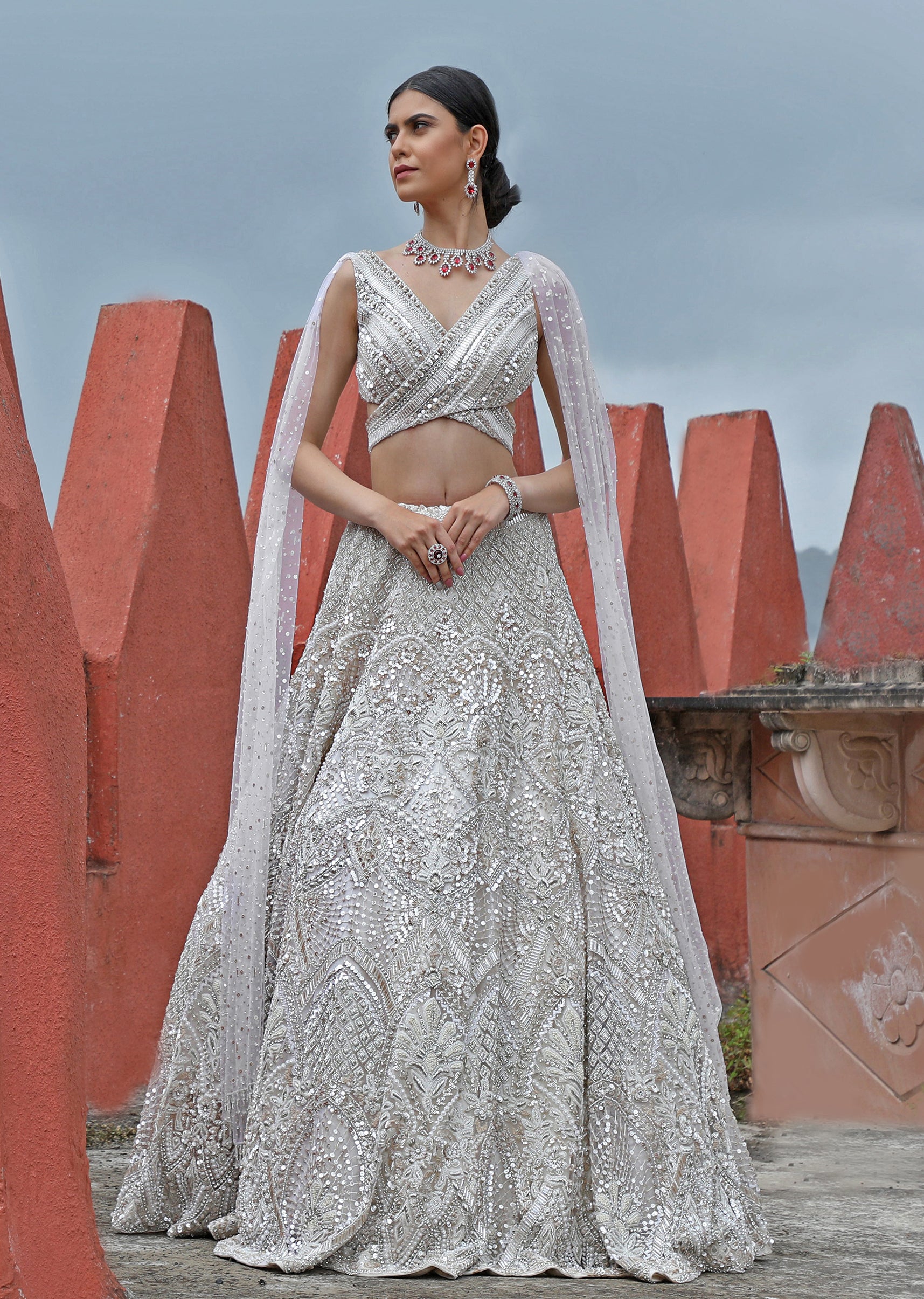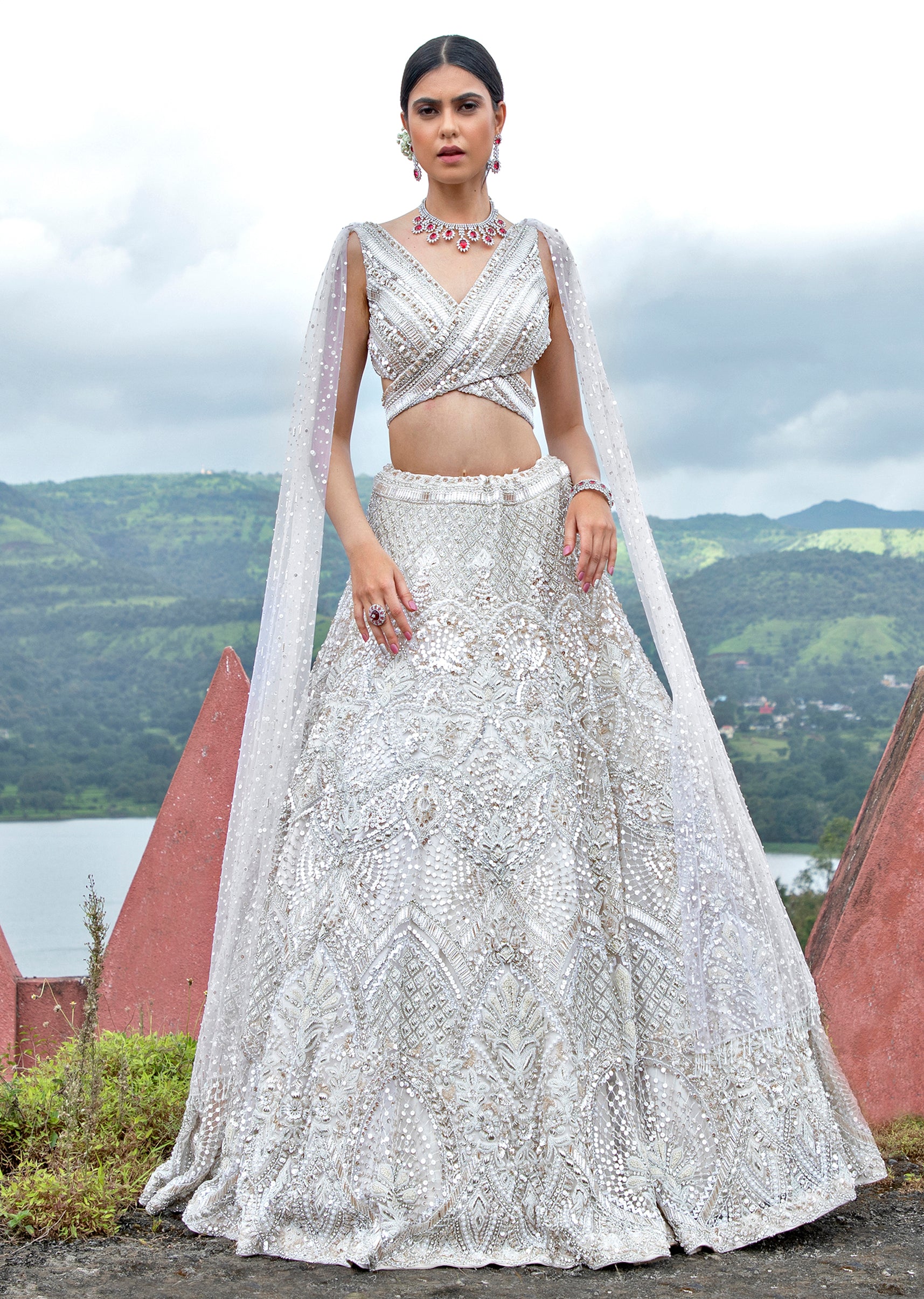 Ethereal elegance meets contemporary chic in this Off White Organza Lehenga with a wrap choli, adorned with intricate sequin and self-beadwork embroidery. A fusion of tradition and modernity, this ensemble promises to captivate with its delicate allure and timeless sophistication.