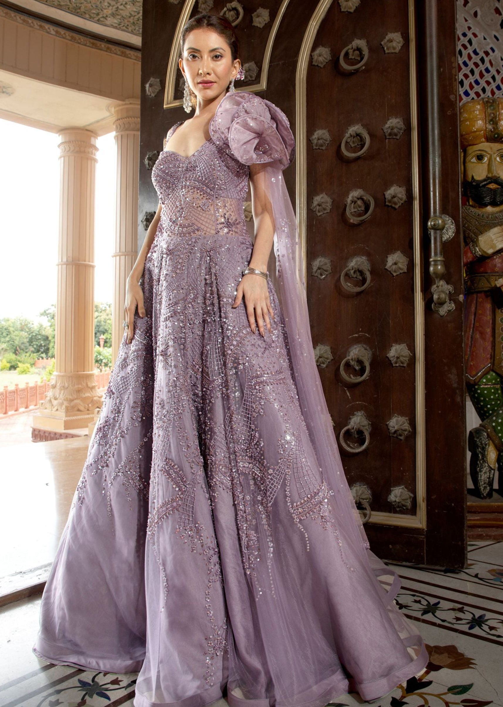 Captivate in this ethereal mauve net gown, adorned with intricate self-embroidery in shimmering sequences and delicate zircon accents. Effortlessly elegant, it's a vision of timeless grace and subtle opulence.