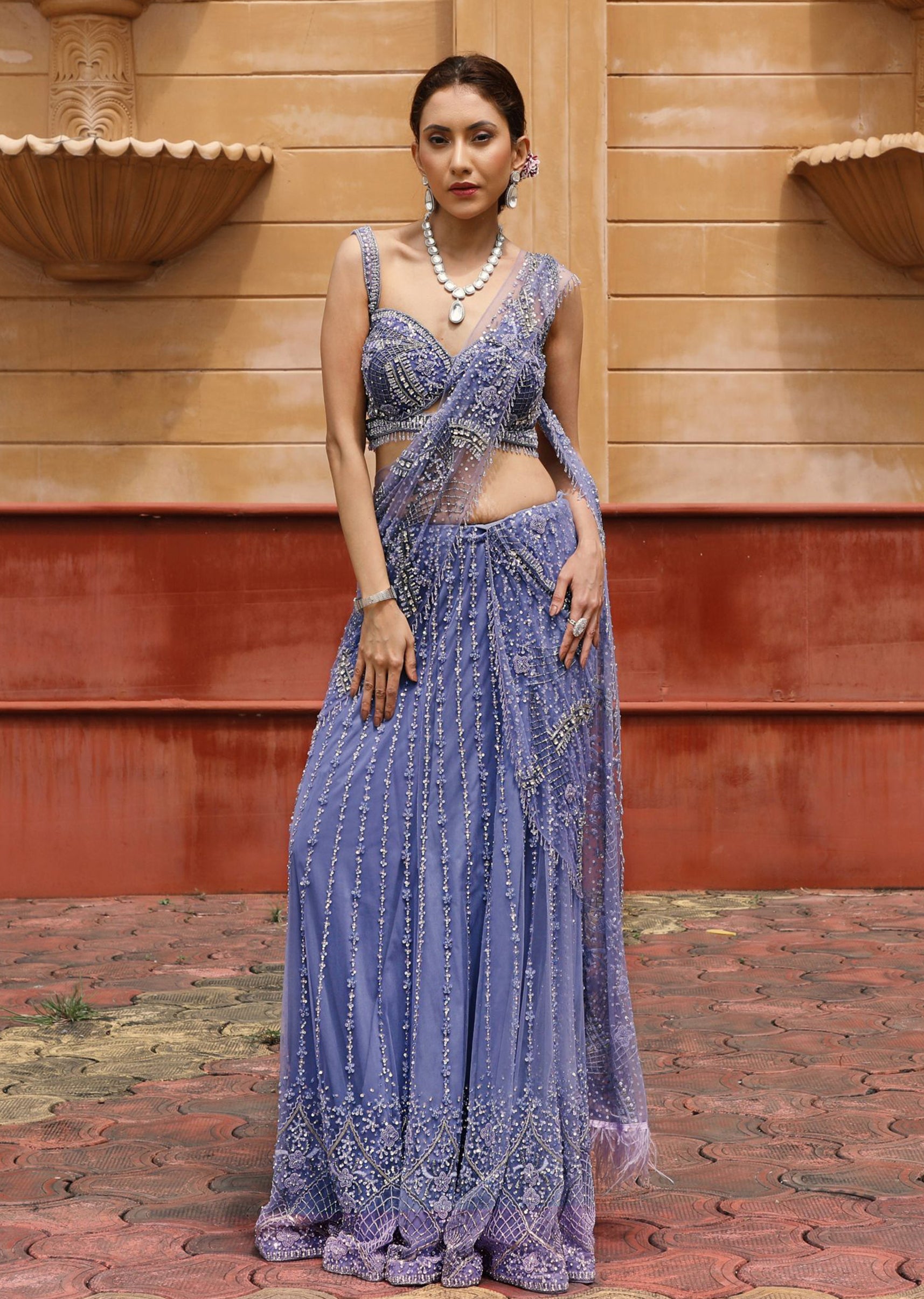 This lilac lehenga saree exudes grace with its intricate beadwork and attached drape dupatta, creating a seamless ensemble that blends tradition with contemporary flair. The soft hue of lilac adds a touch of romance, making it the perfect choice for a sophisticated soirée or special occasion.