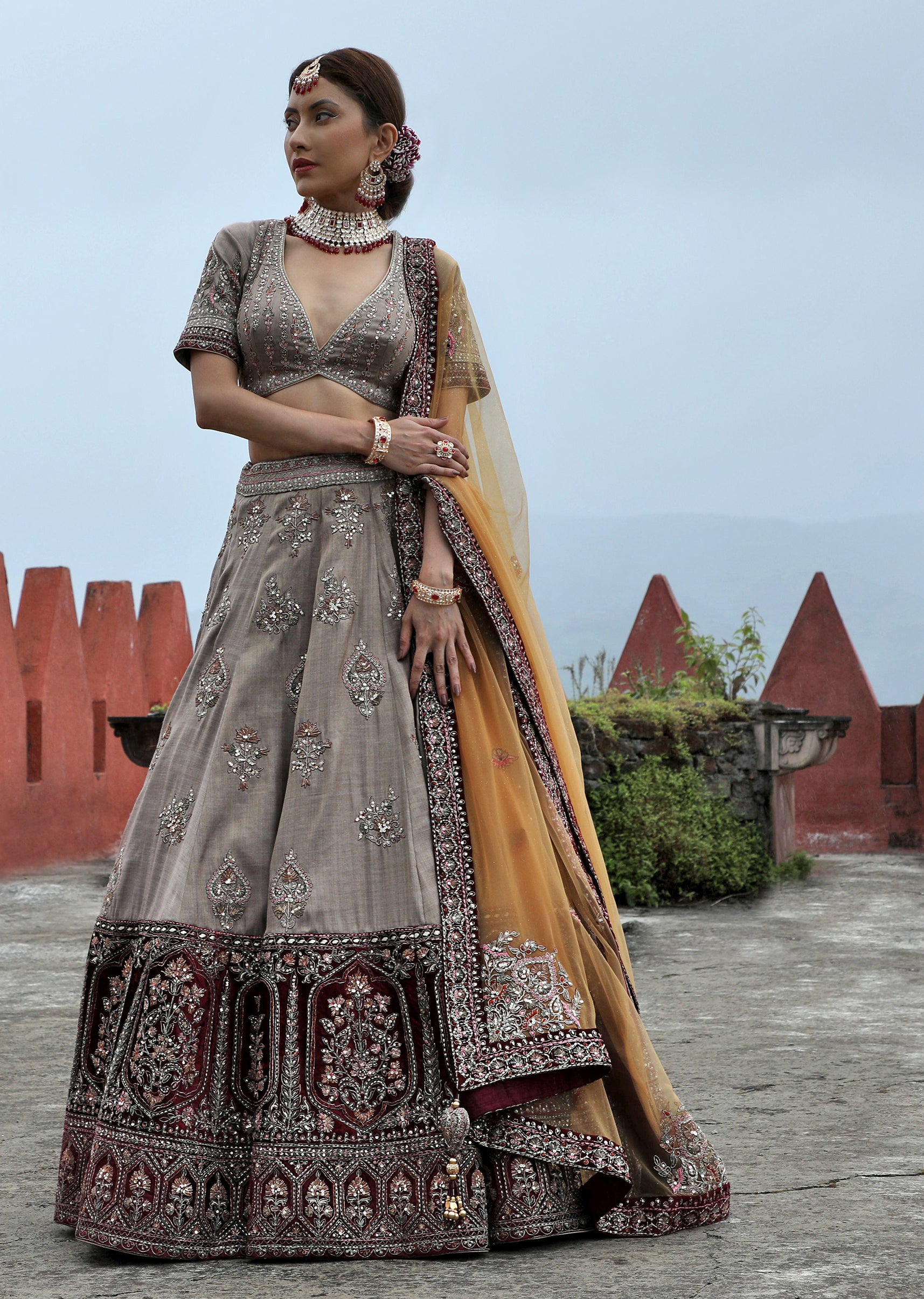 This antique tissue lehenga, adorned with a maroon velvet border intricately embellished with zari and resham embroidery, exudes regal elegance. Its rich textures and exquisite detailing evoke a sense of royal allure, making it a captivating choice for any grand occasion.