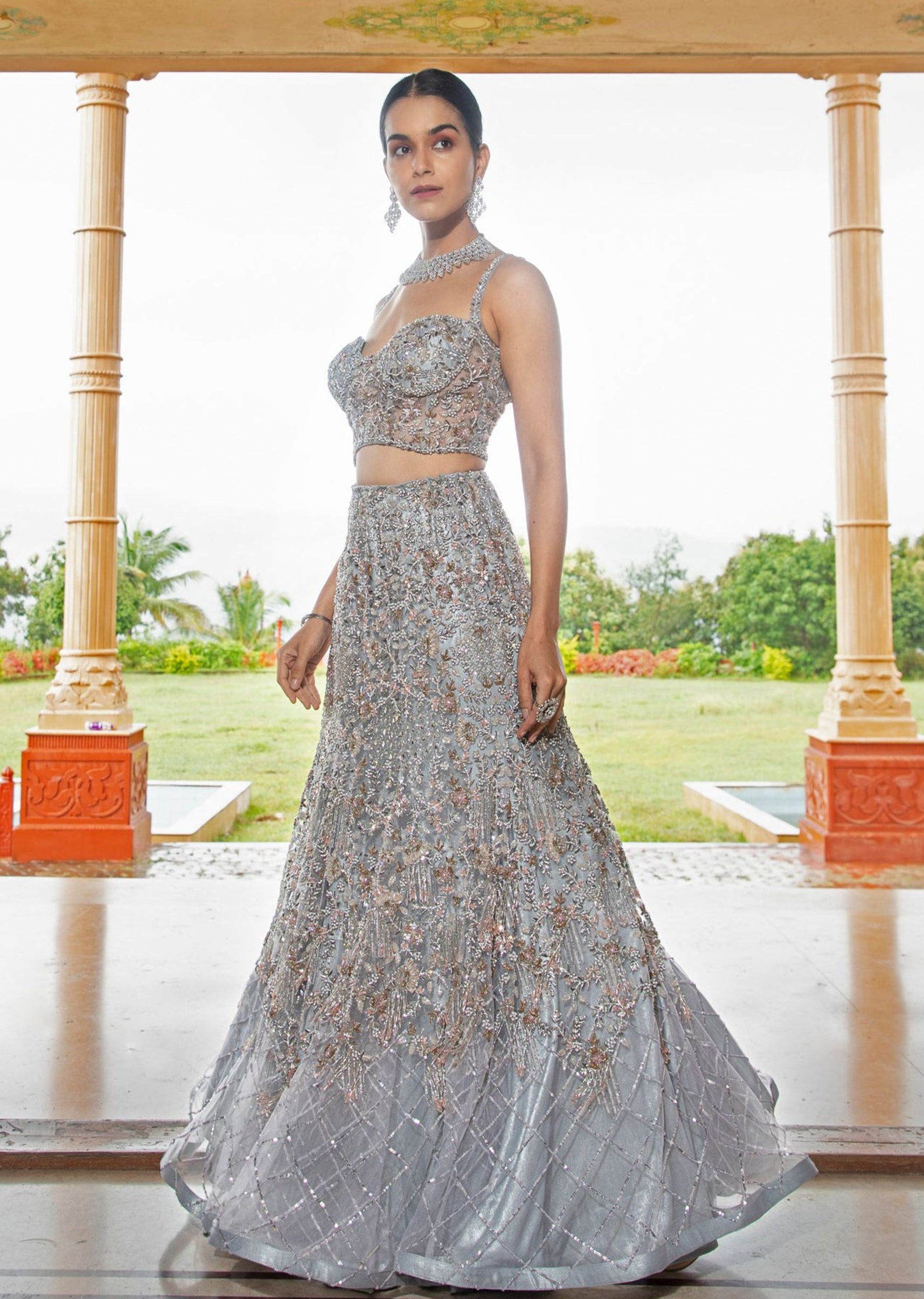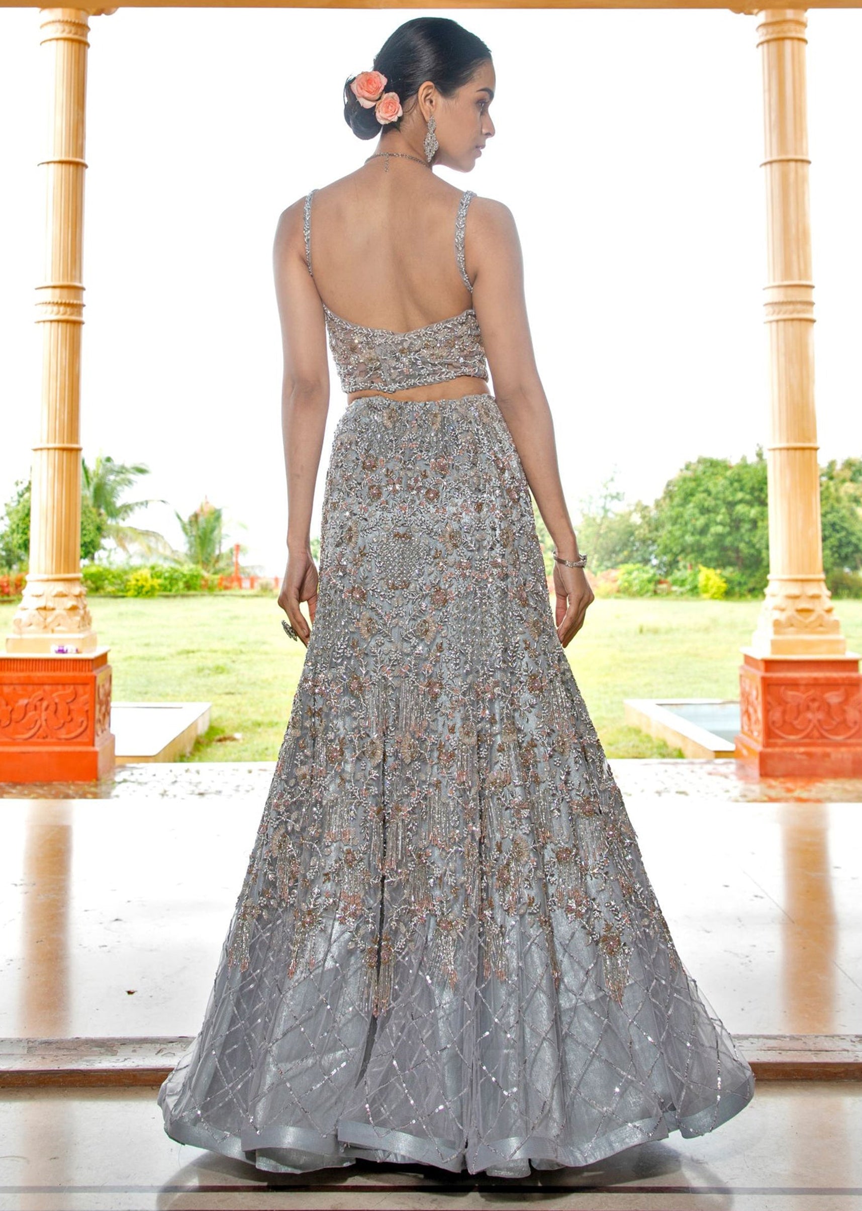 Effortlessly elegant, this Mermaid style grey lehenga features a corset top and cape adorned with intricate self and peach crystal embroidery, exuding sophistication and charm. The fusion of traditional design with contemporary flair makes it a stunning choice for any special occasion.