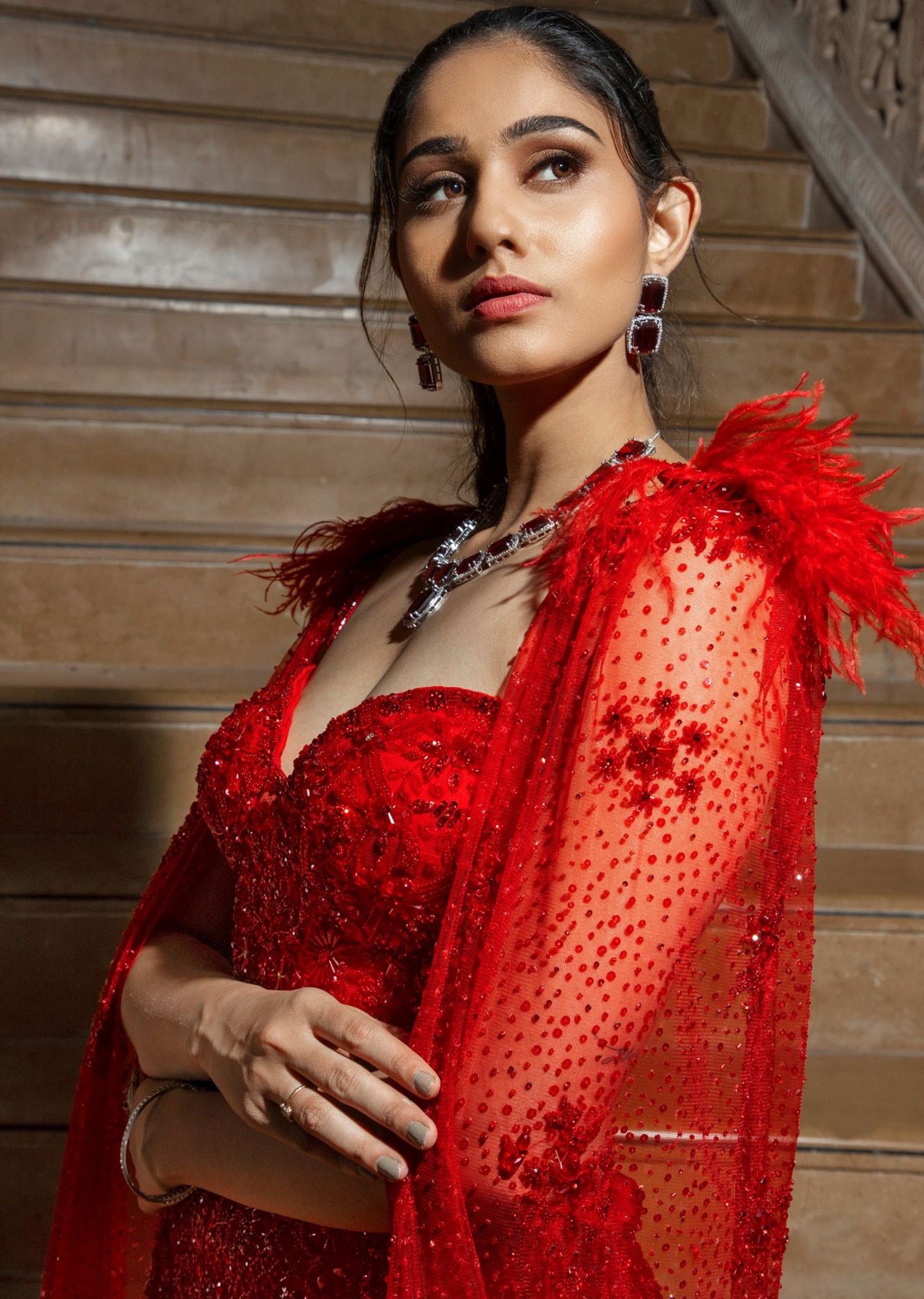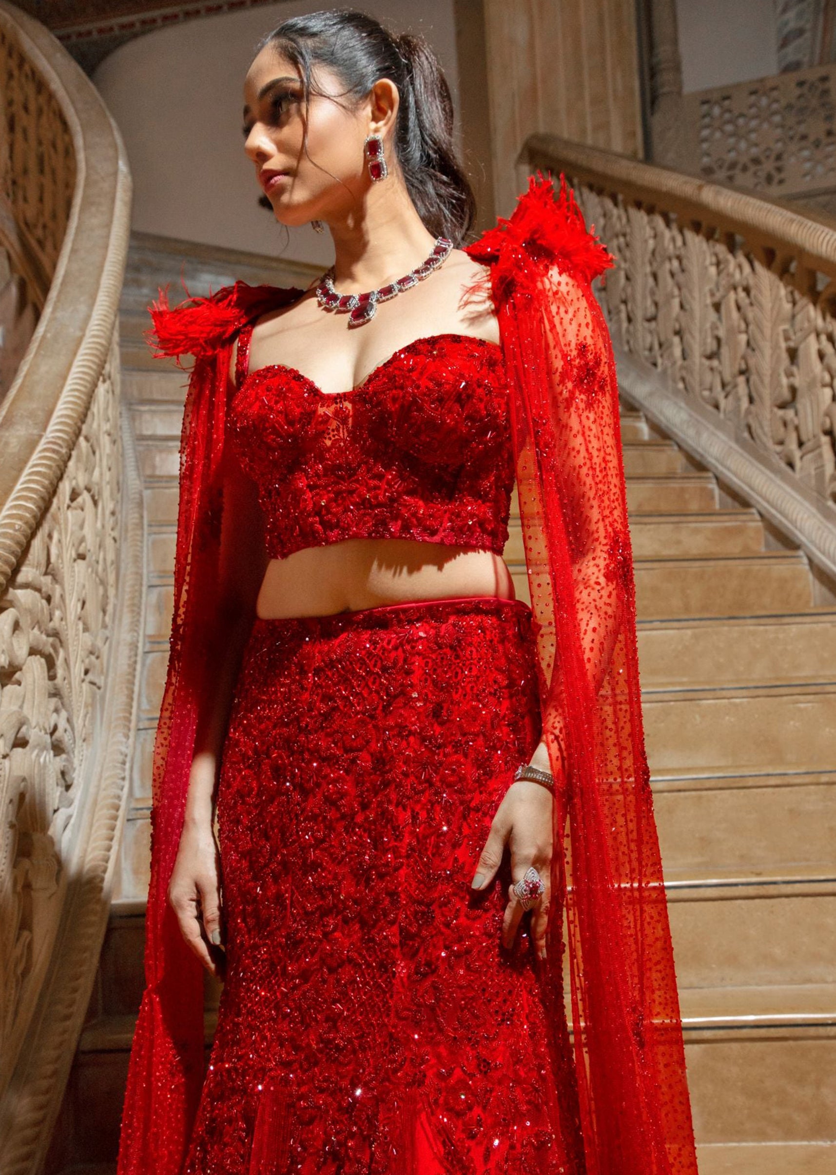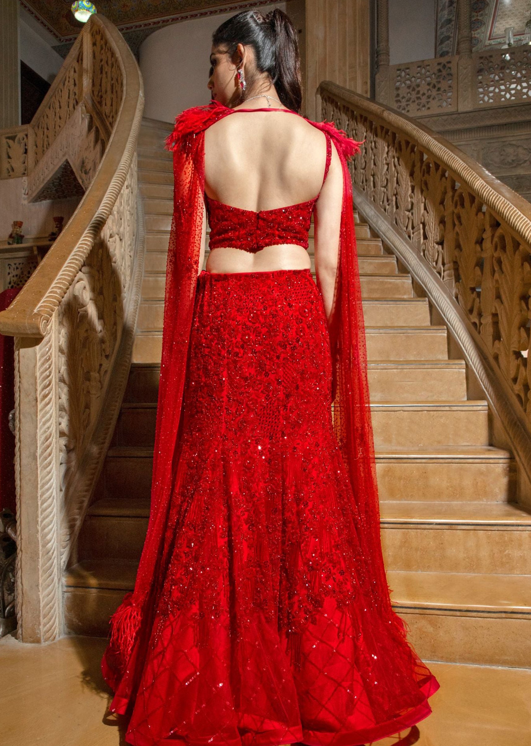 Bold and alluring, this ensemble features a striking red mermaid skirt paired with a captivating corset spaghetti top adorned with self-embroidery and delicate feather accents. Complete with a draped dupatta, this outfit exudes elegance and charm, perfect for making a dramatic entrance at any event.