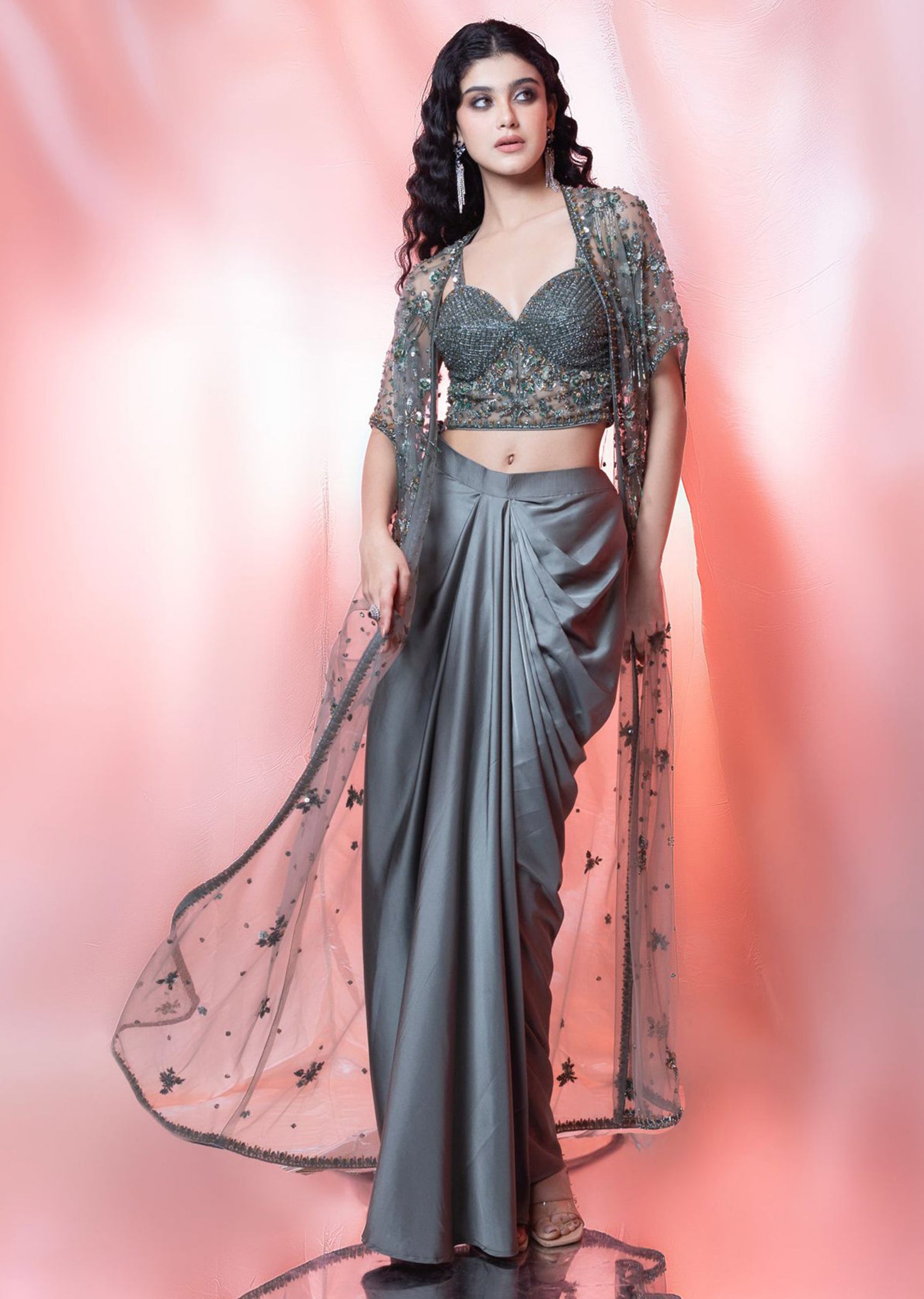Olive Green Pre Stitched Drape Skirts With Choli And Cape In Self And Antique Crystal Embroidery