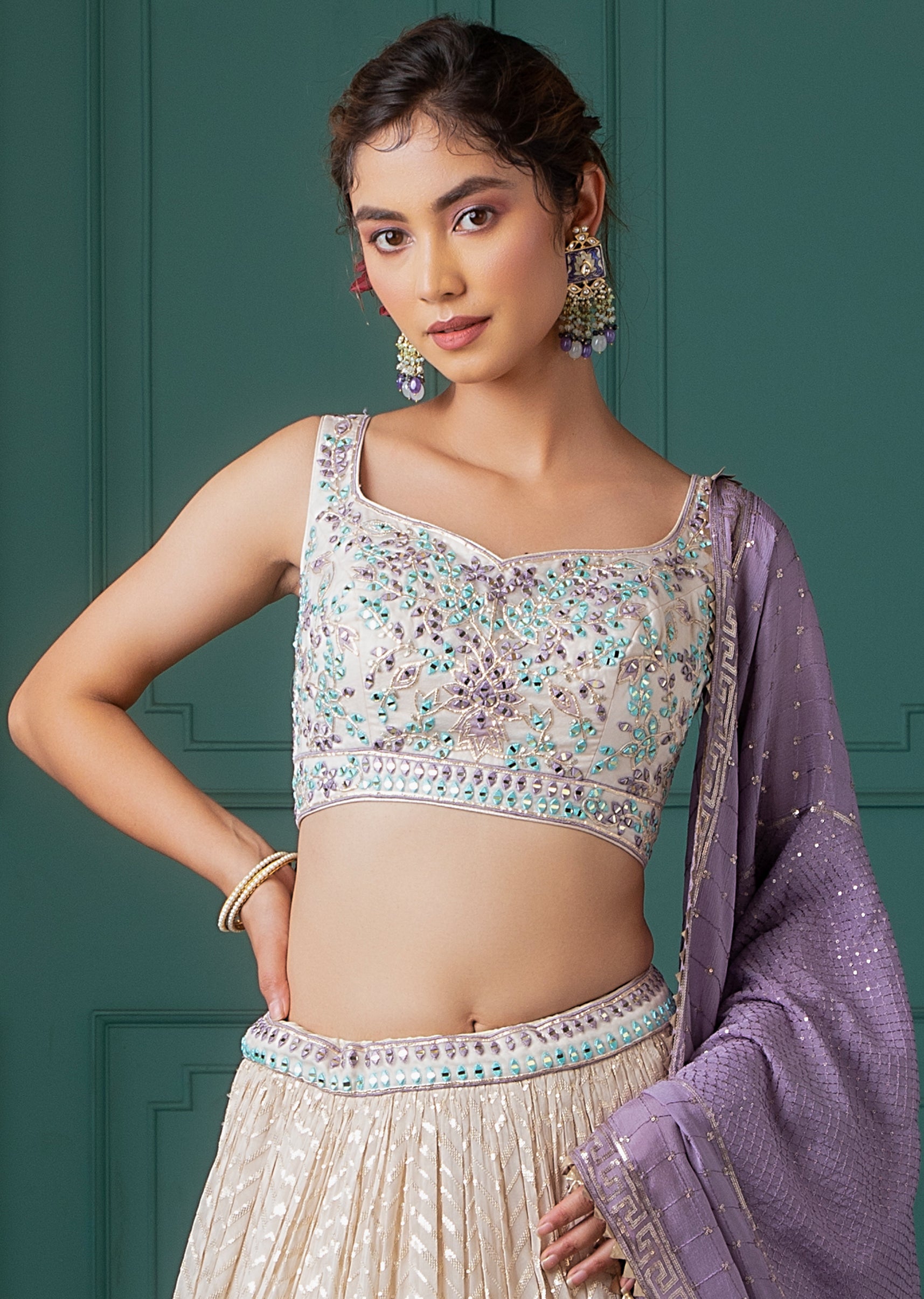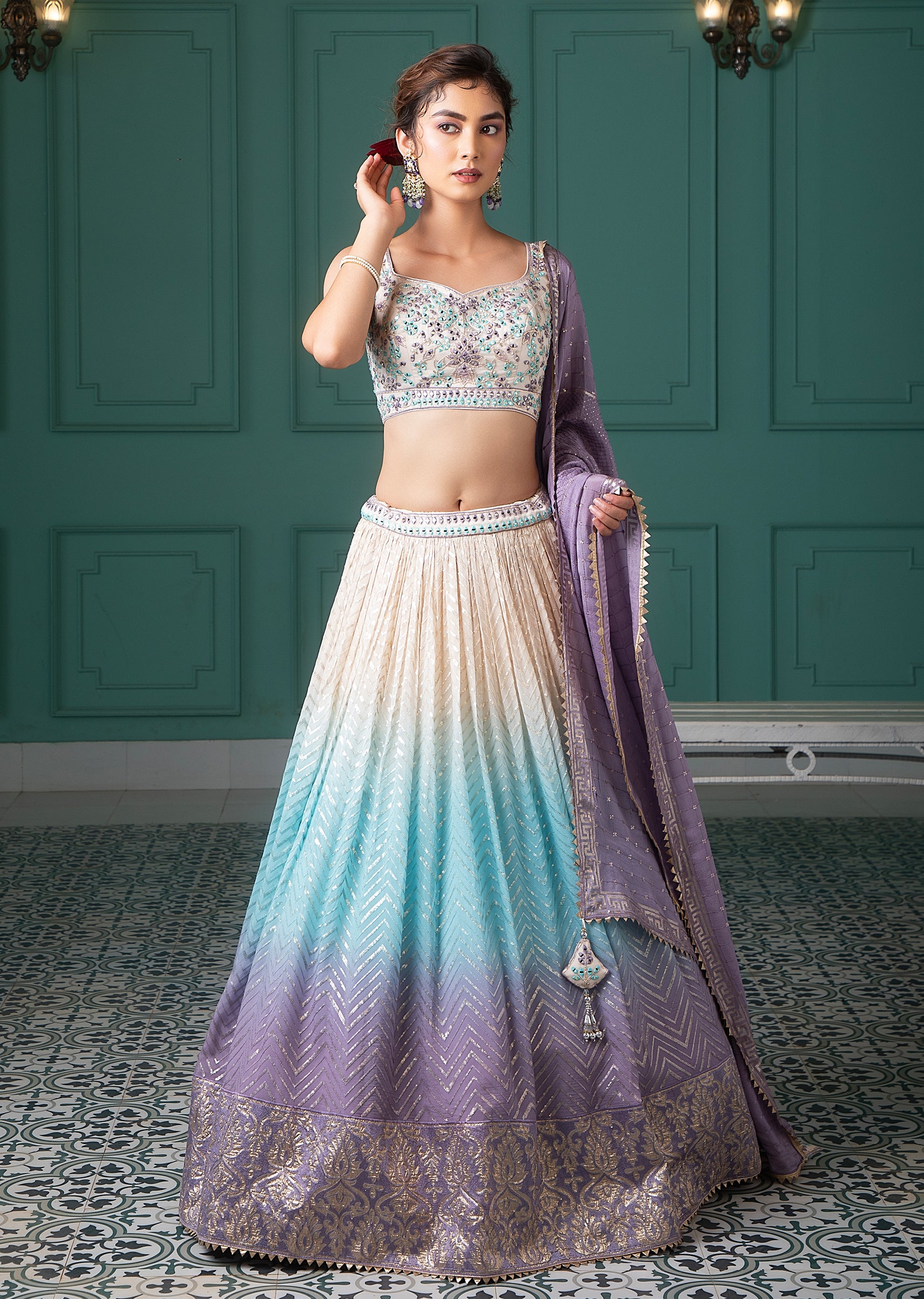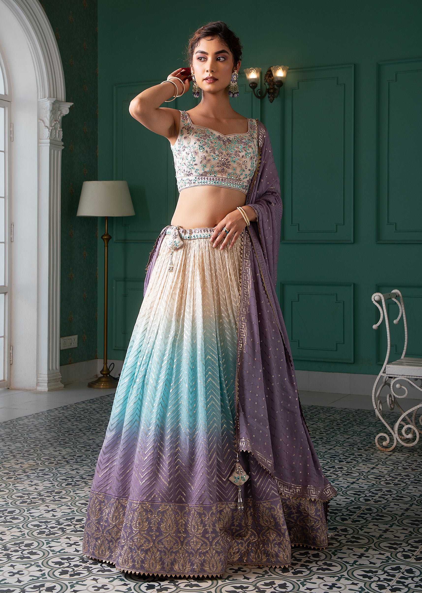 Ivory blouse, pastel threads, and mirror work, paired with the shaded kali skirt and a lavender texture dupatta adds a touch of opulence and serves as a beautiful accent.