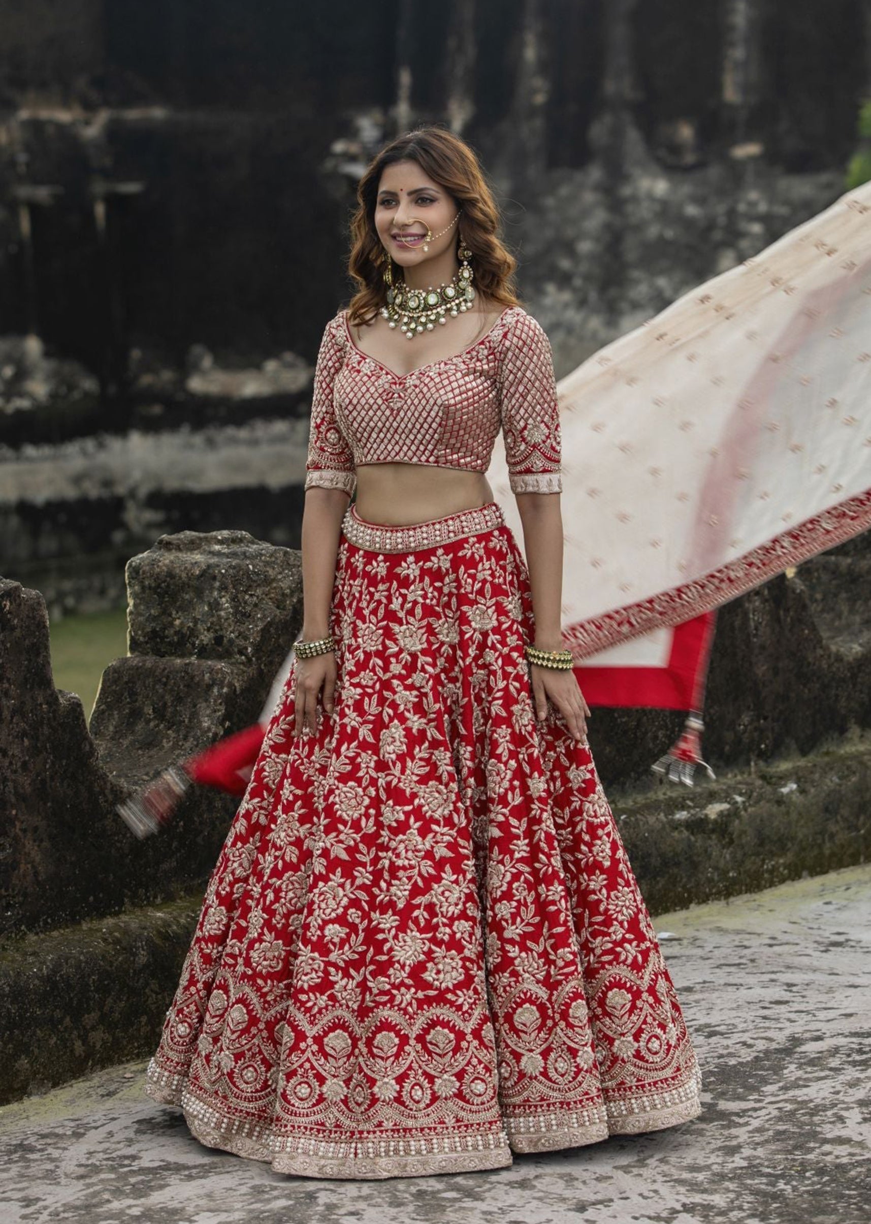 Red raw silk Lehenga choli set with zardozi embroidery and self work made in floral motifs along with a net dupatta