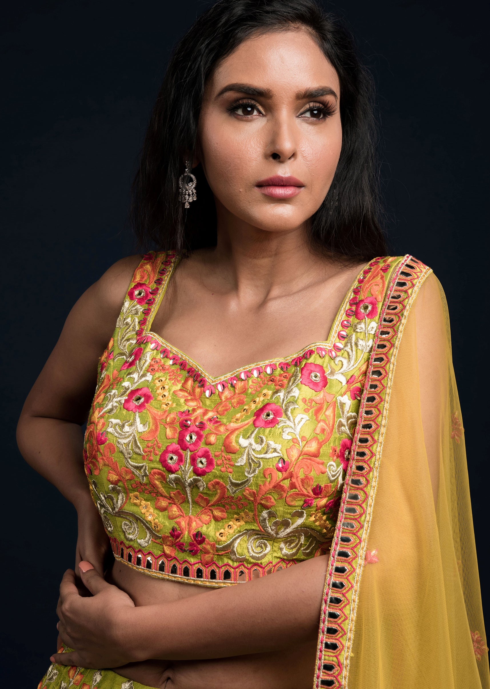 Lime green raw silk lehenga choli with multi-colored floral resham bagh embroidery; and pastel yellow dupatta.